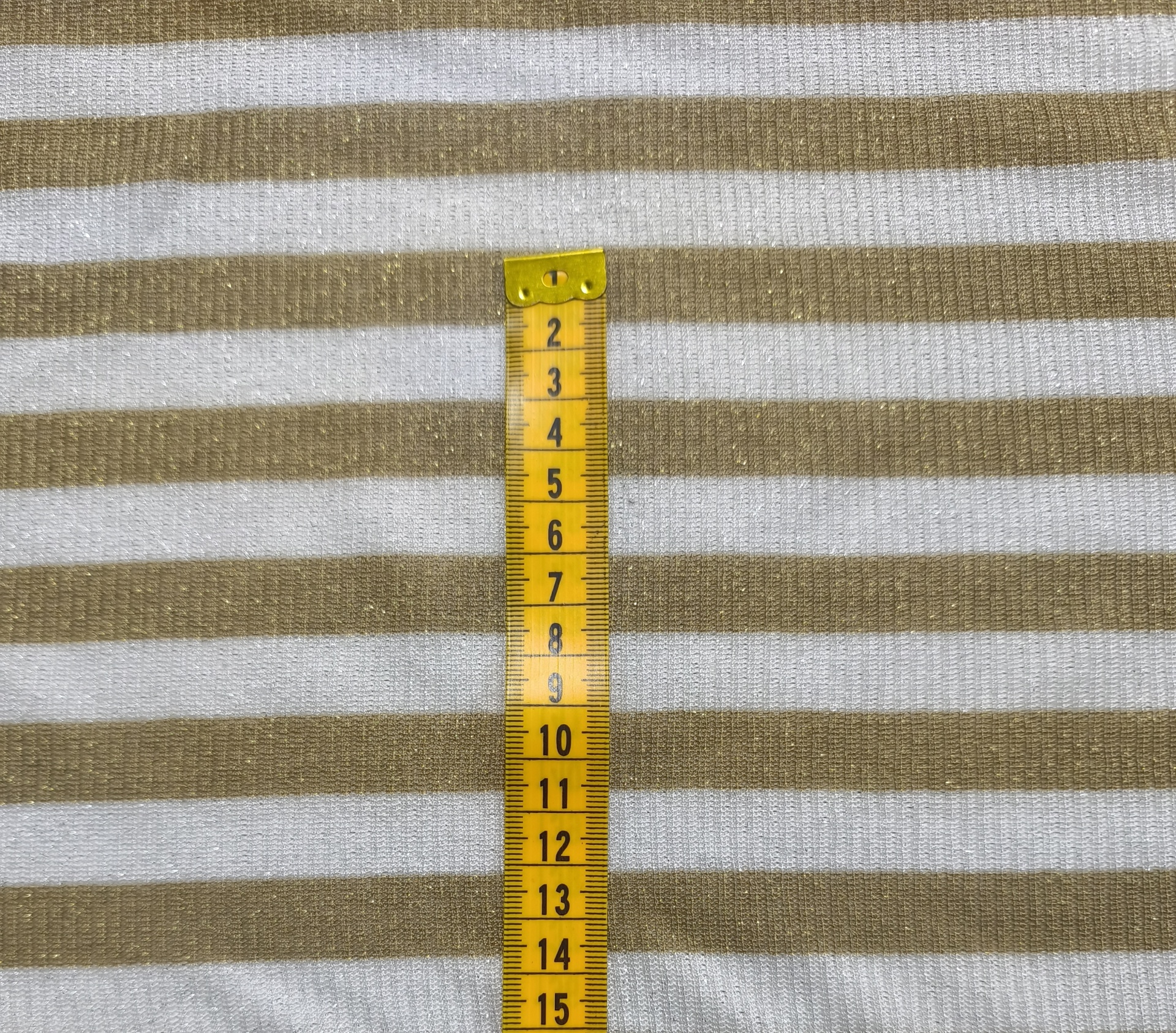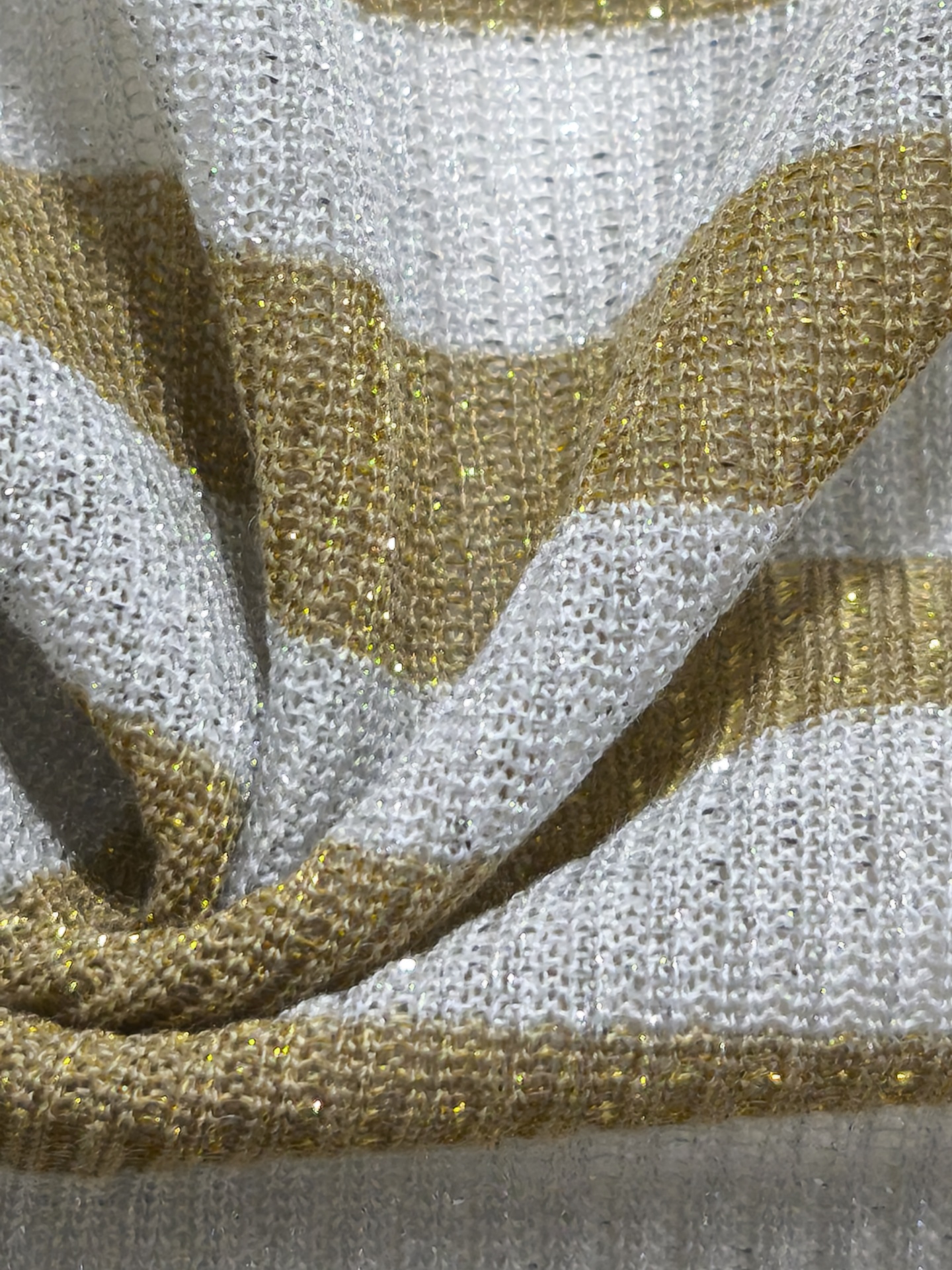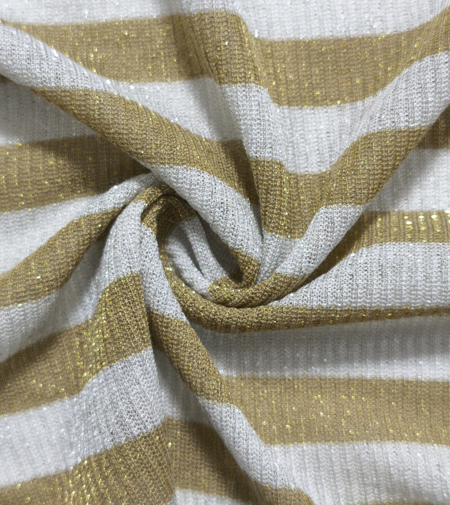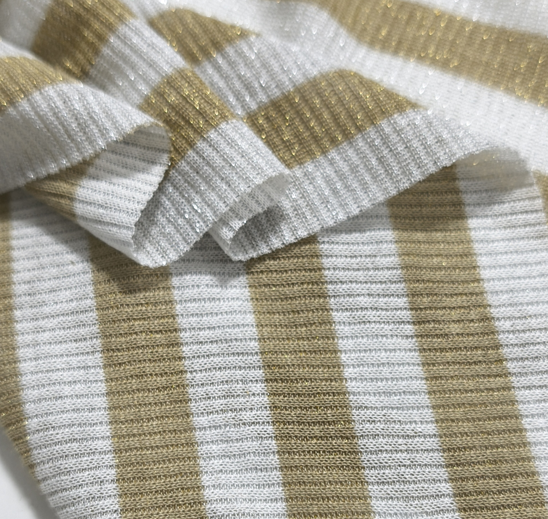 Malha canelada tom cinza muito clarinho, tem bege com brilho dourado, maleável, fresca, alguma elasticidade, bom caimento