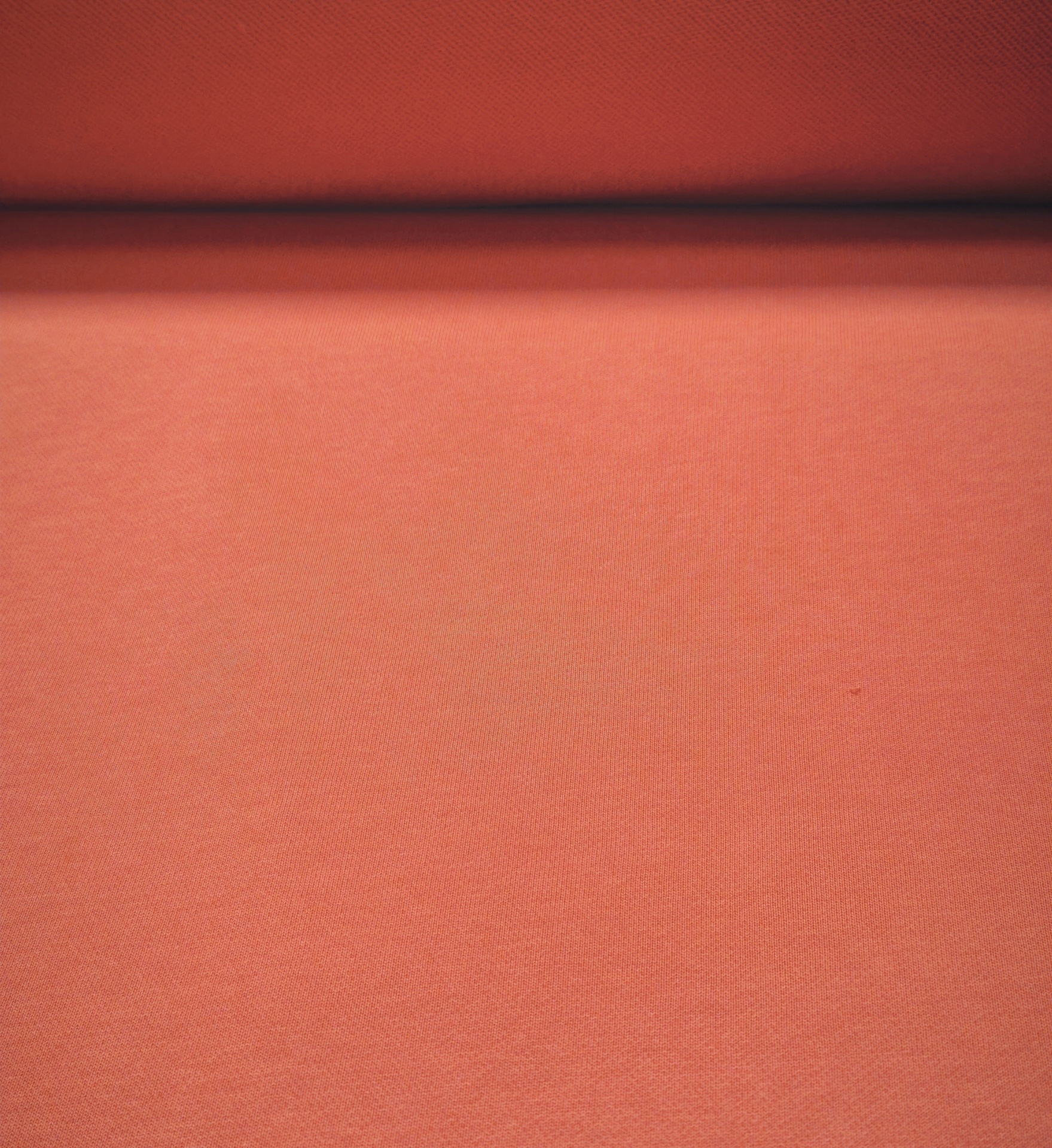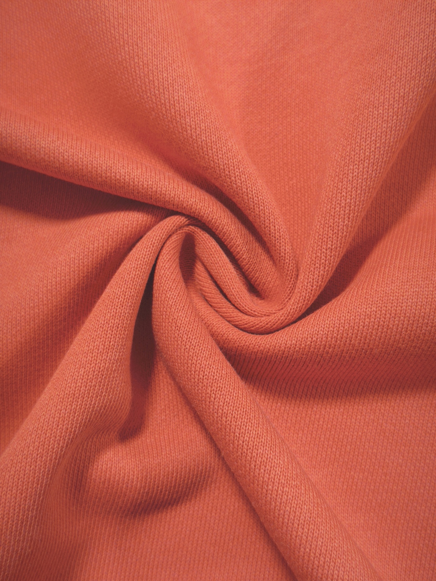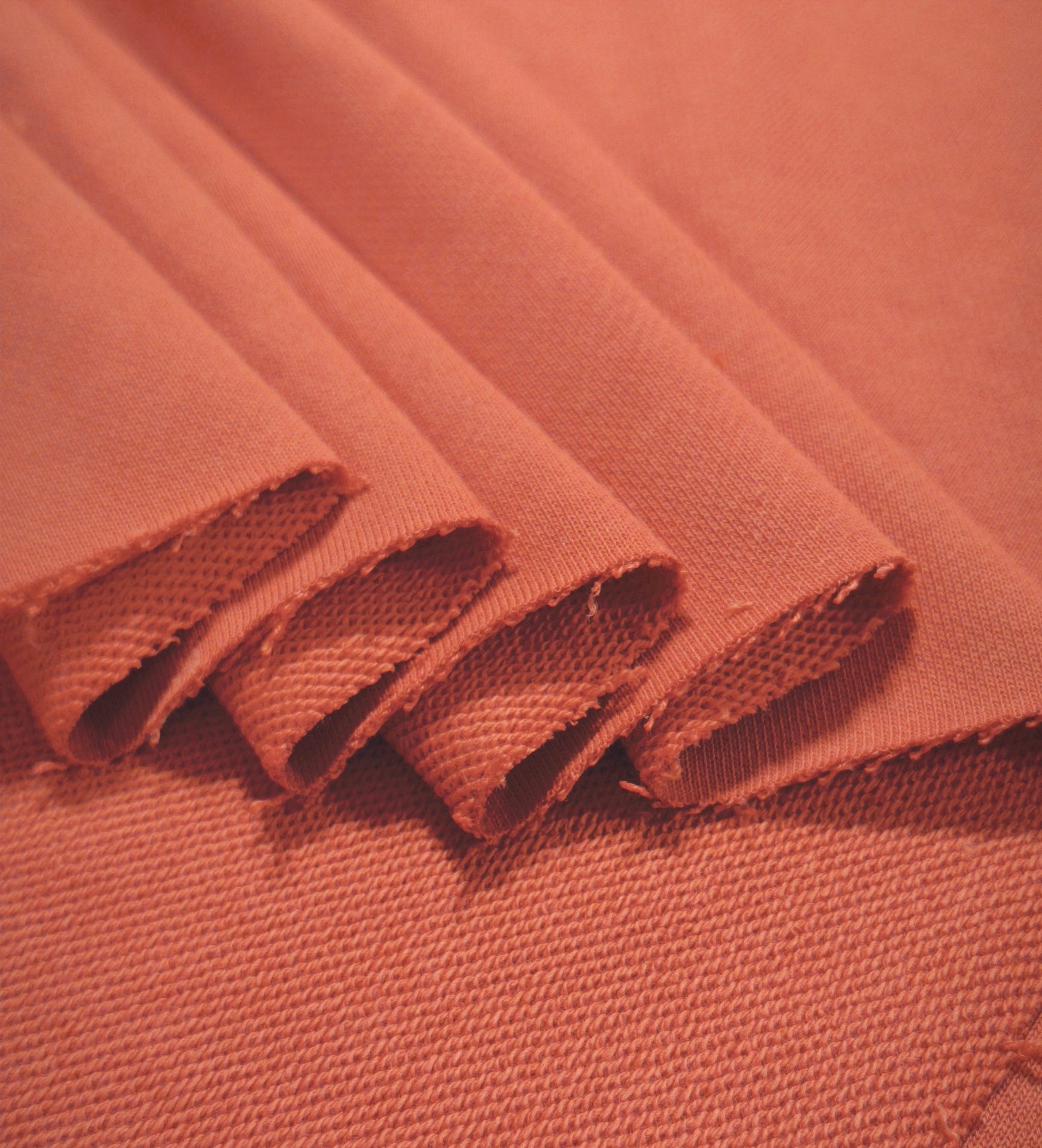 Malha de tom tijolo, macia, sem carda, bom caimento e toque agradável