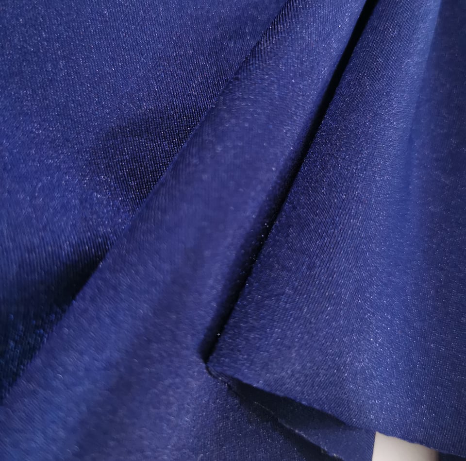 Malha de licra com muito boa elasticidade em todos os sentidos, de boa qualidade, ligueiramente brilhante