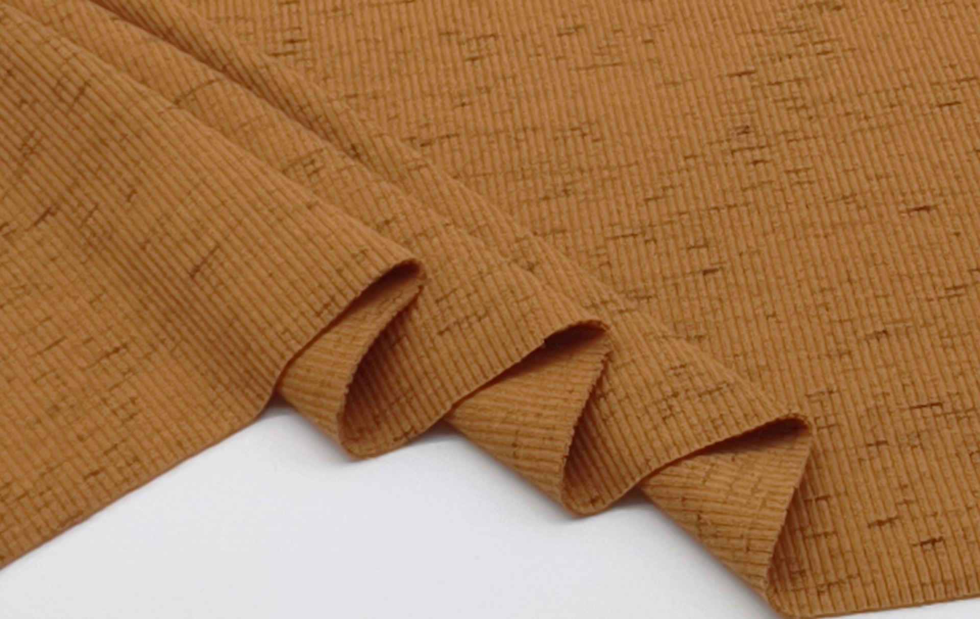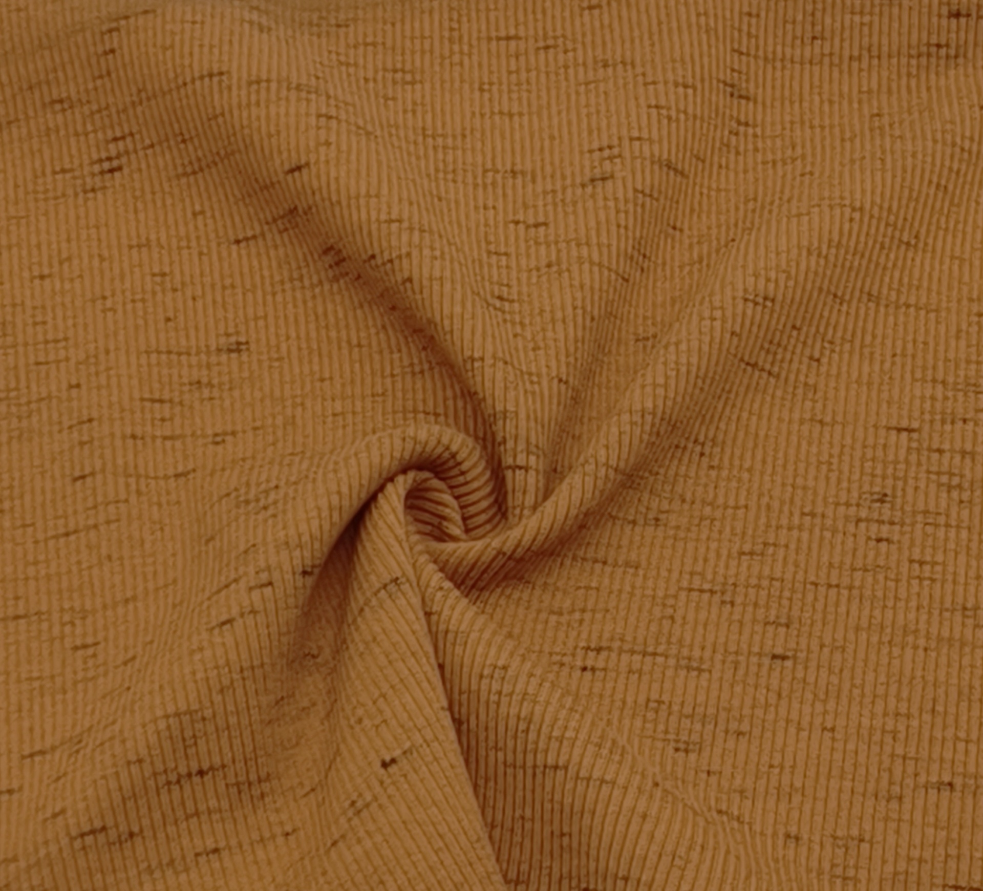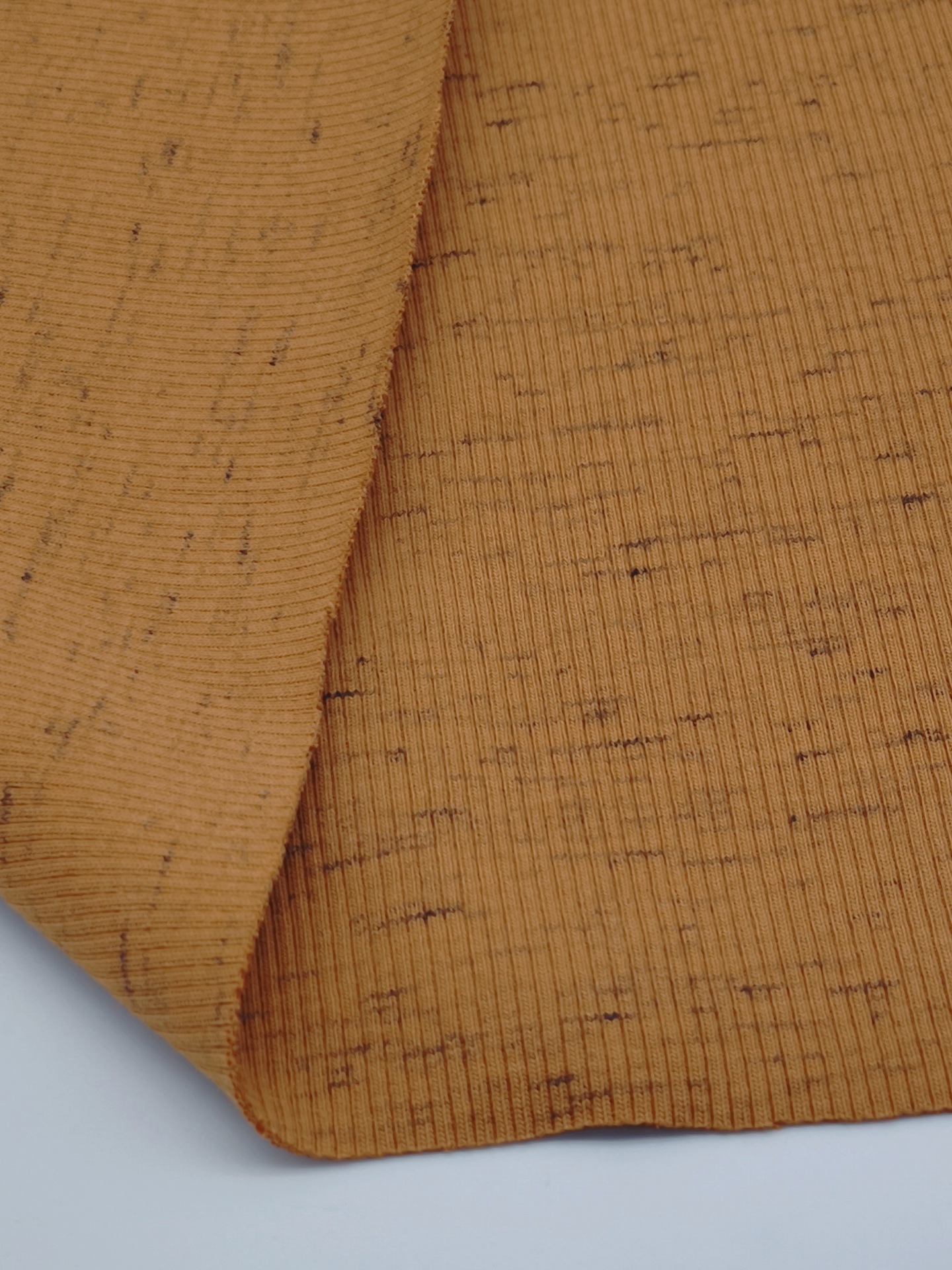 Malha canelada com elasticidade e flexibilidade, mesclado em tons de preto, cor opaca, sem brilho, macia, bom toque, peso médio