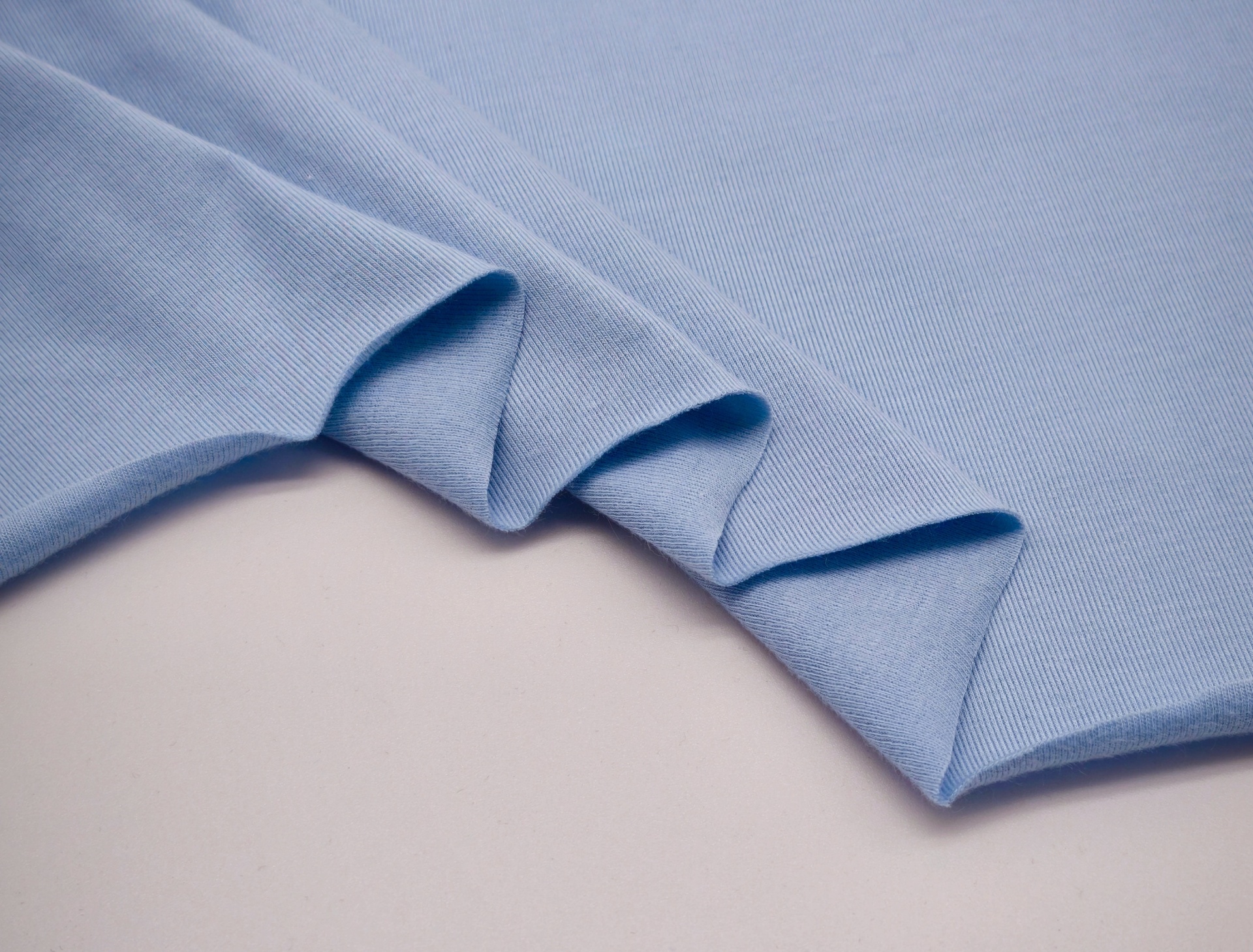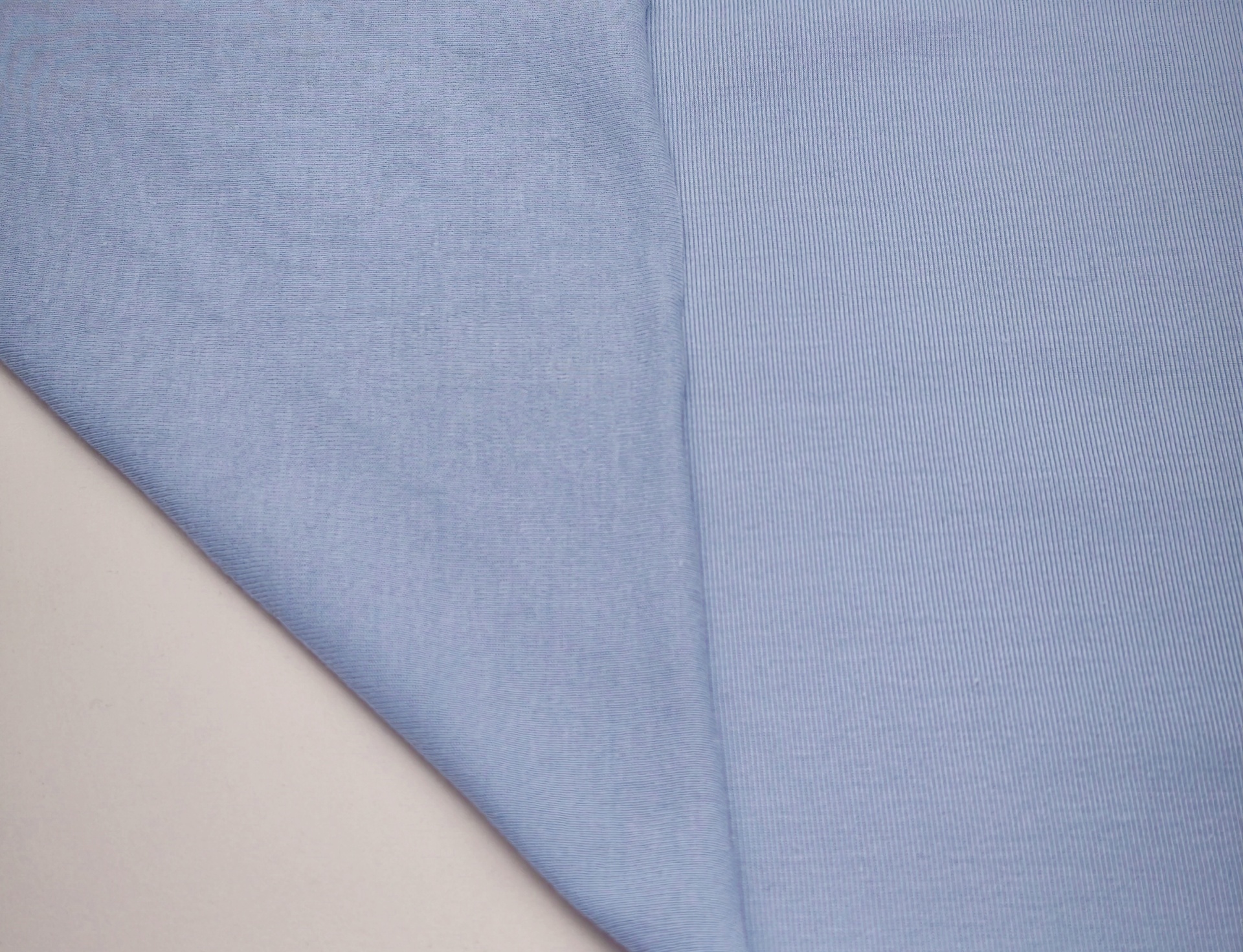 Malha rib fina, macia, confortável, boa elasticidade, cor opaca, sem brilho
