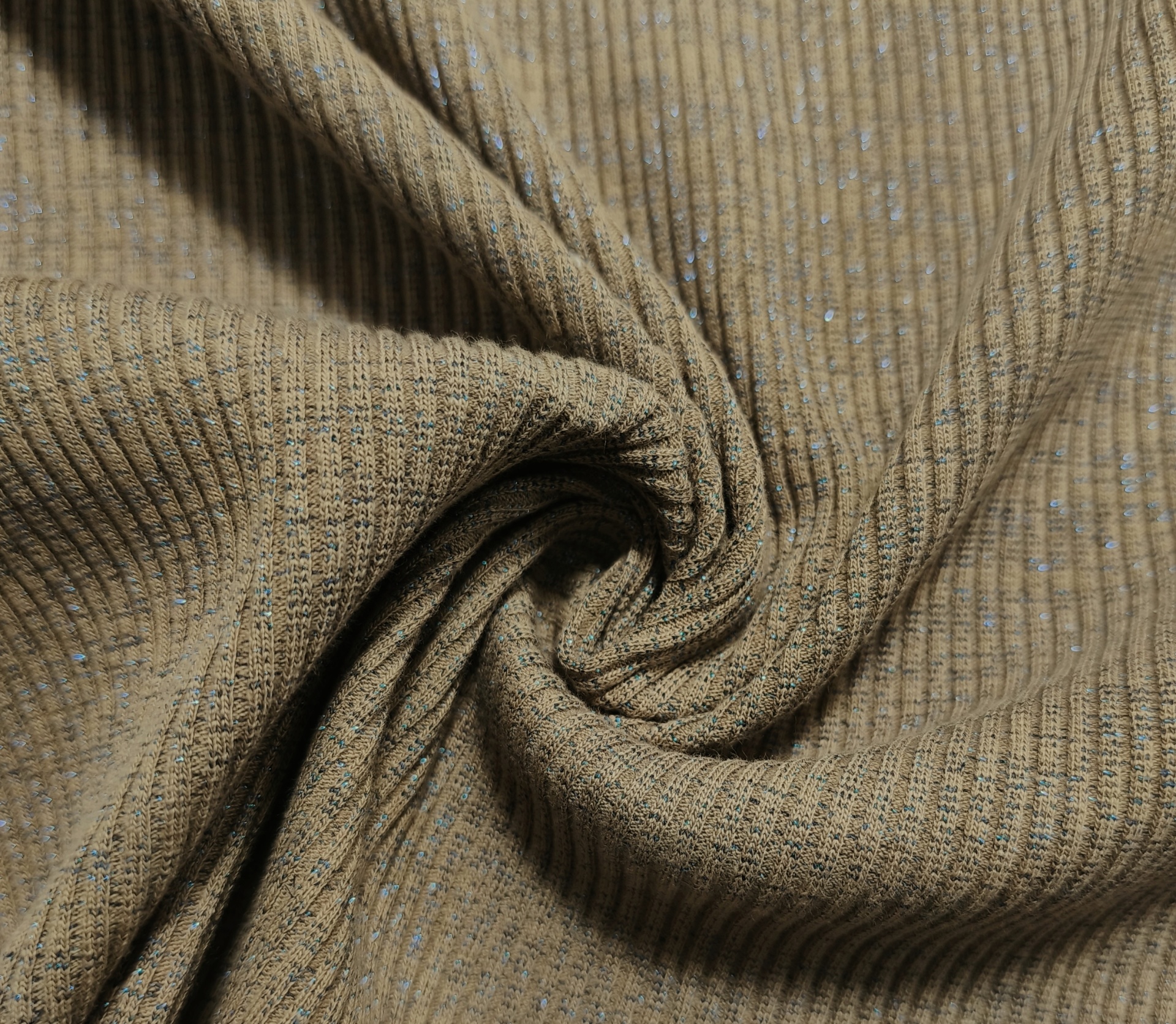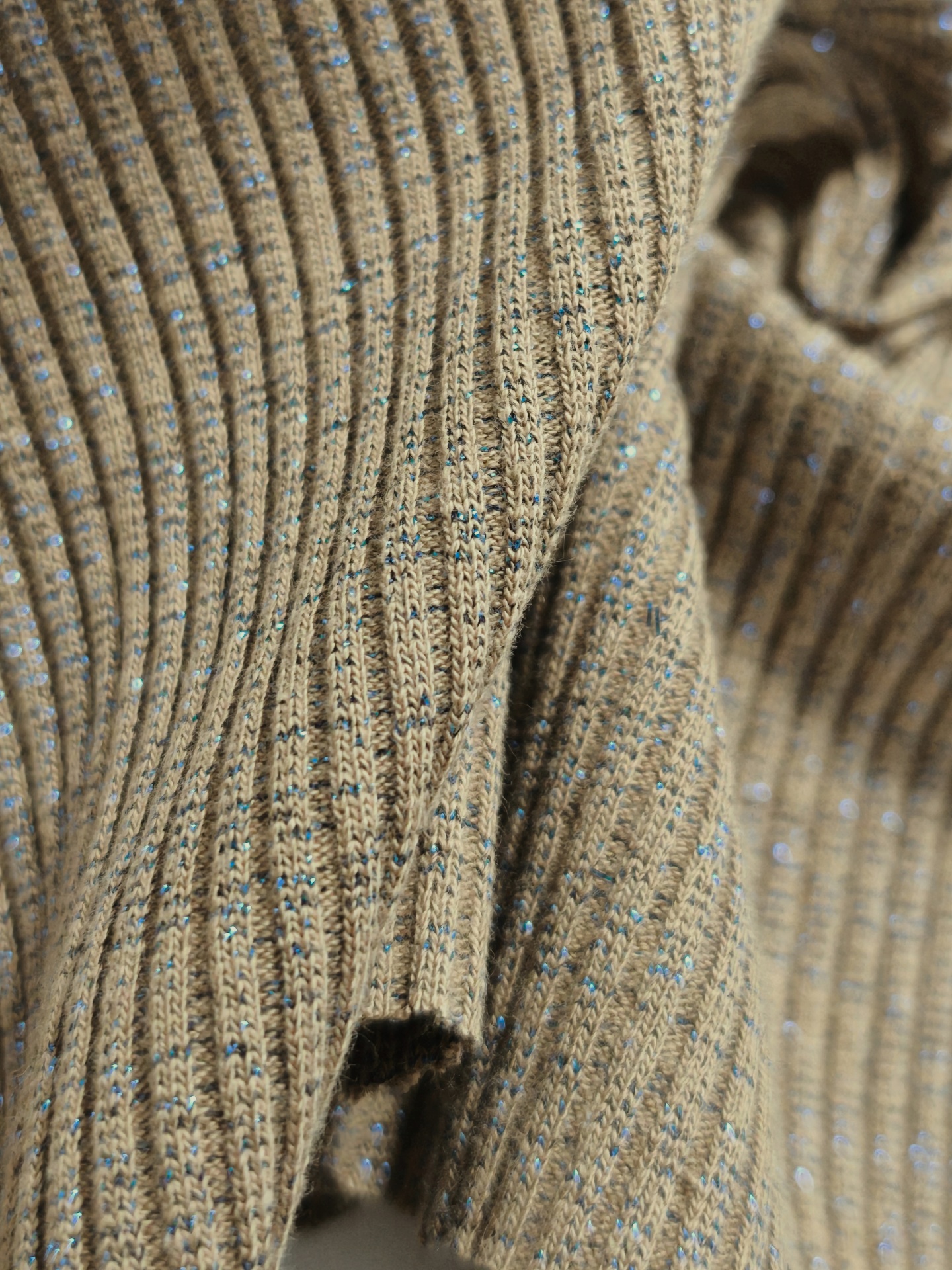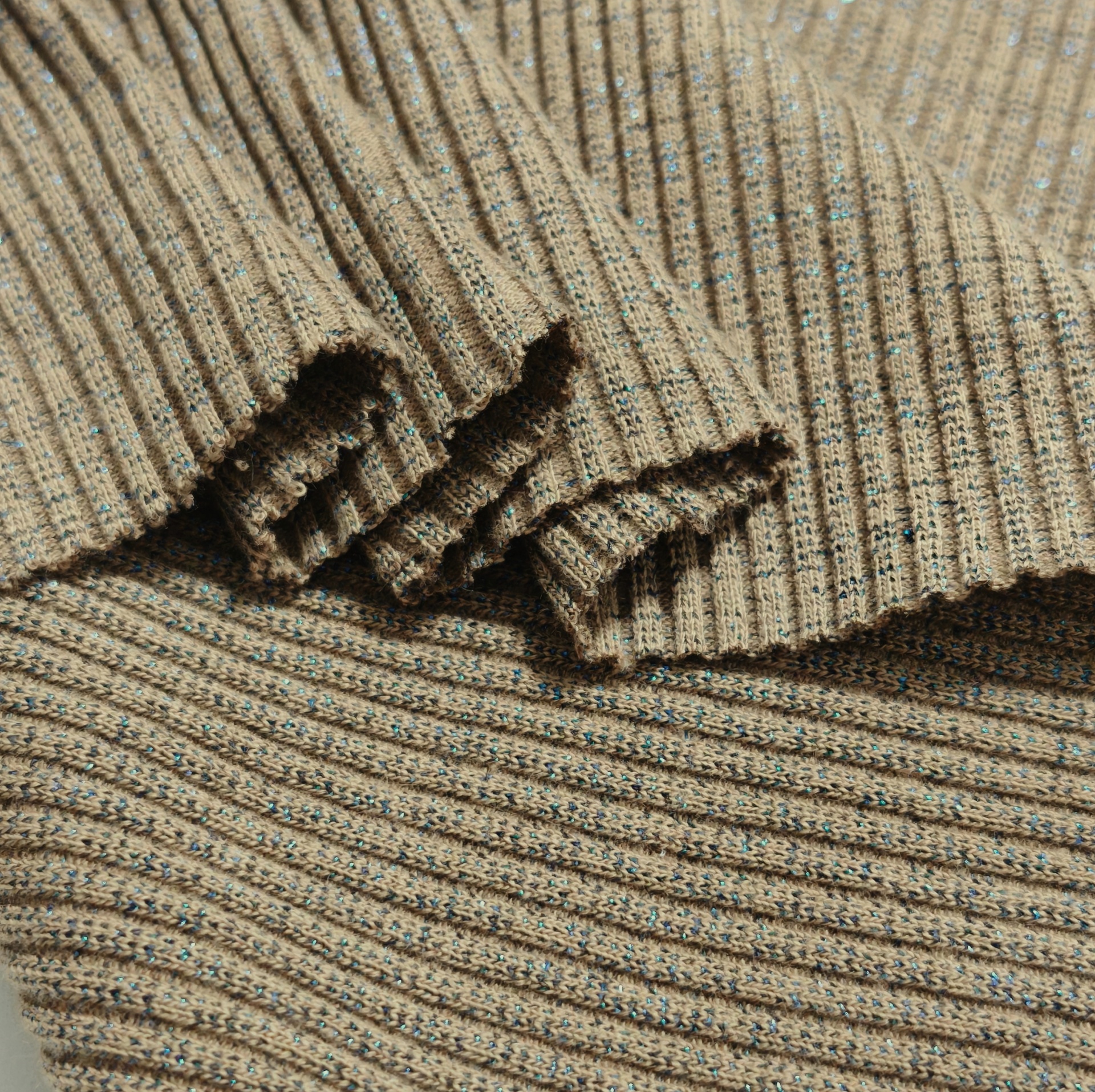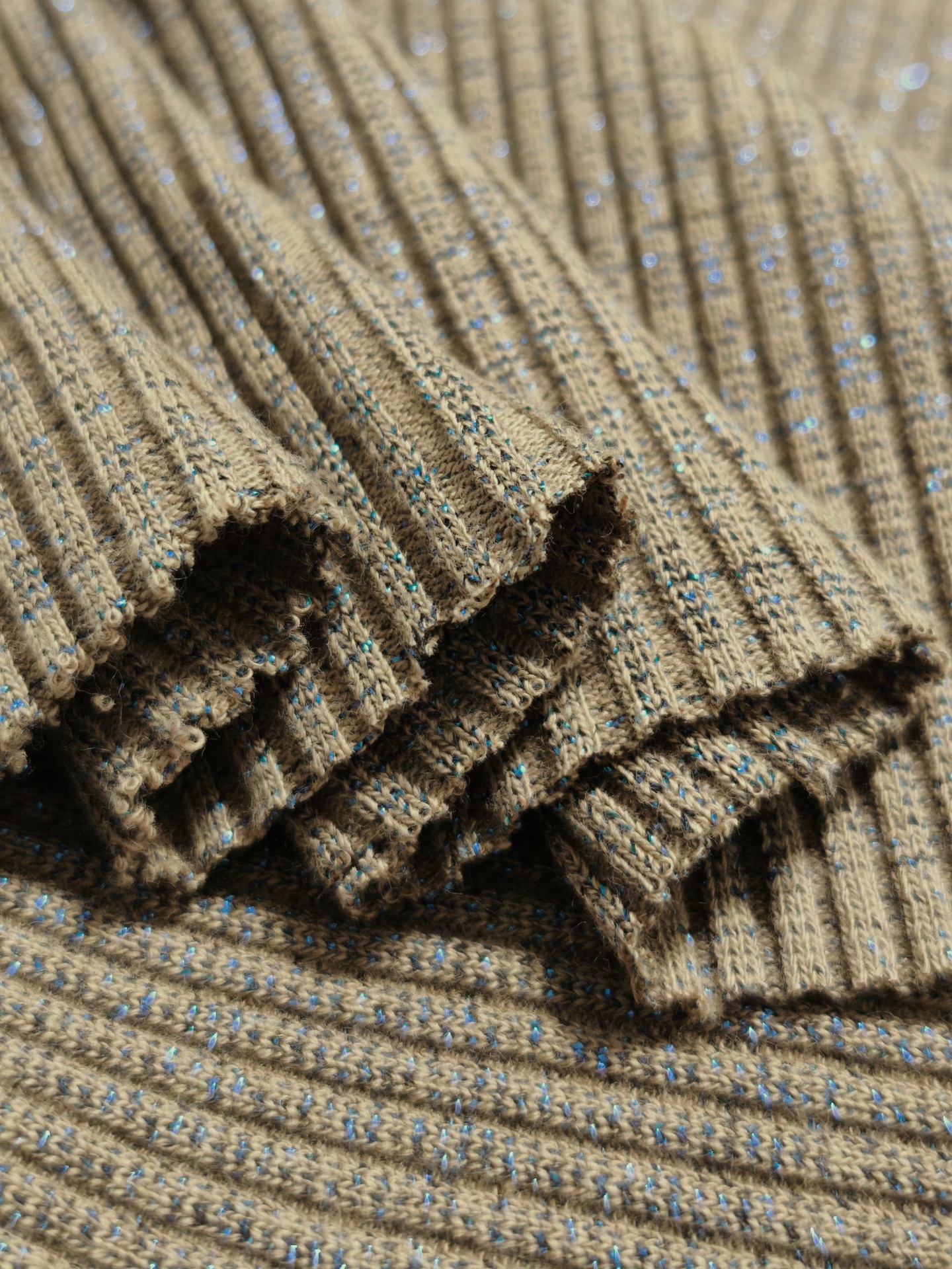 Malha canelada tom acastanhado com brilho azulão, maleável, boa elasticidade, bom caimento, sem transparência