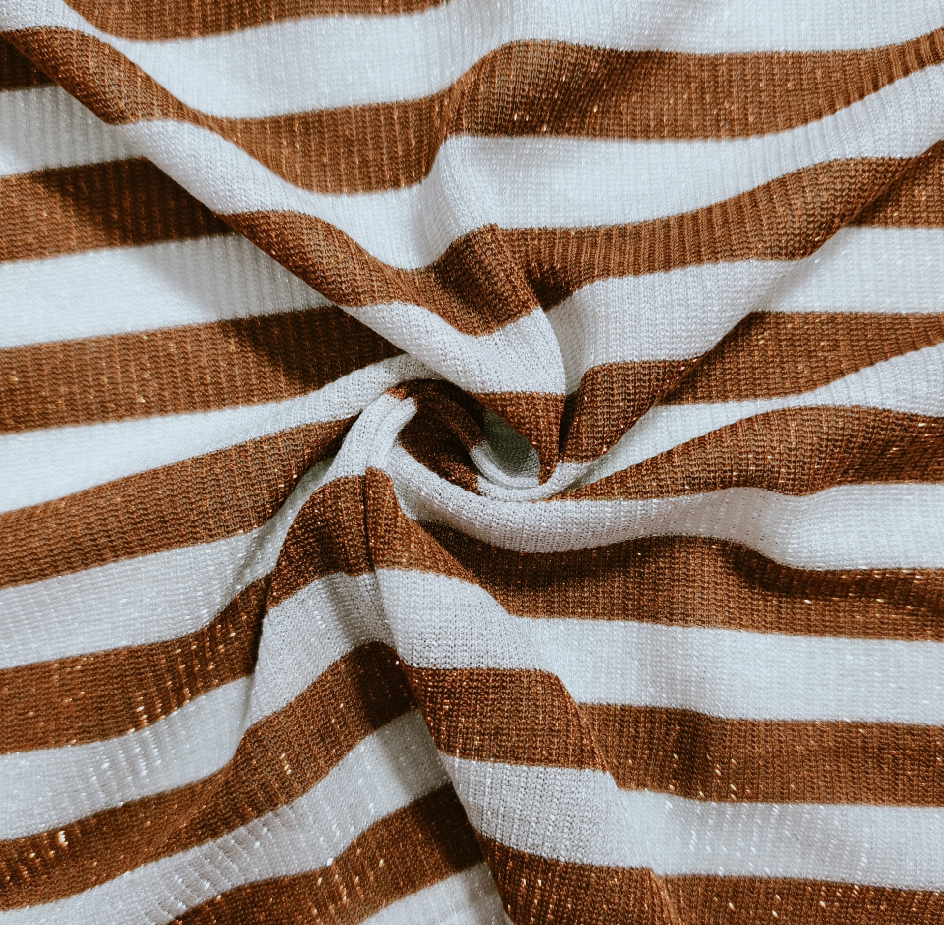 Malha em tom cinza claro e avelã, com brilho prata e avelã boa elasticidade, bom caimento, macia, maleável, fresca, fina