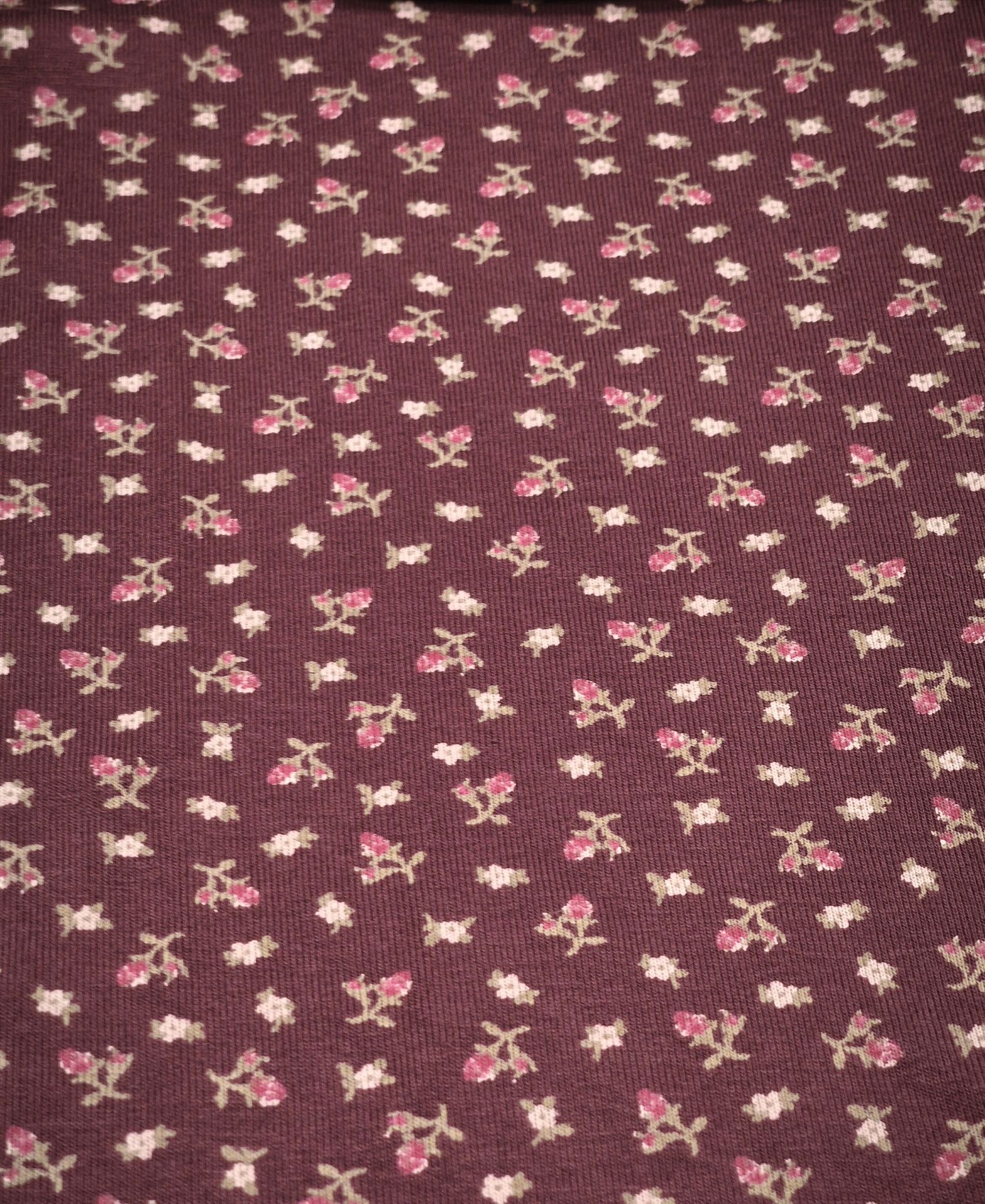 Canelado compacto, tom base cor de vinho, estampado em tons rosa claro, verde e rosa
