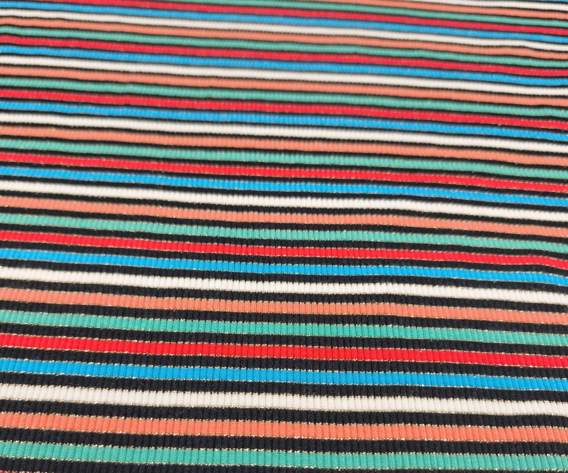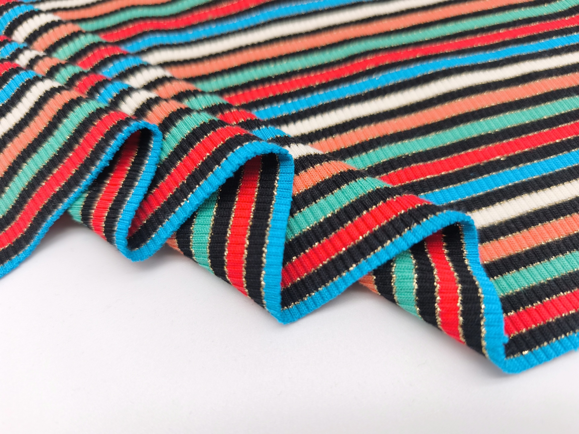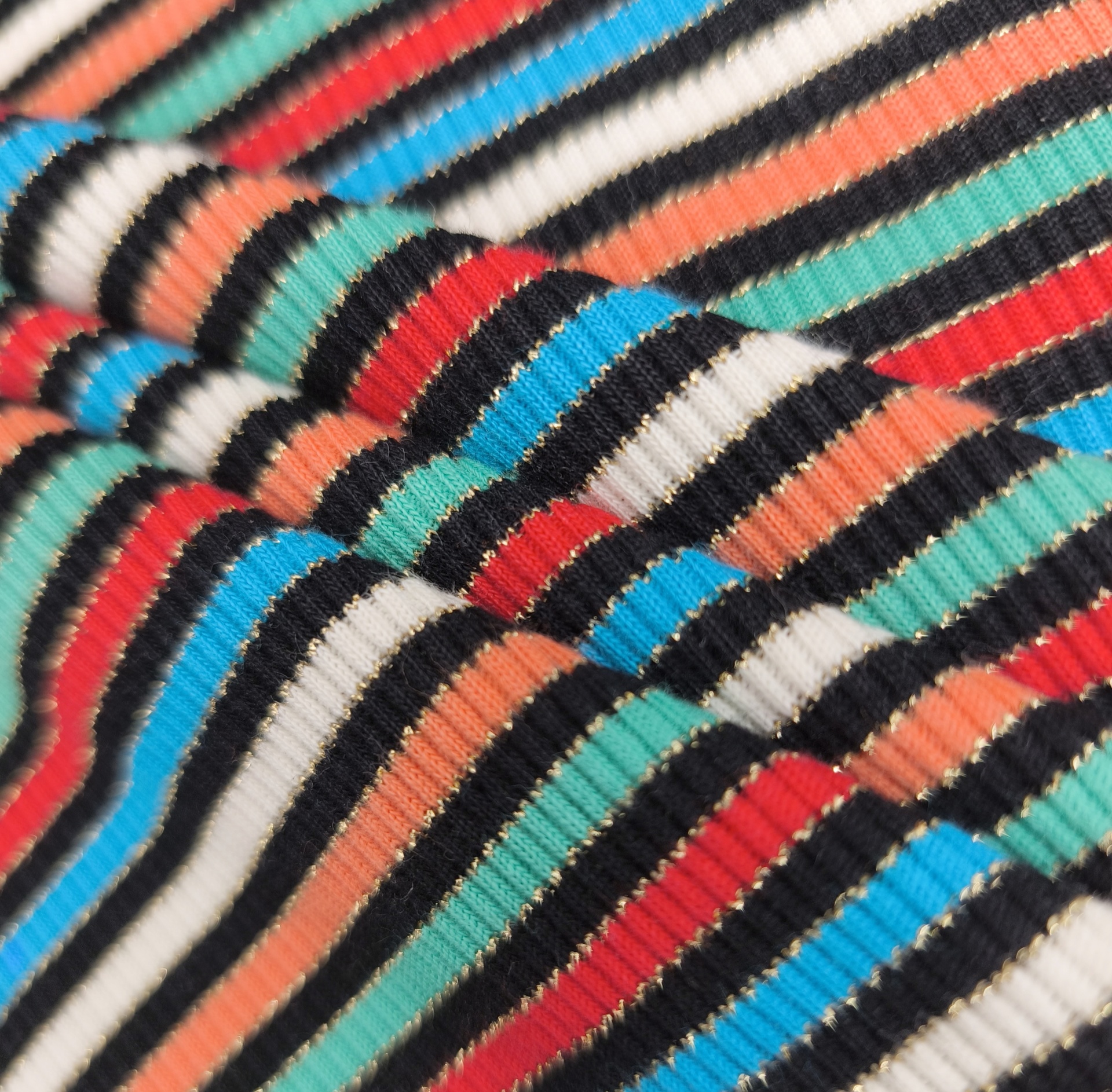 Malha rib com fios lurex de brilho dourado, esterib de riscas (branco, preto, verde, azul, vermelho, cor de laranja e dourado), apesar de não ter elastano/licra, tem elasticidade mecânica, tornando uma malha que pode ser usada justa ao corpo, maleável e bom caimento