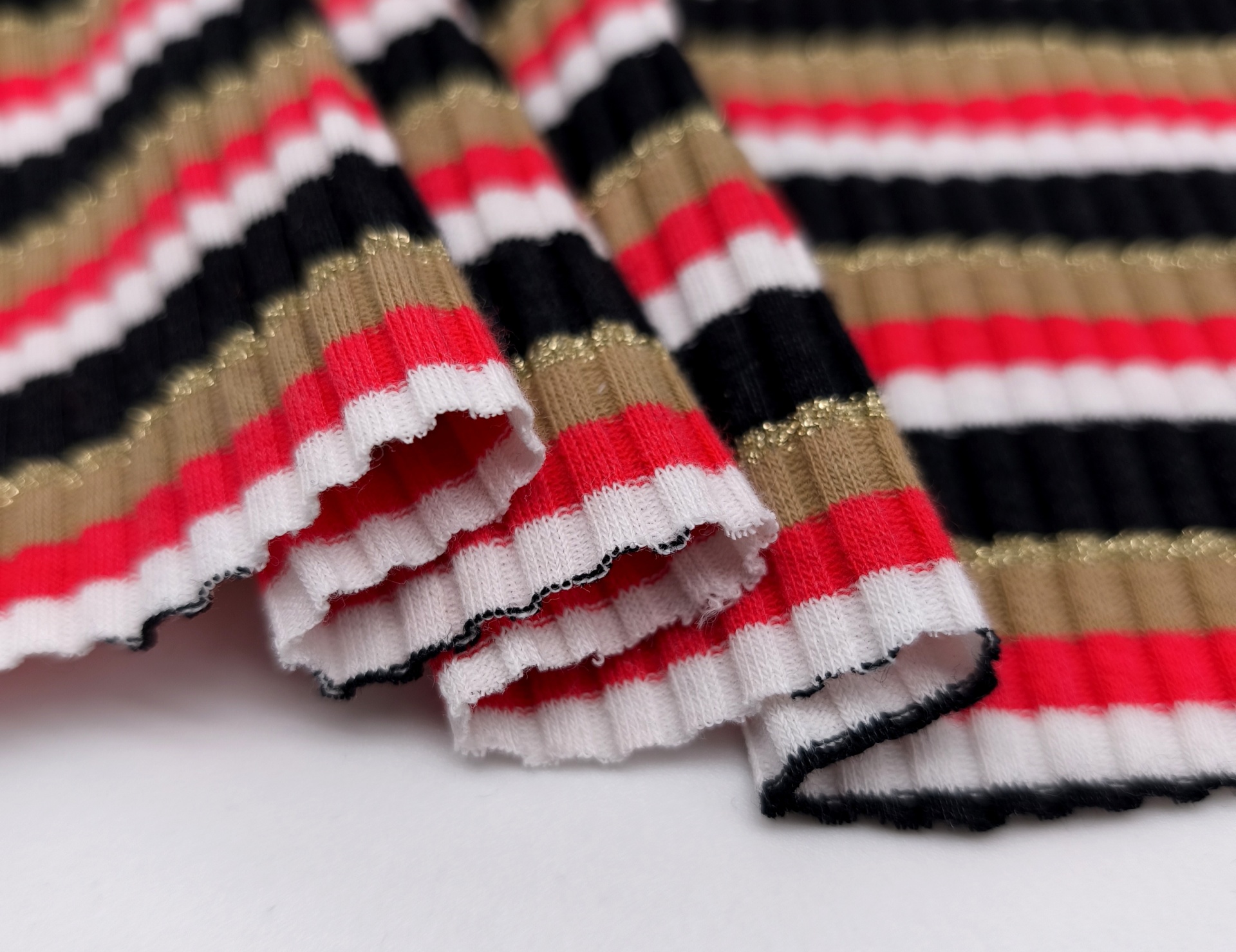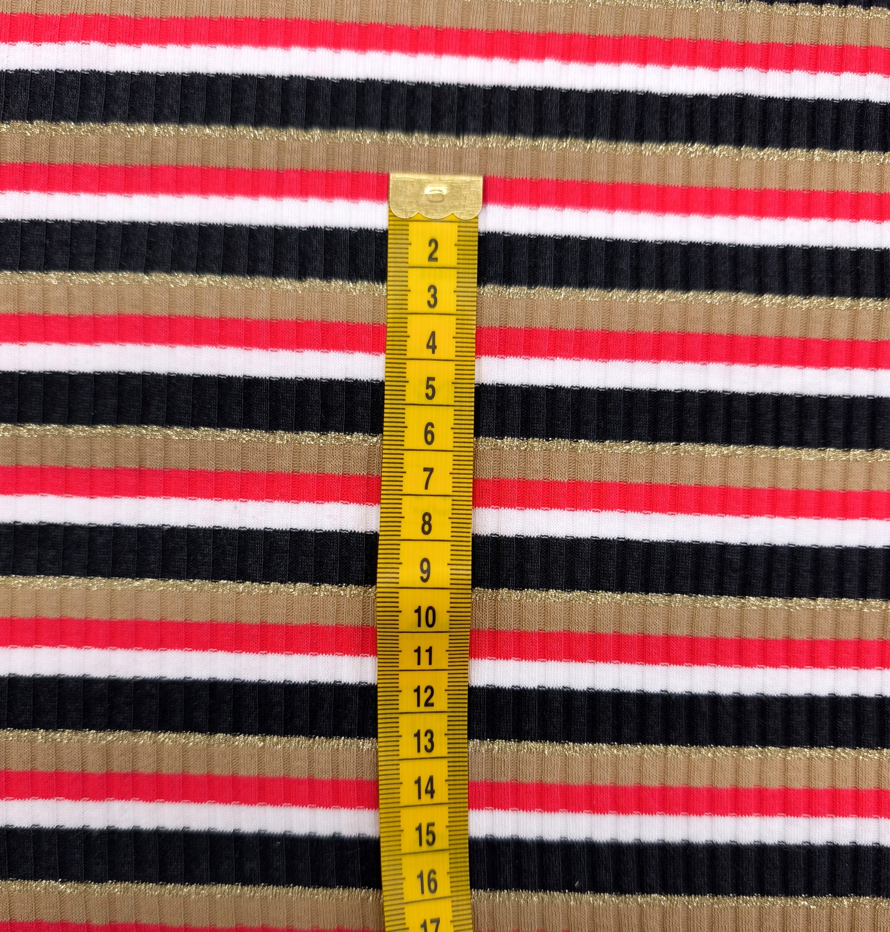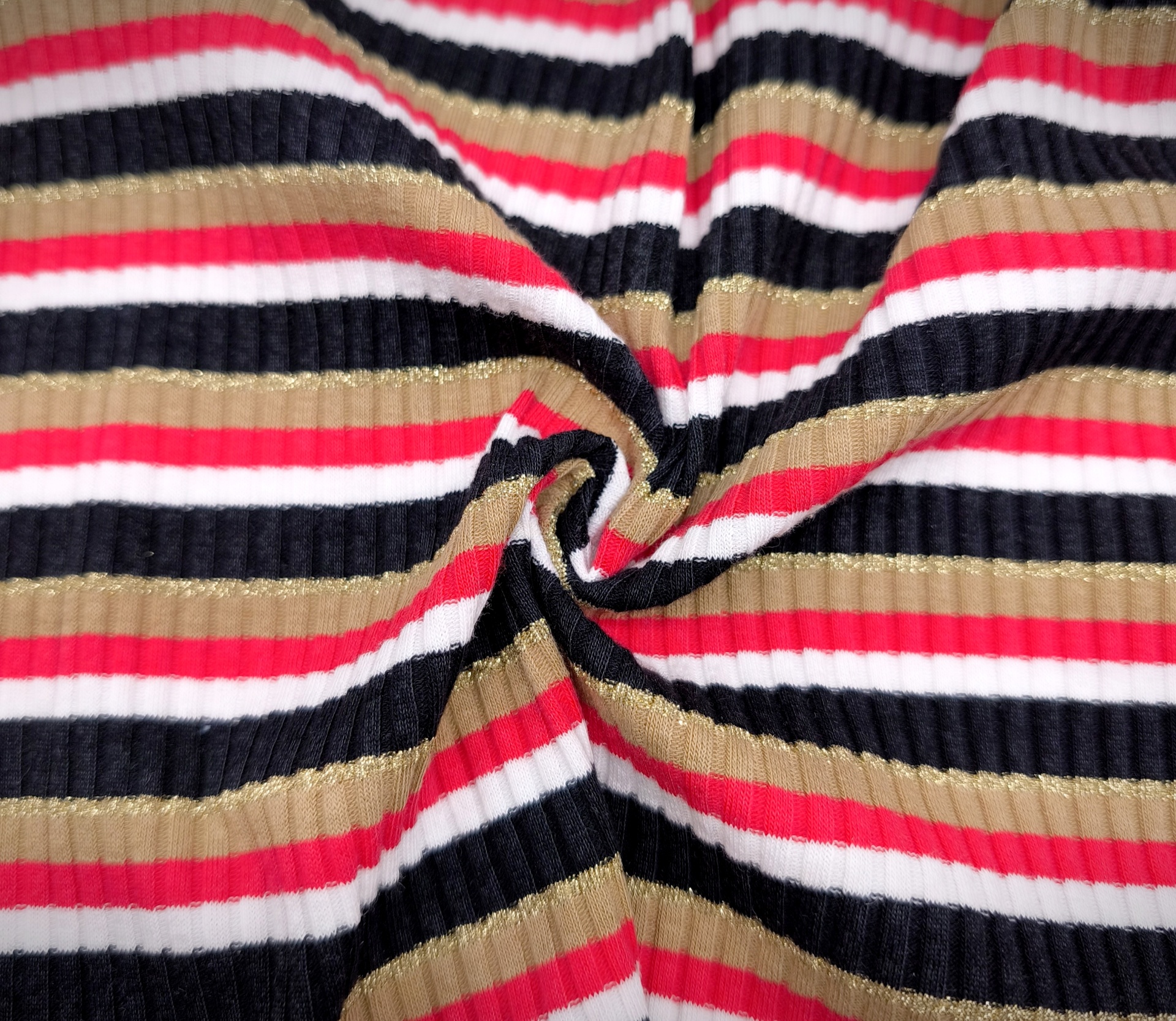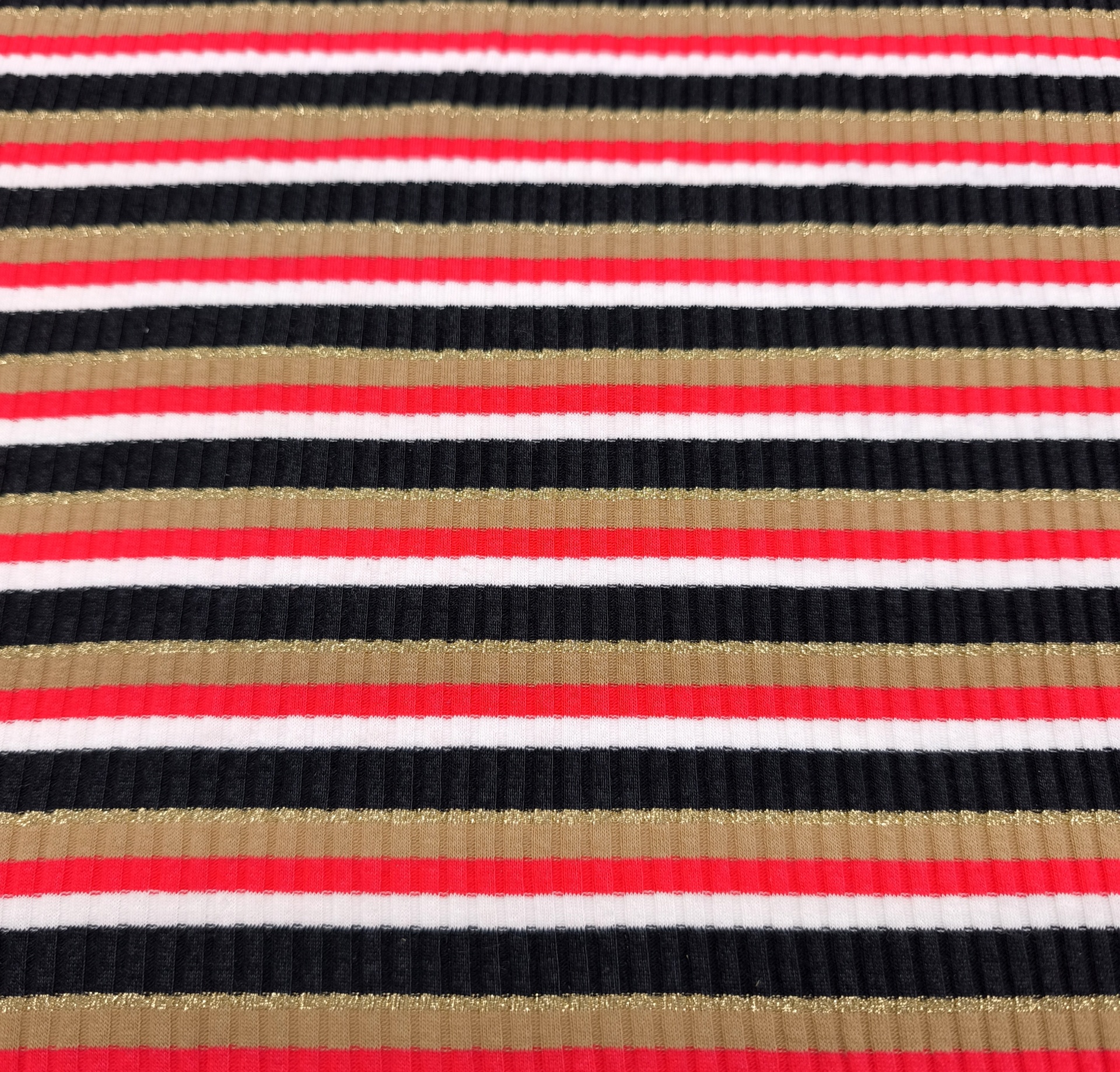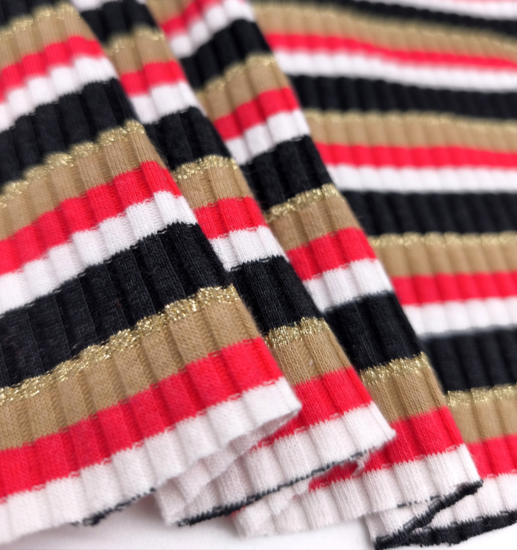Malha rib com fios lurex de brilho dourado, este rib tem um padrão em riscas (preto, café com leite, vermelho, branco e dourado), apesar de não ter elastano/licra, tem elasticidade mecânica, tornando uma malha que pode ser usada justa ao corpo, maleável e bom caimento