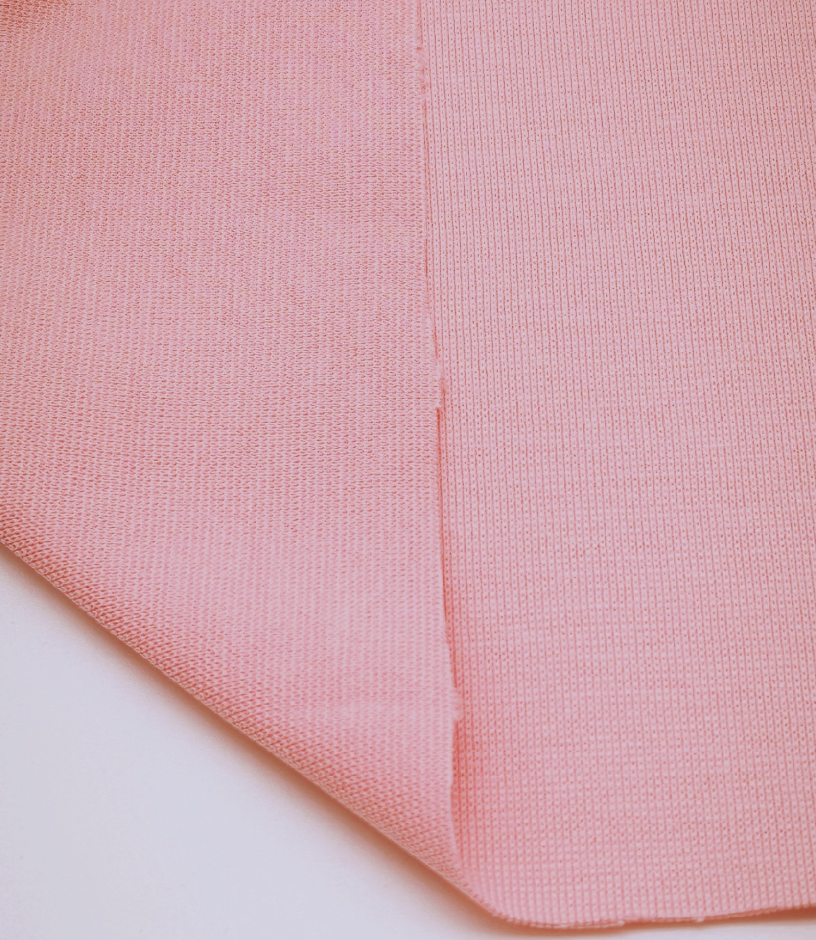 Malha em tom rosa claro, macia, maleável, muito confortável, boa elasticidade