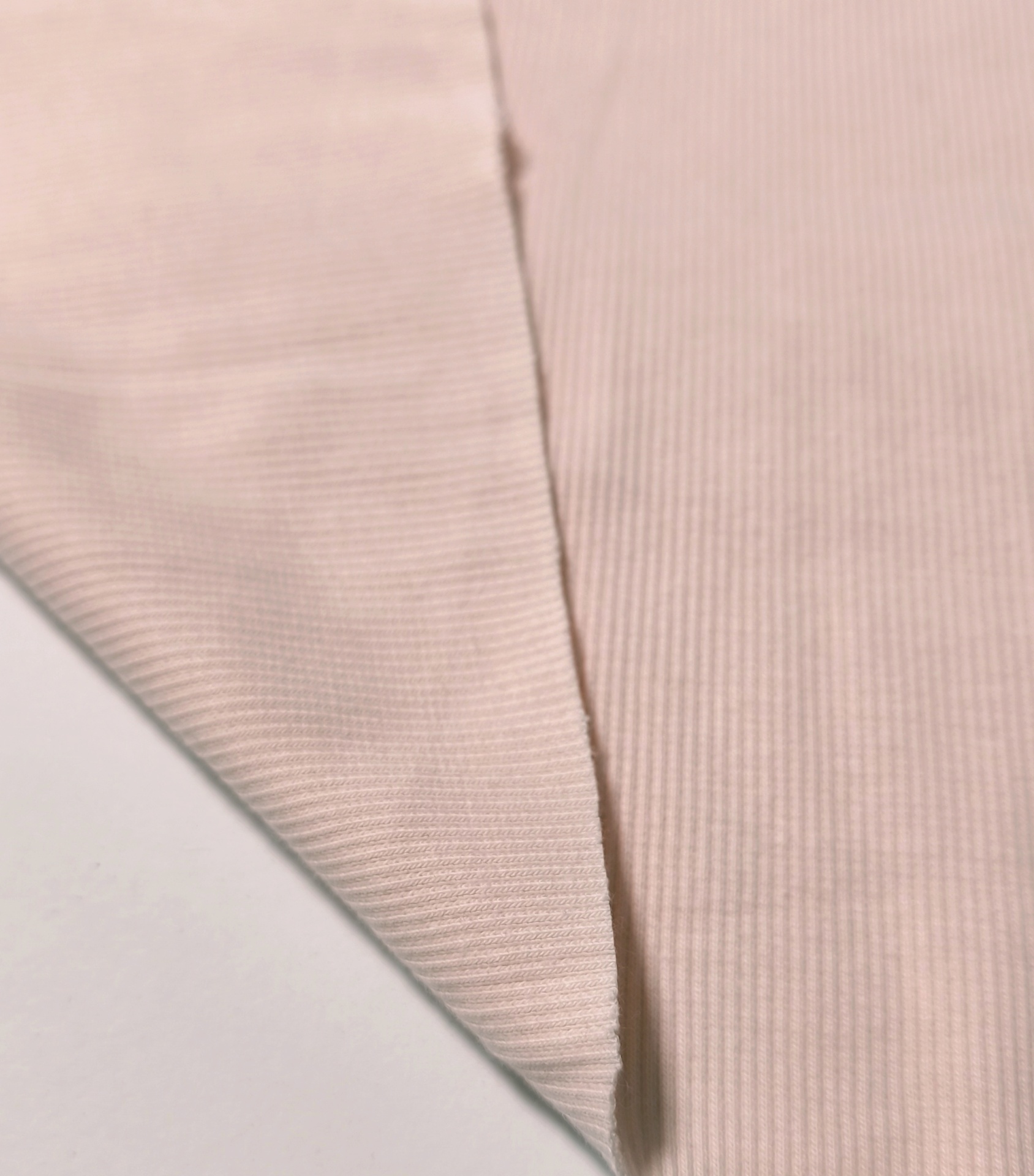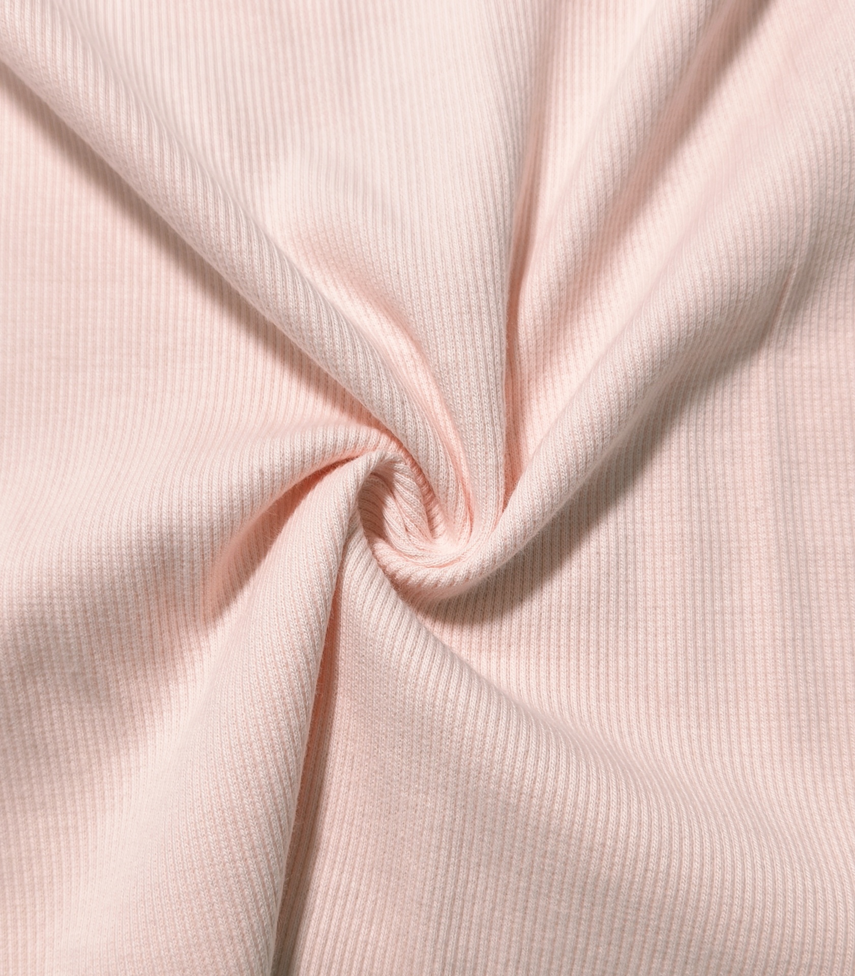 Malha de tom rosa muito clarinho, maleável, com elasticidade, flexível, peso médio, cor opaca, sem brilho, resistente