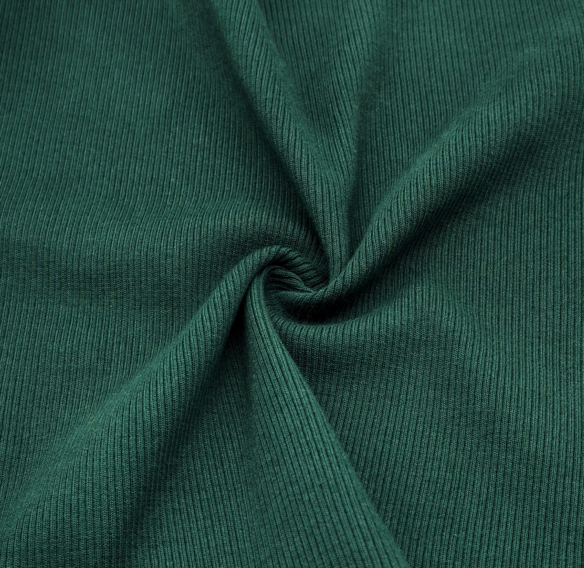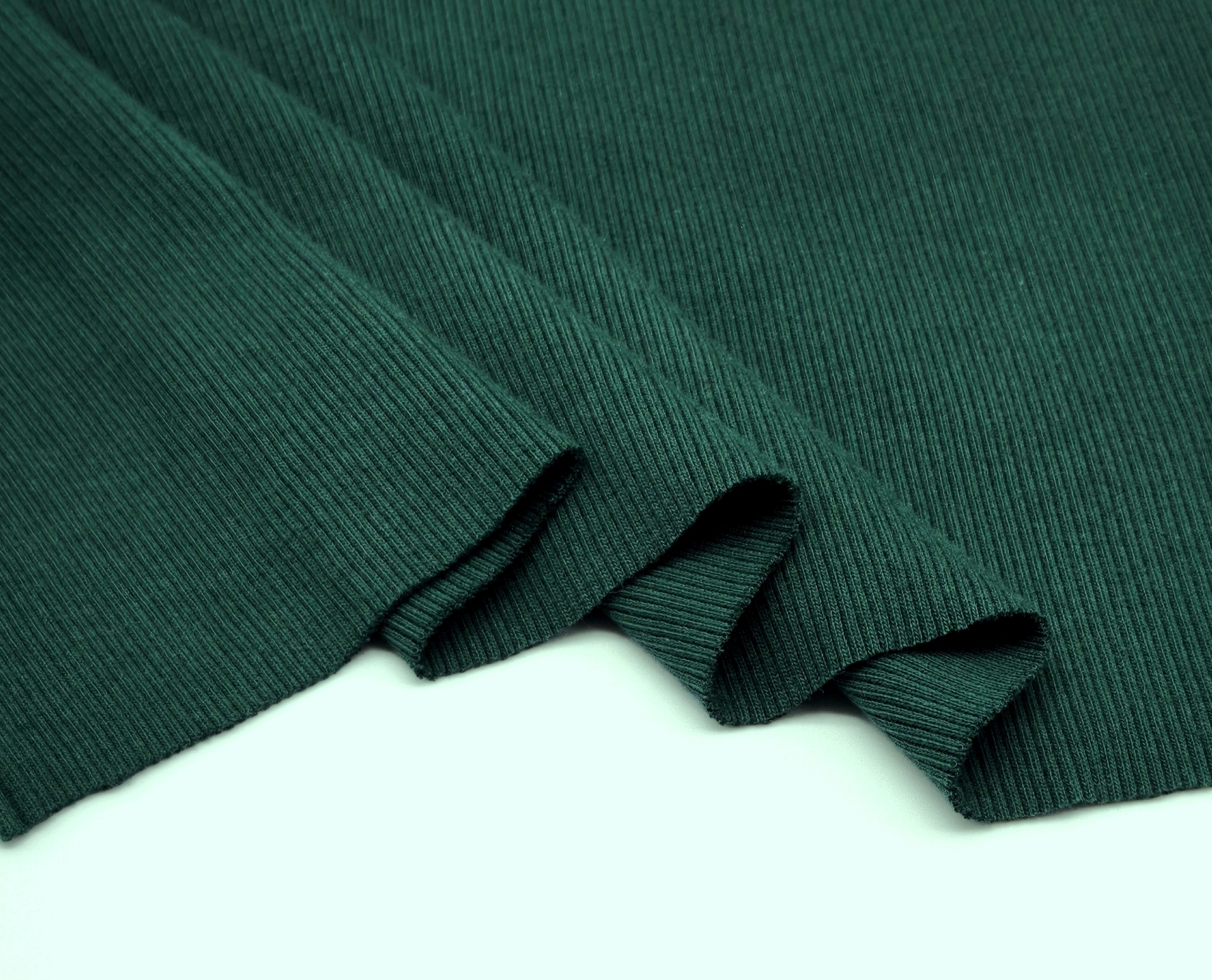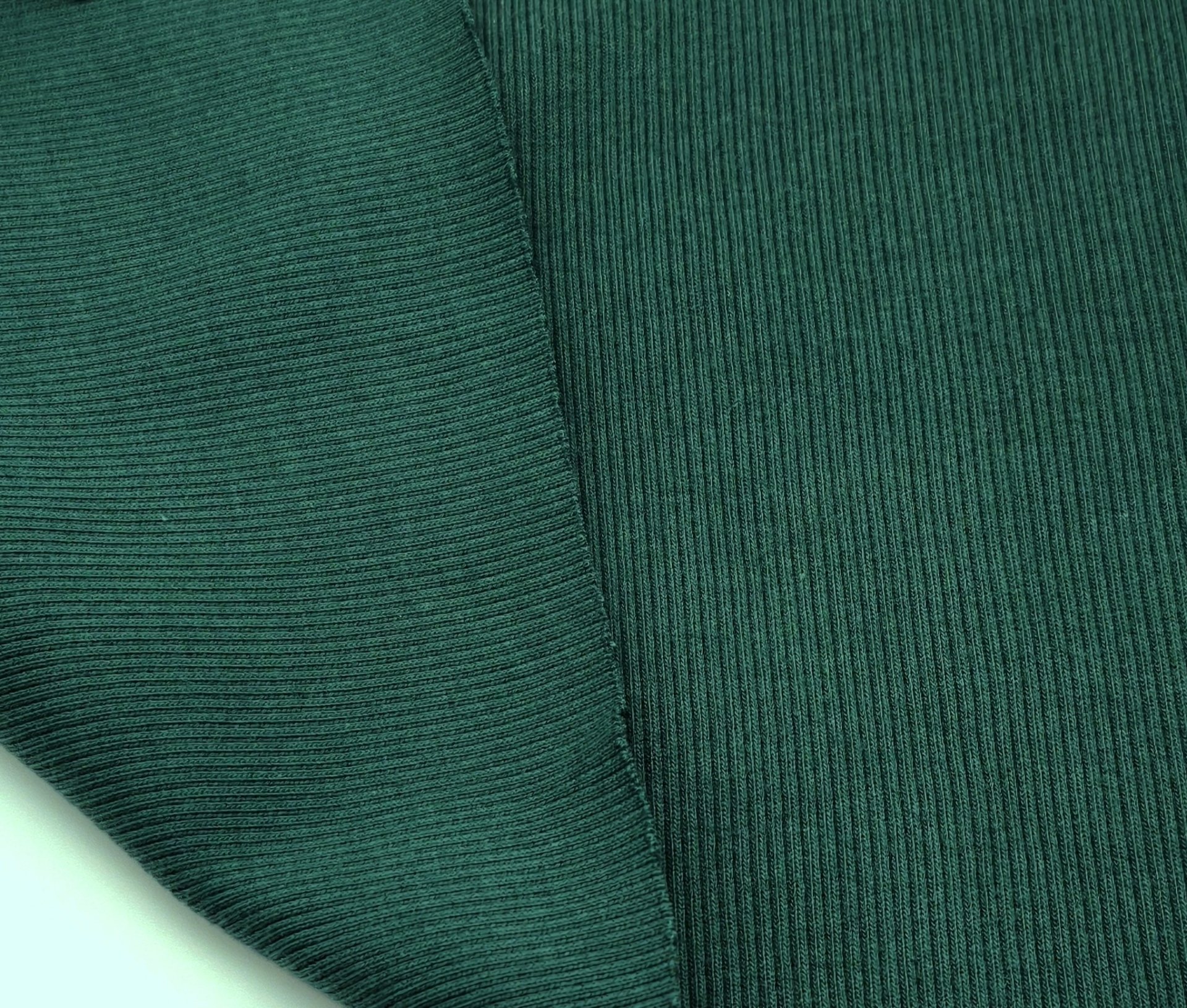 Malha em tom verde garrafa, macia, maleável, boa elasticidade, cor opaca, sem brilho, peso médio