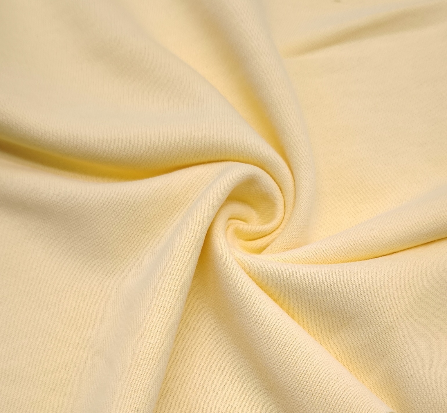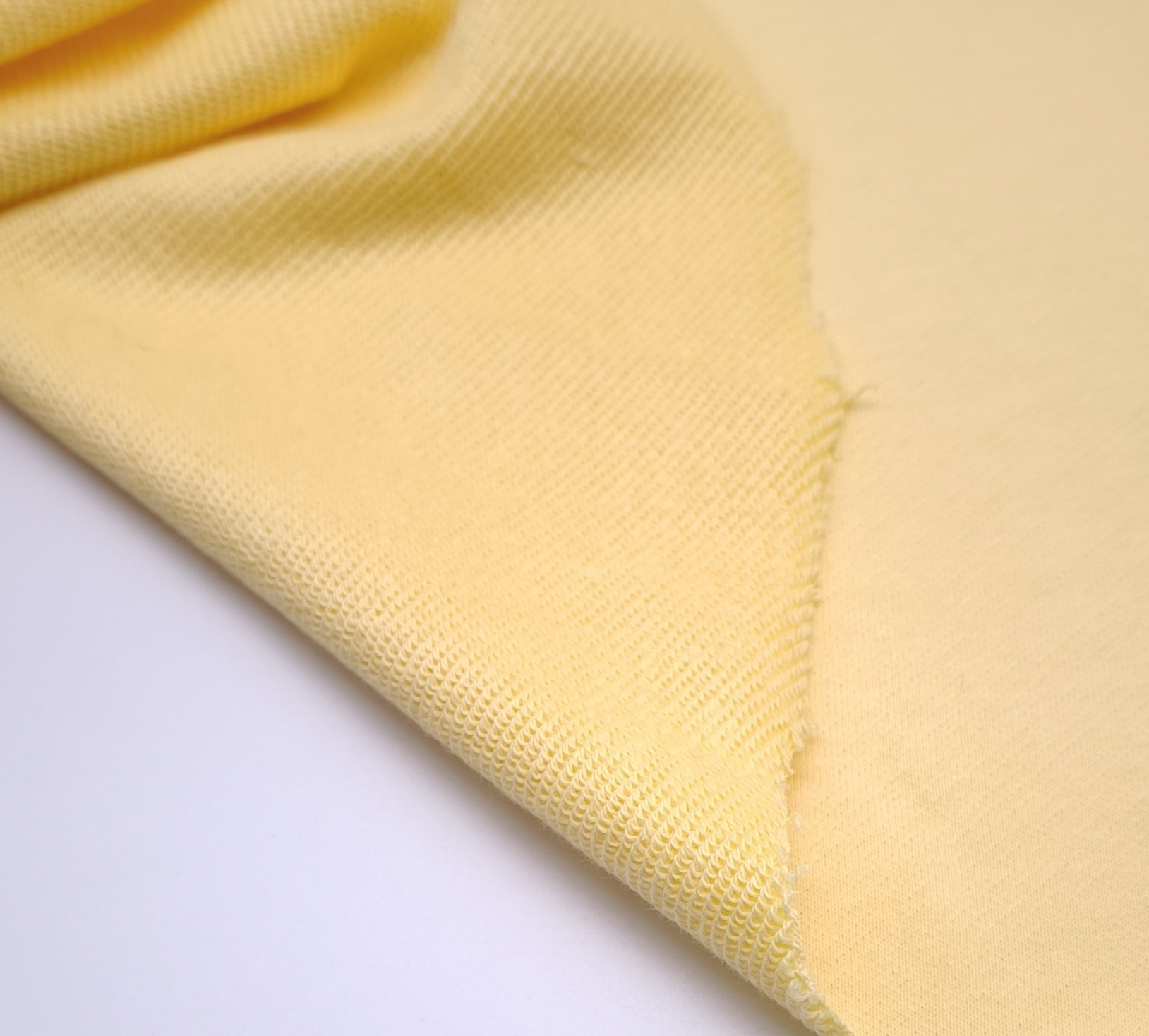 Malha de tom amarelo, muito macia, maleável, fresca e bom caimento