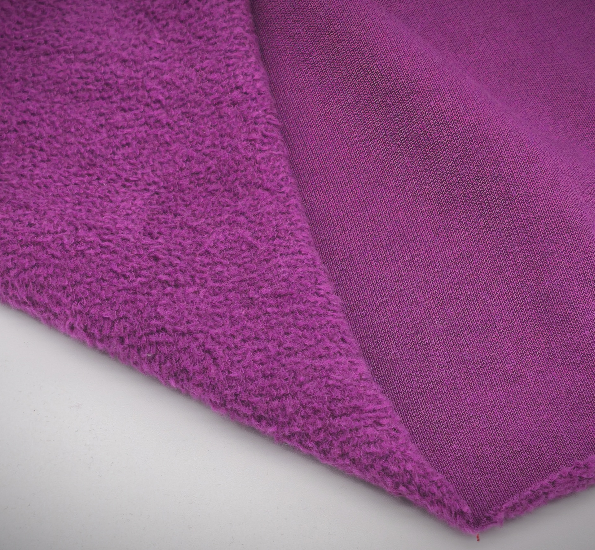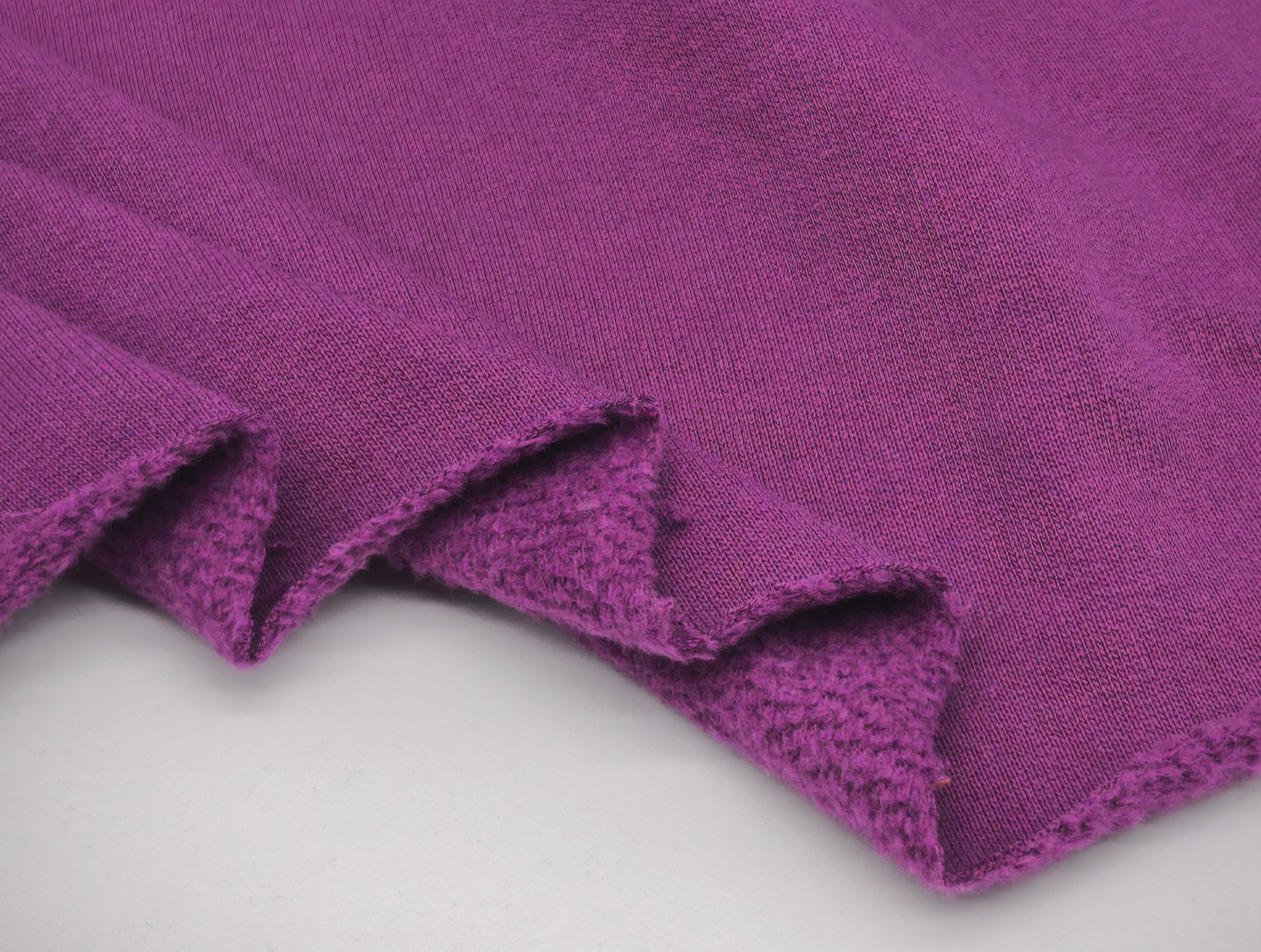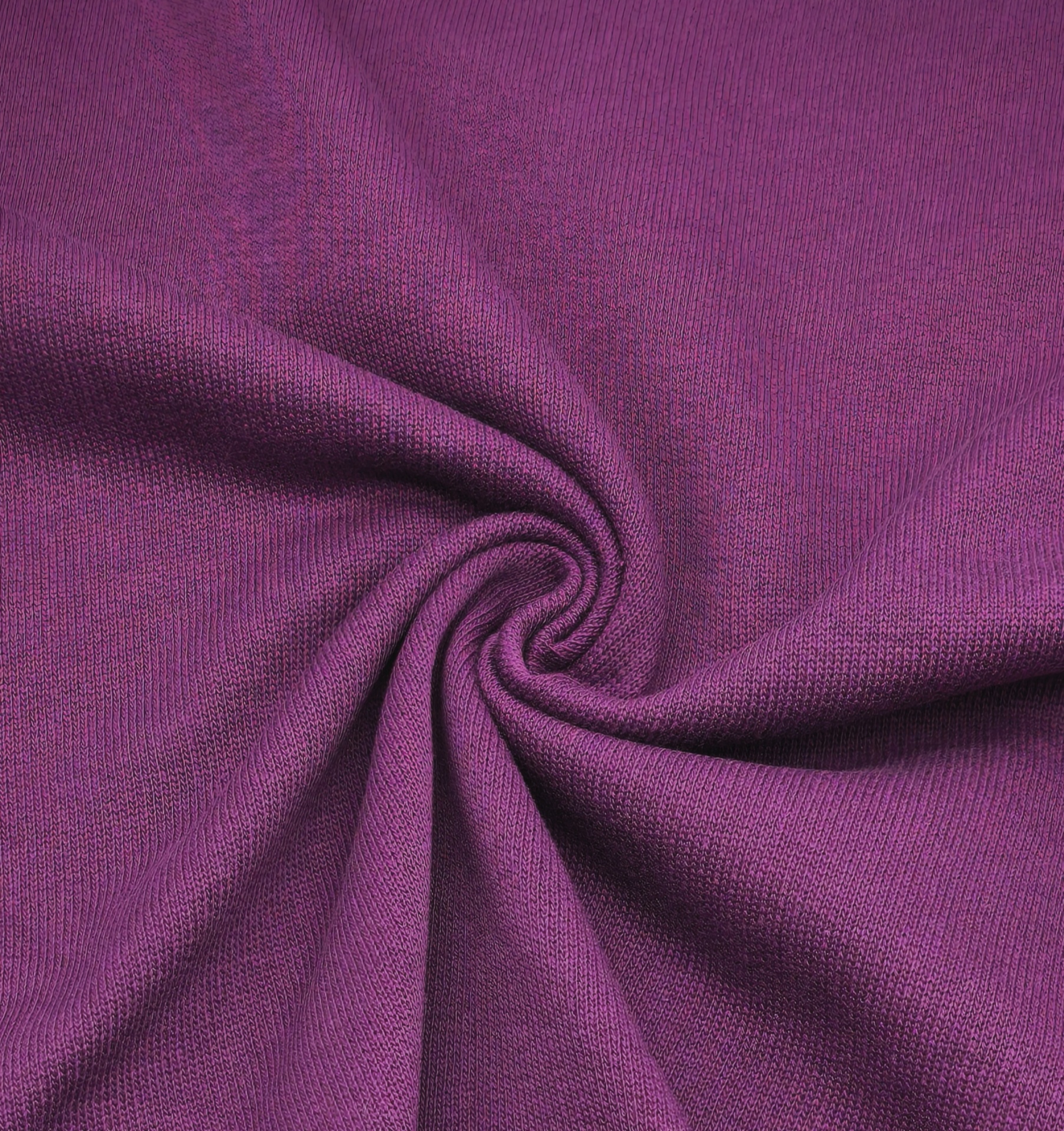 Malha de tom beringela, macia, maleável, bom caimento, peso médio, cor opaca, sem brilho, sem elasticidade