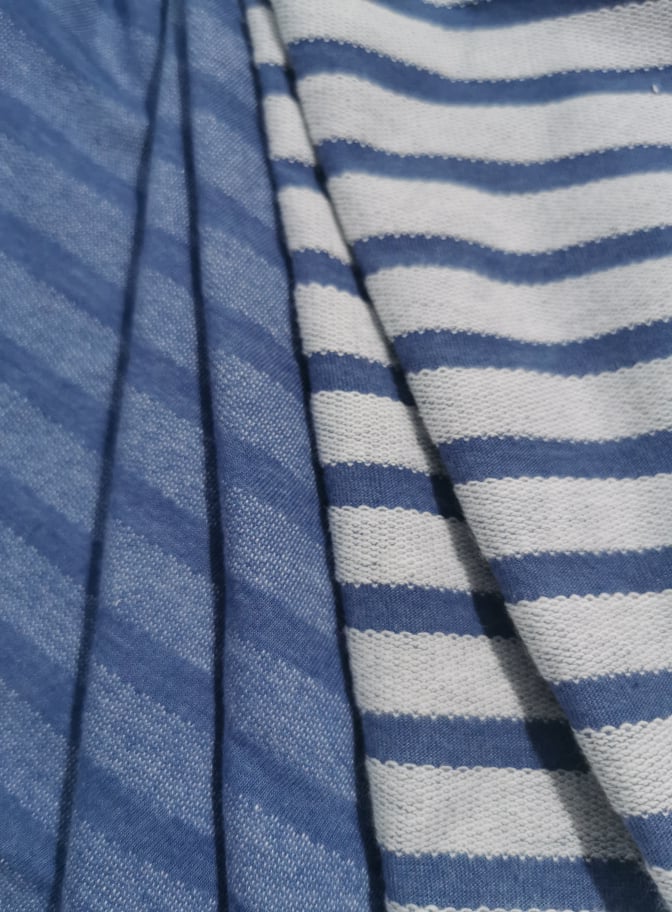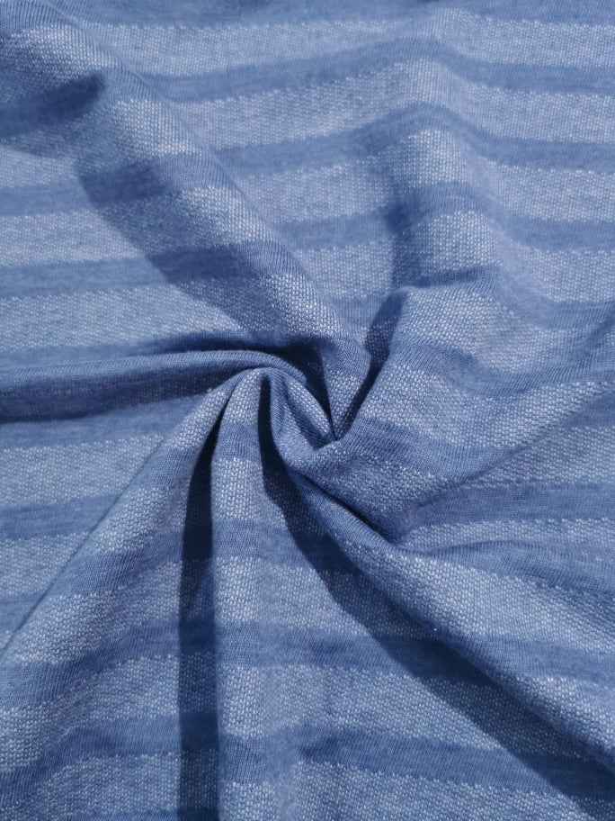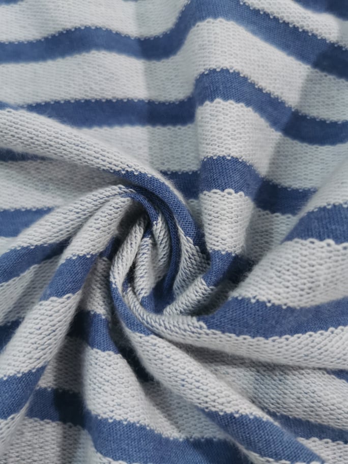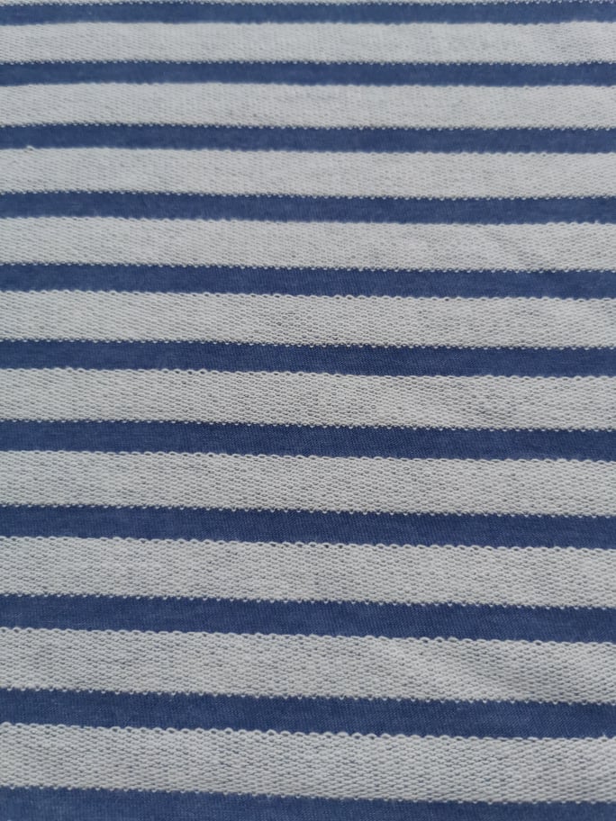 Malha sem carda, listras na horizontal, macia, maleável, cores opacas, sem brilho