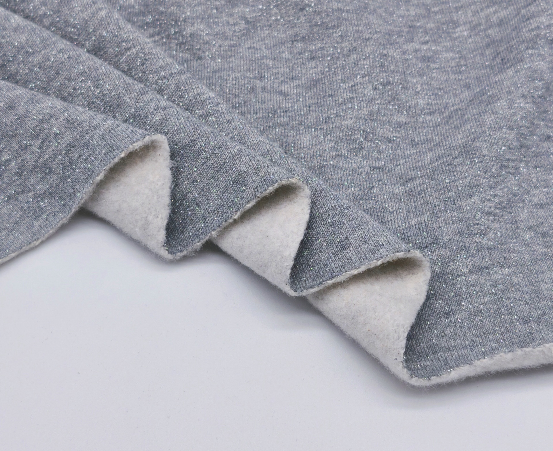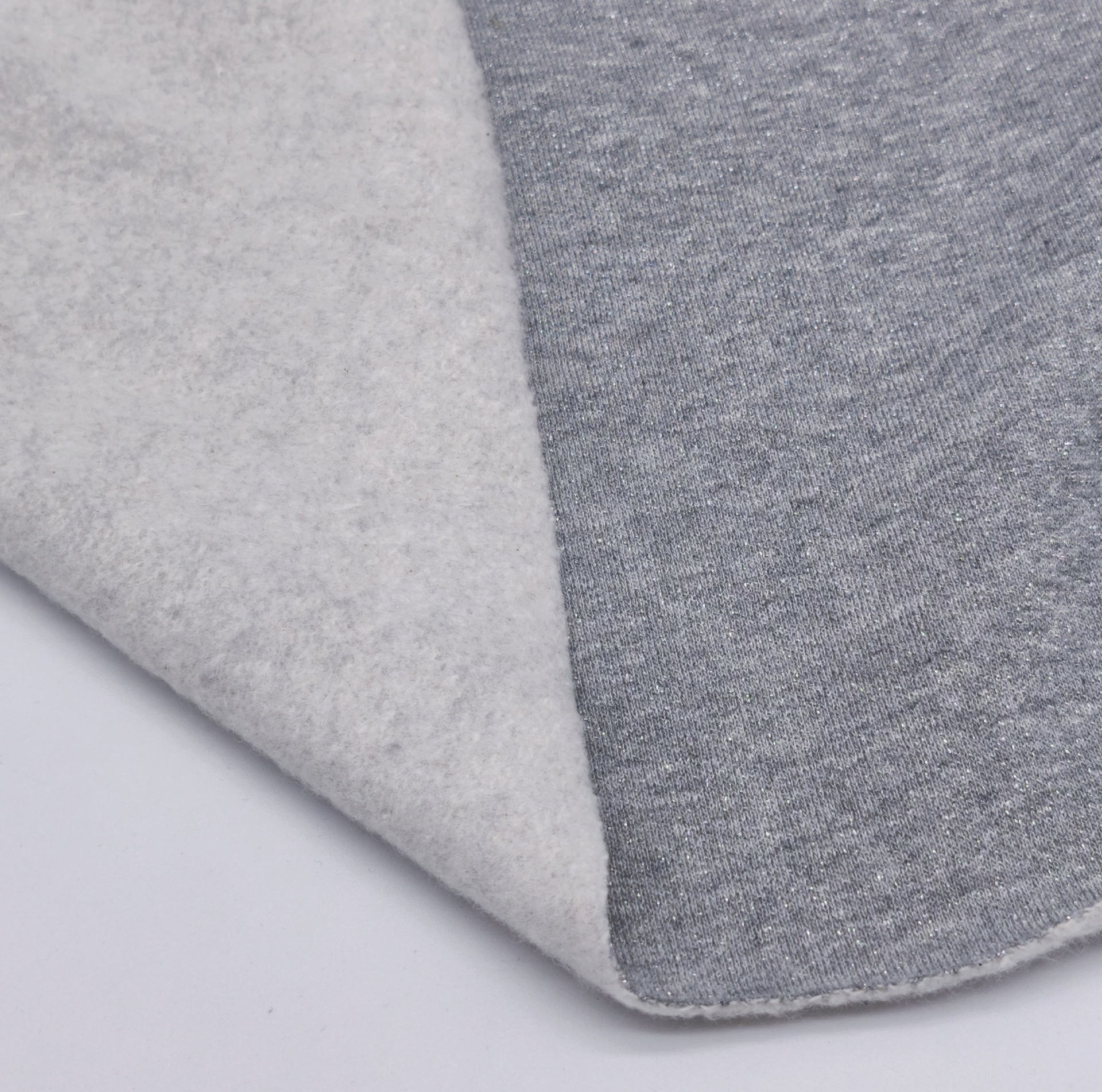 Malha quentinha, maleável, macia, com brilho prata, sem elasticidade, peso médio