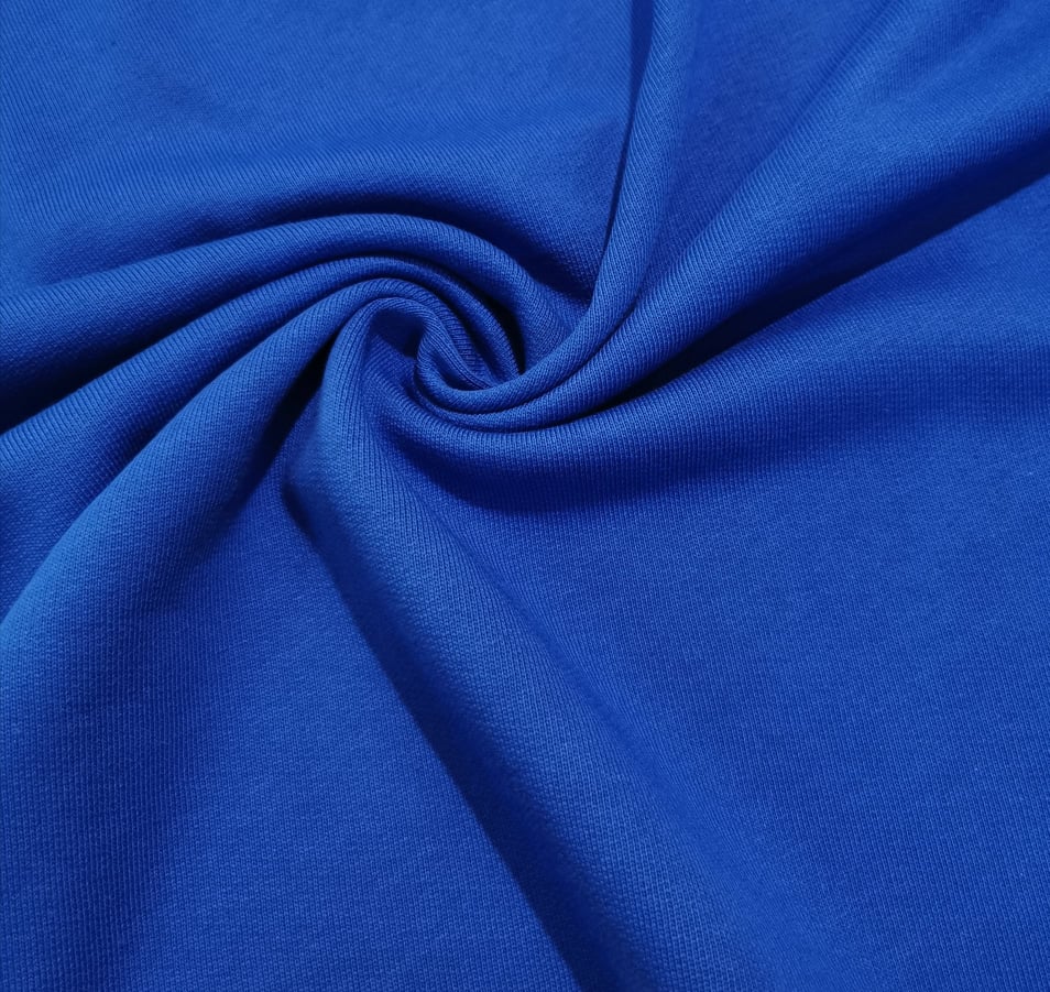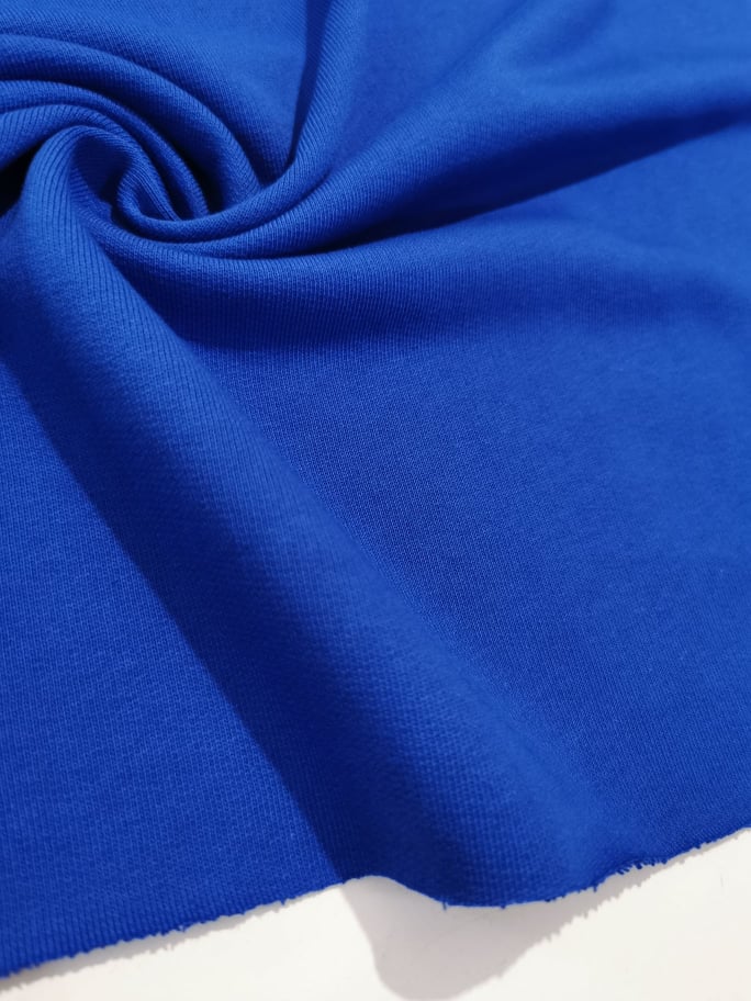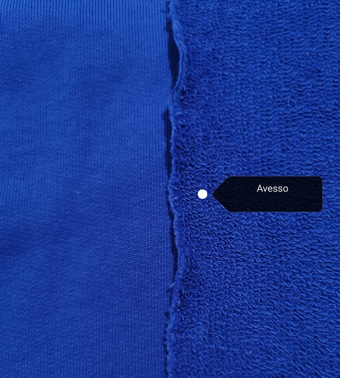 Malha sem carda, no tom azulão, macia, maleável e bom caimento