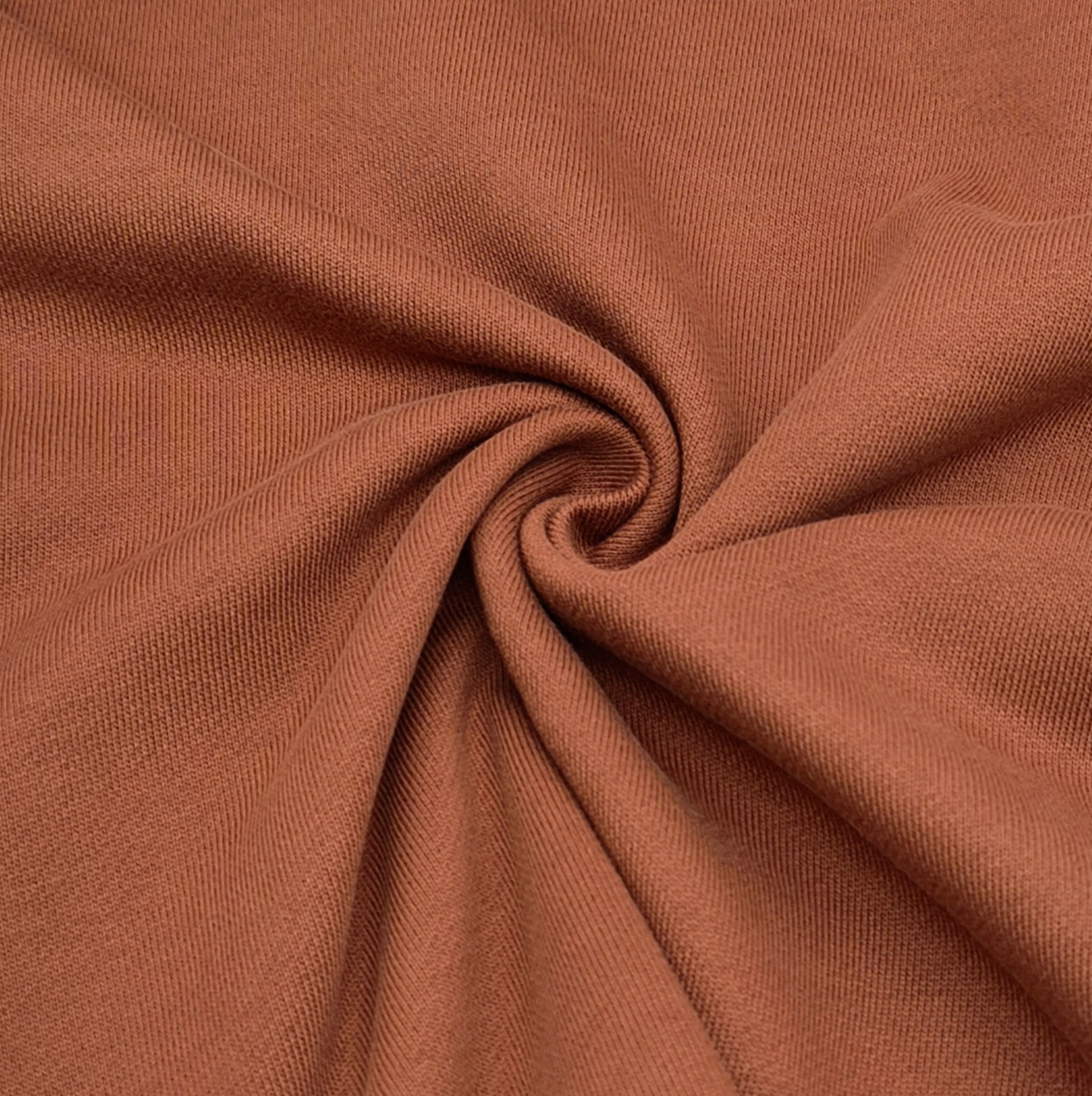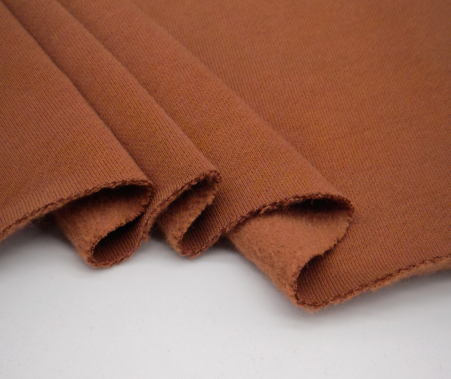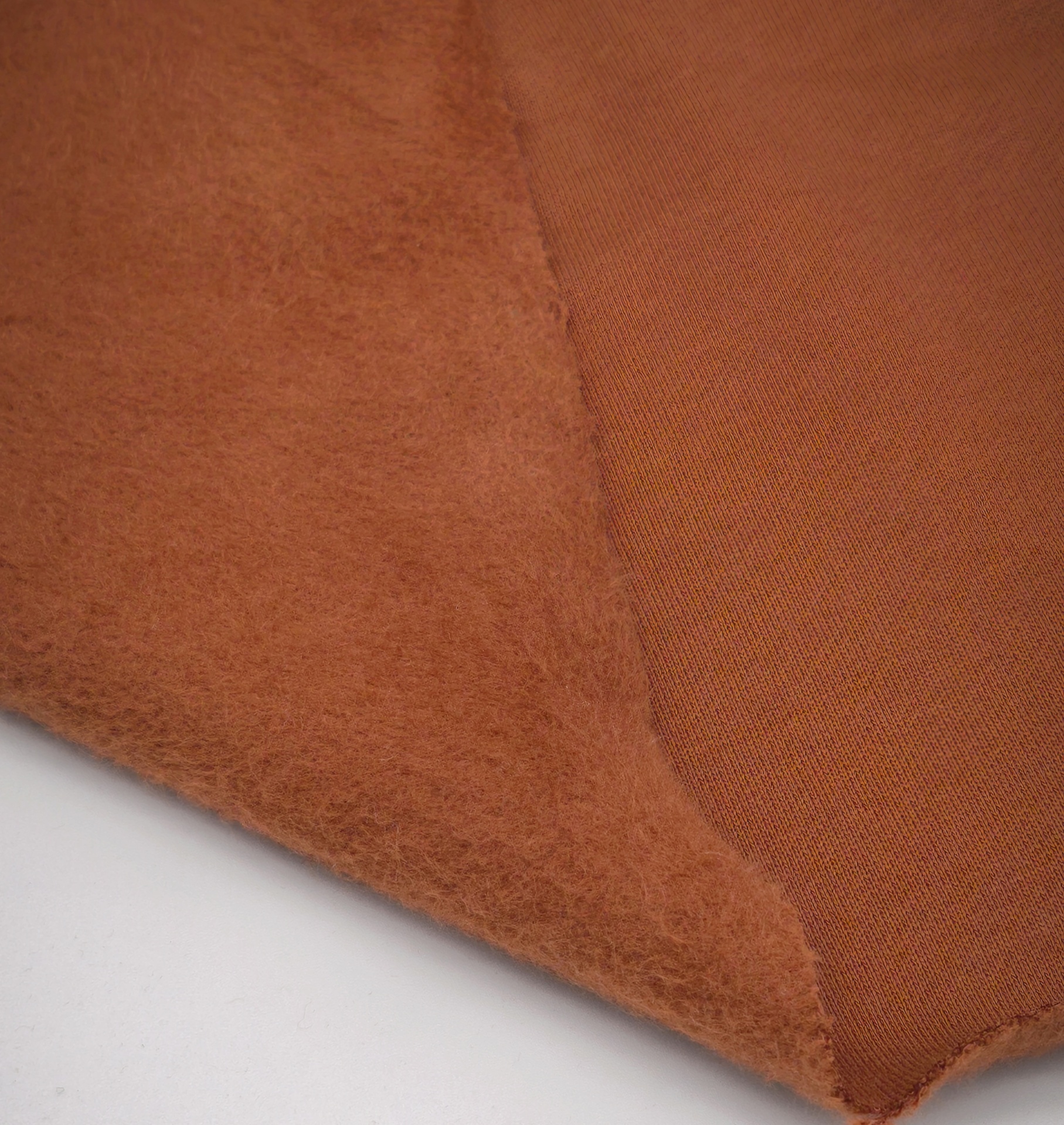 Malha no tom avelã, quentinha, maleável, macia, cor opaca, sem brilho