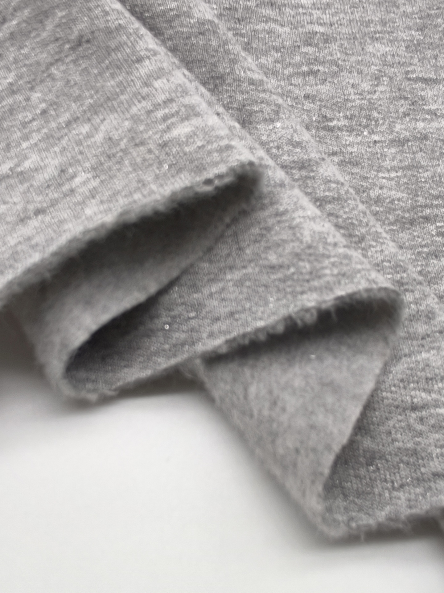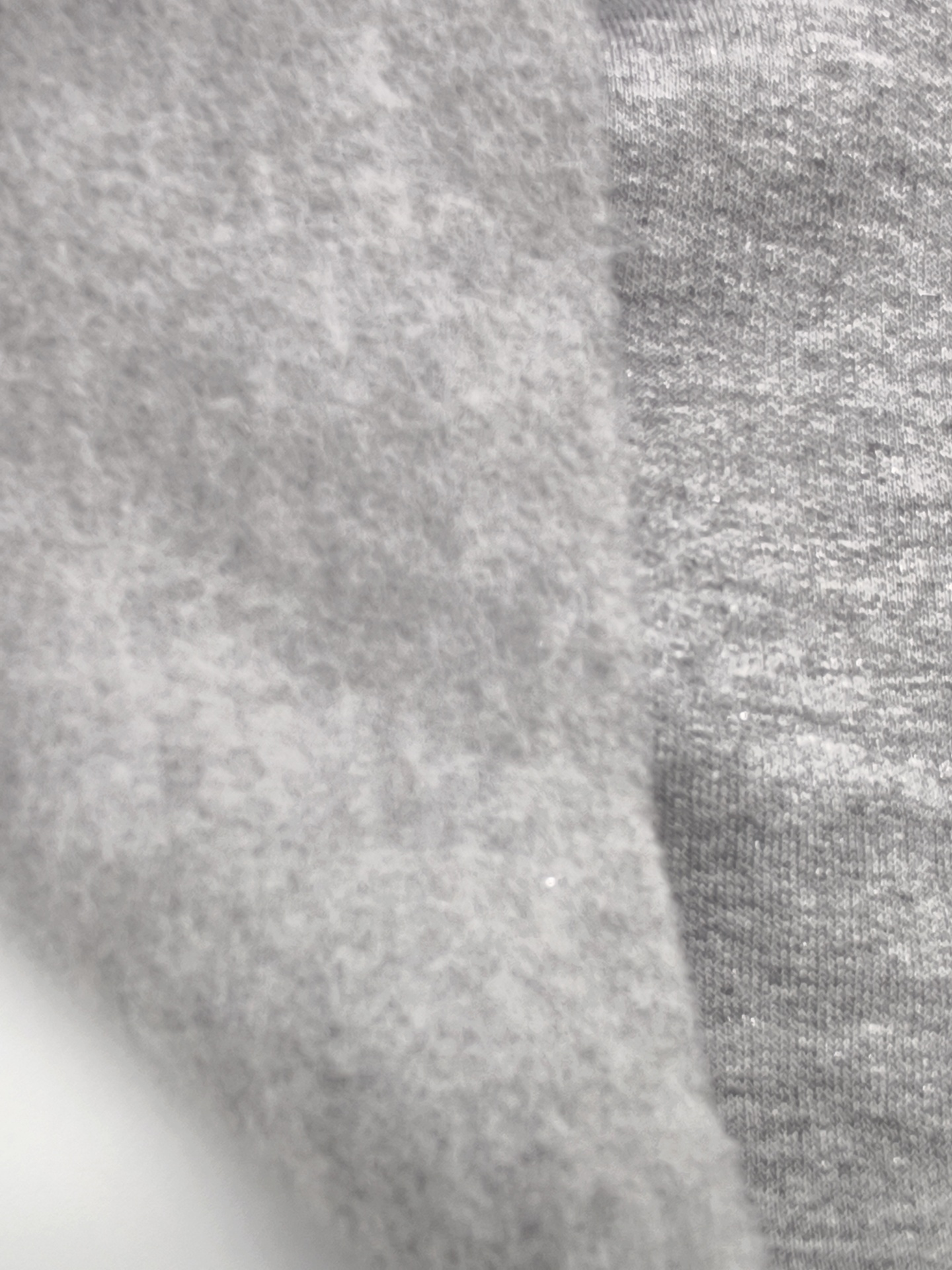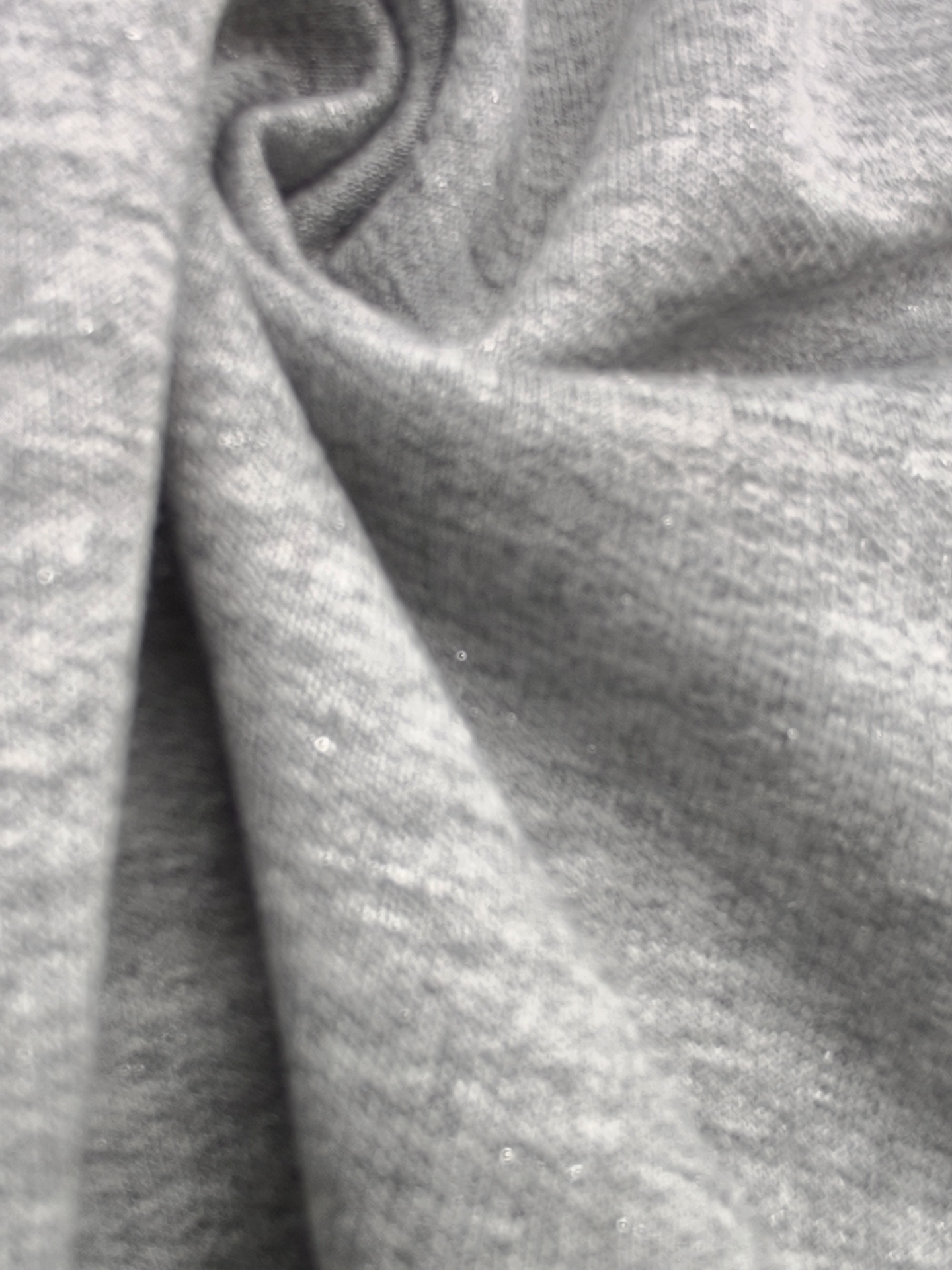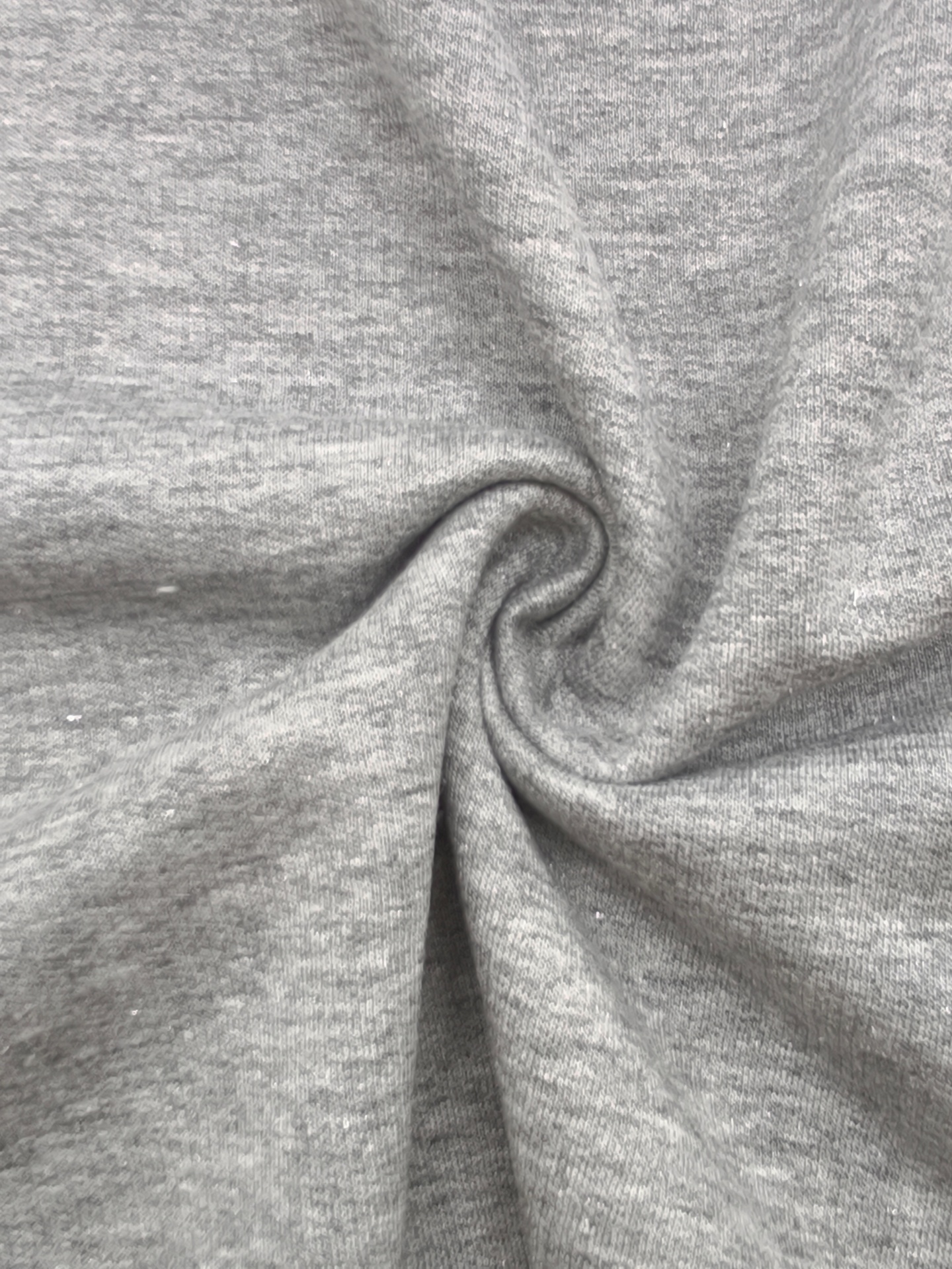 Malha de algodão com brilho prata, com pêlo raso (carda) do avesso bastante macia, quente, maleável