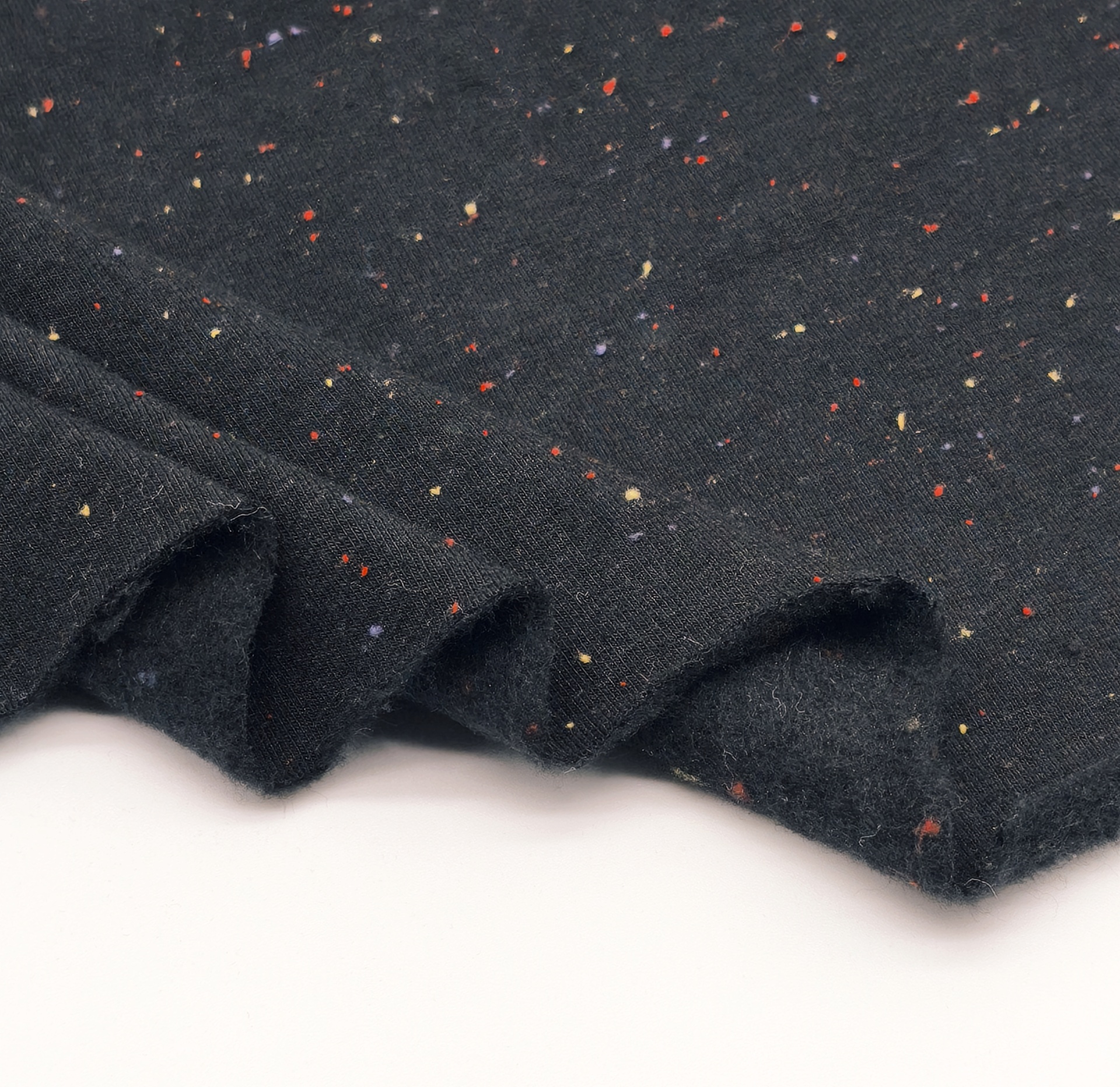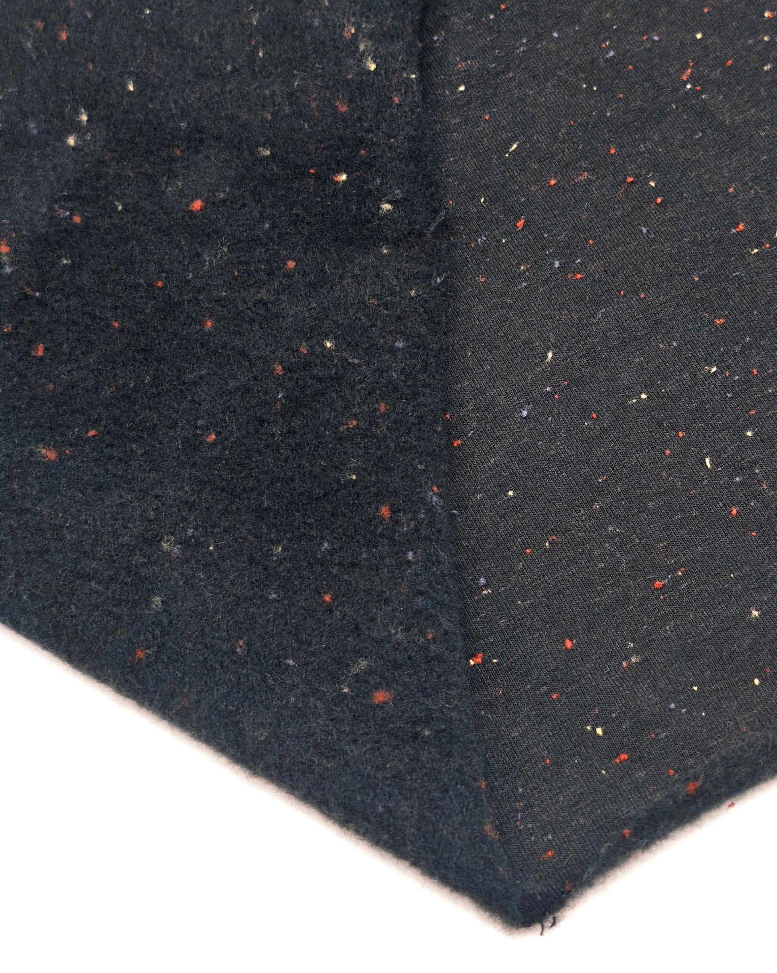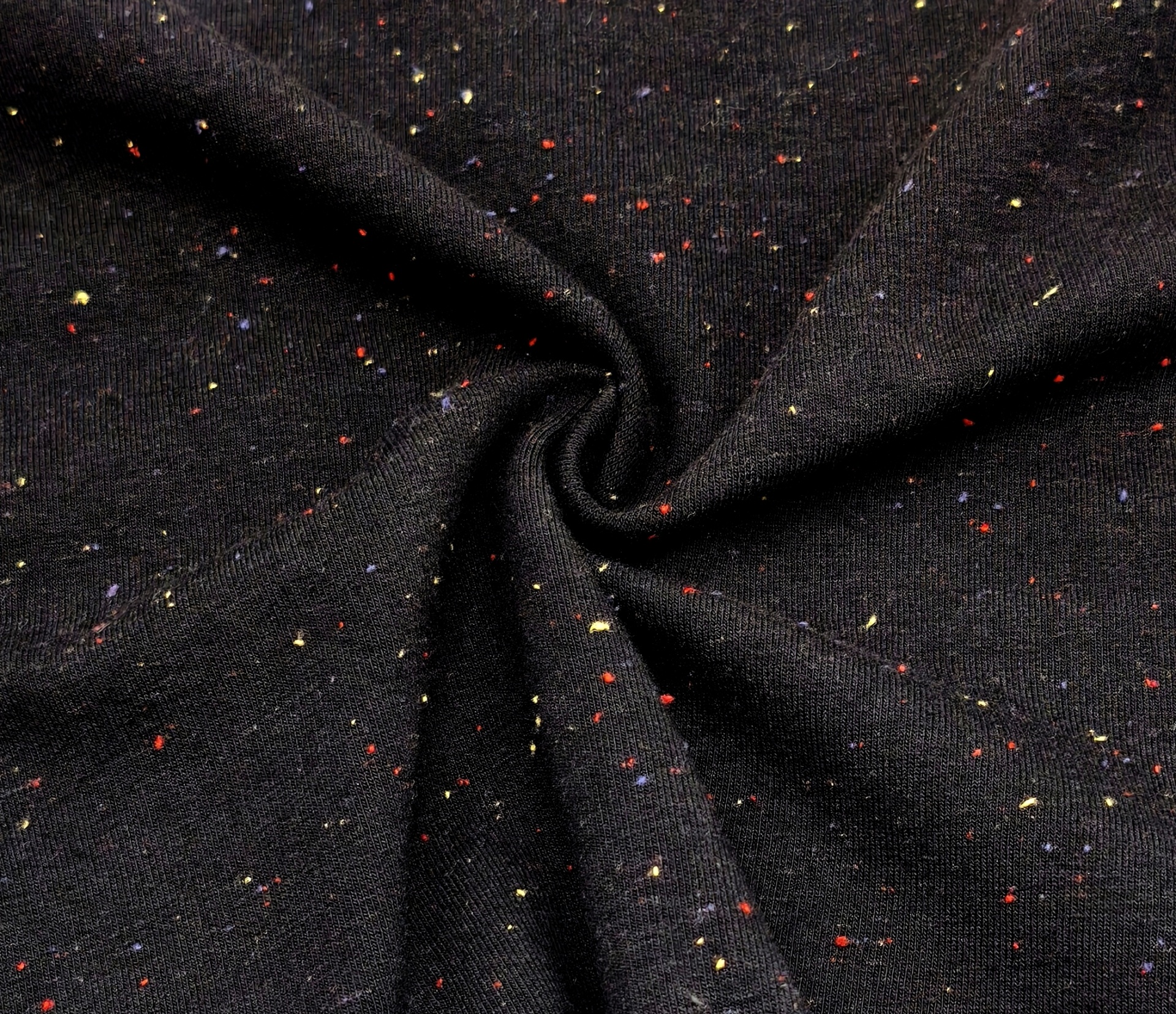 Malha de tom base preto com pequenos grumos em tons de amarelo, lilás, vermelho, quentinha, boa elasticidade, maleável e macia