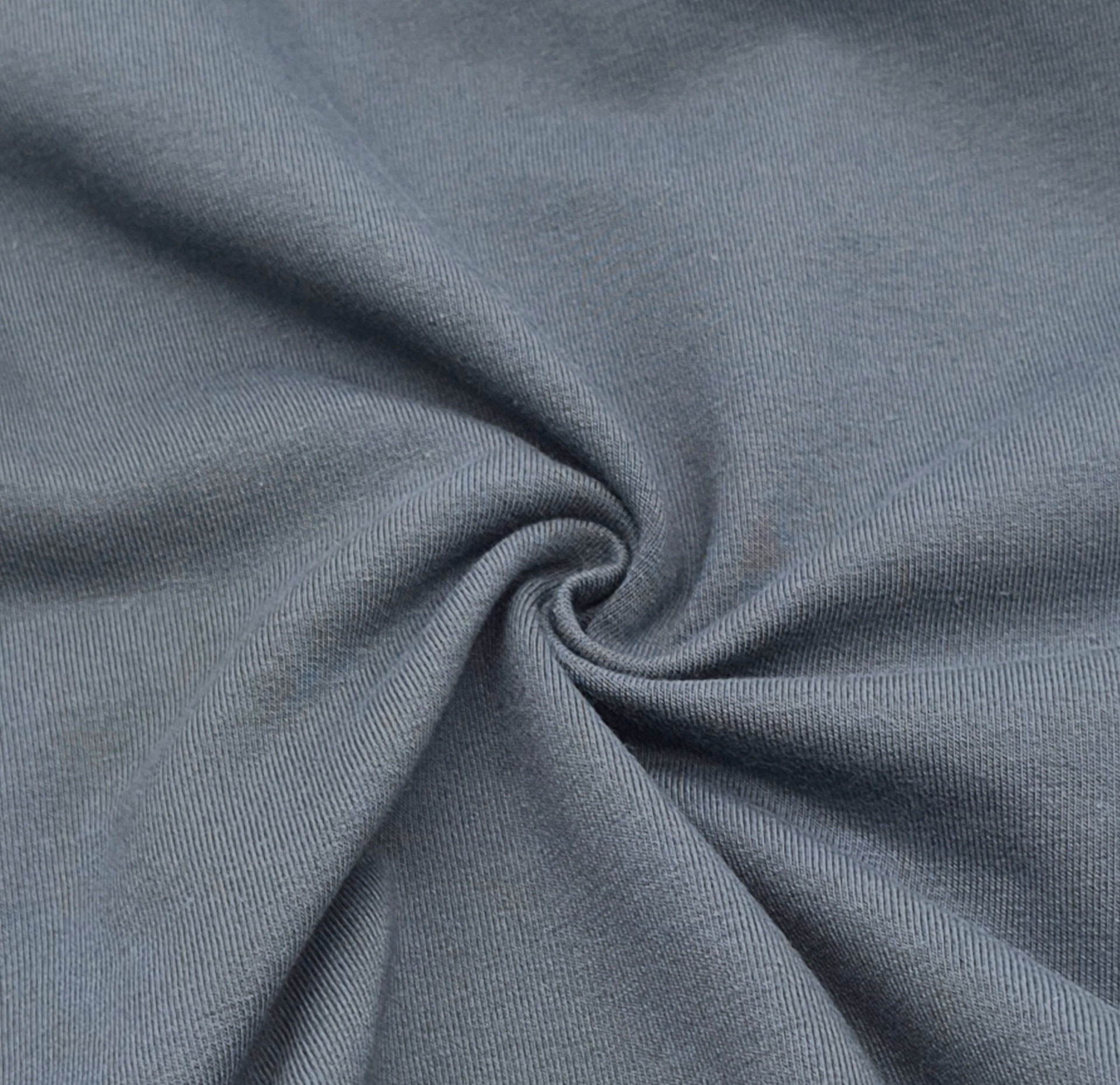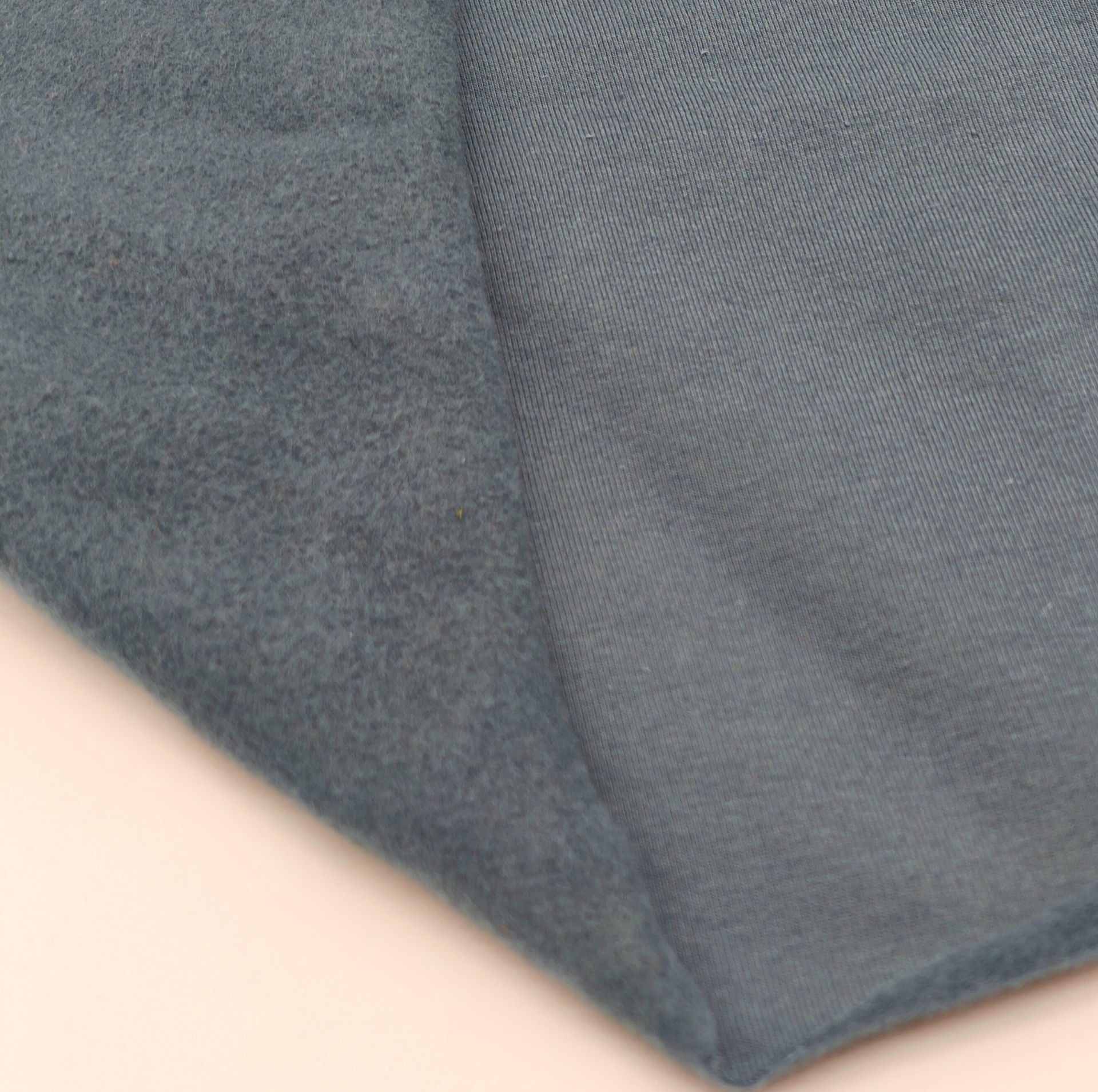 Malha de tom acinzentado, com carda rasa, boa elasticidade, macia, maleável, bom caimento, cor opaca, sem brilho