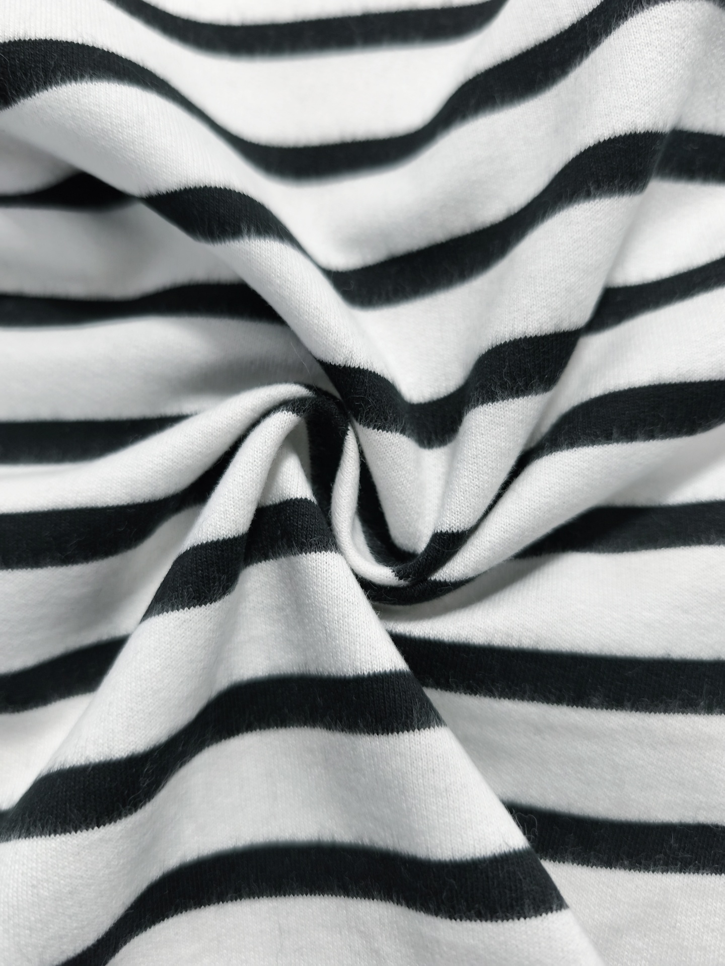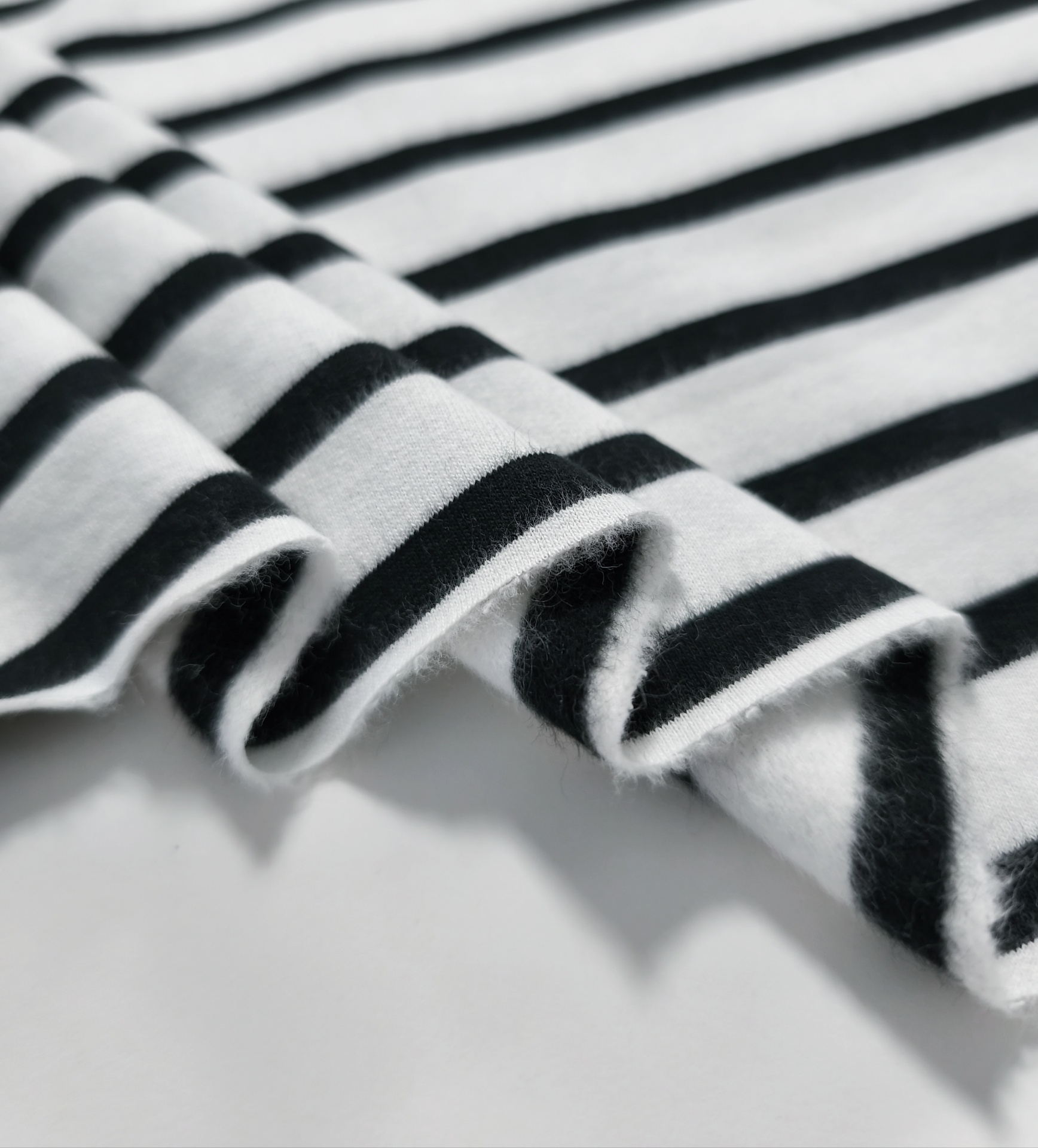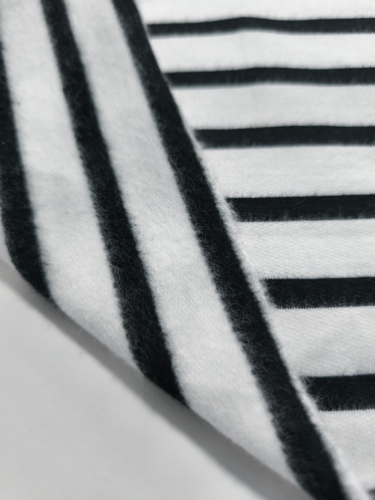Malha quentinha, maleável, macia, peso médio, sem brilho, cor opaca, sem elasticidade, listras ligeiramente na diagonal