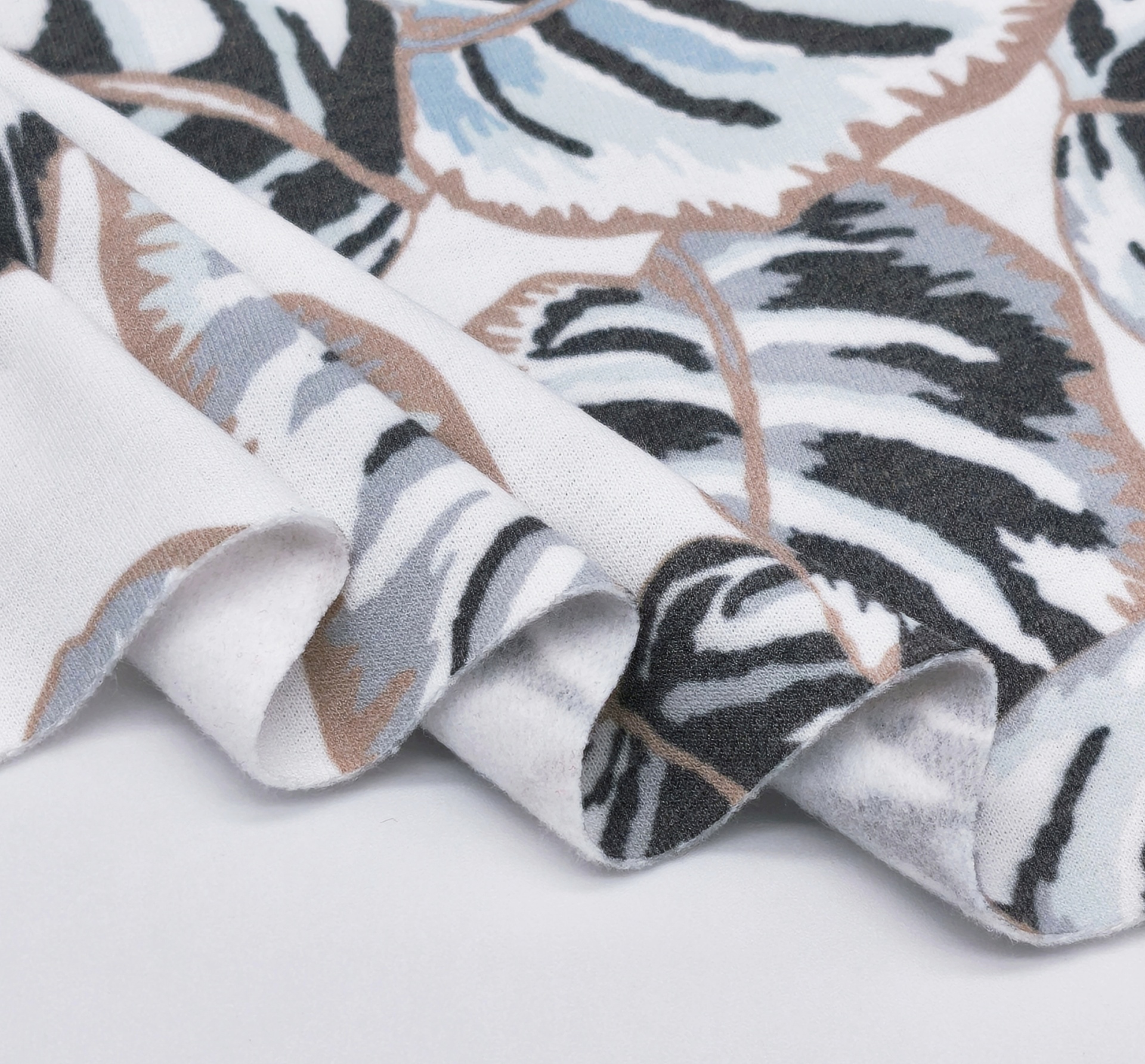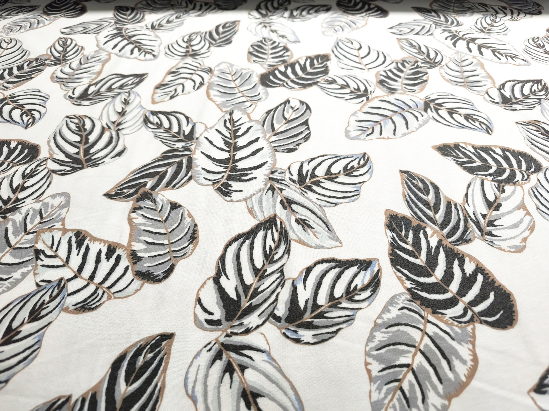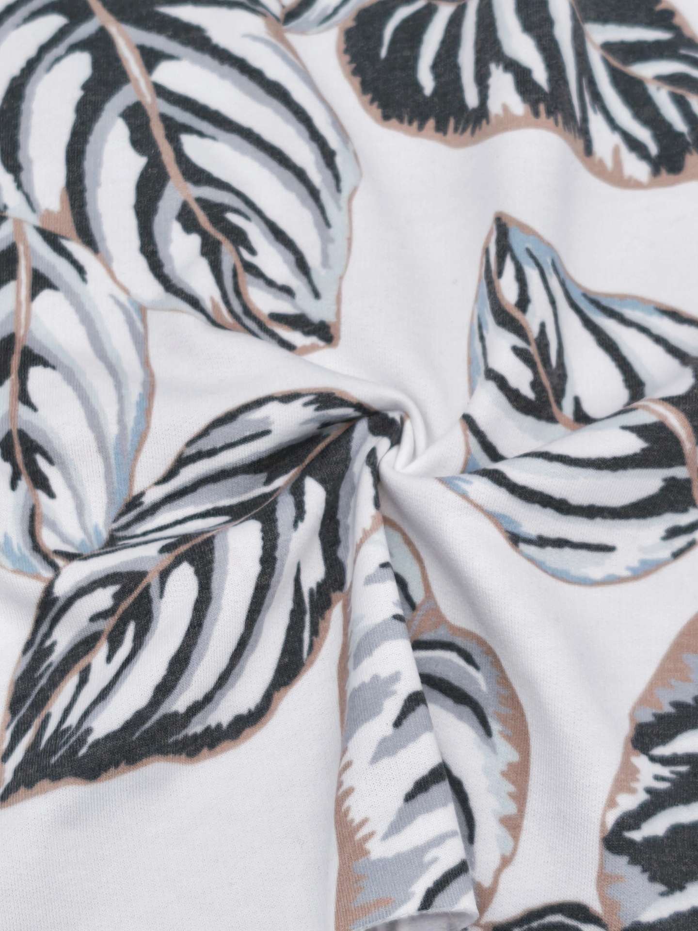 Malga de tom base branco com folhagem em tom preto, bege, cinza e azul, macia, maleável, quentinha, cores opacas, sem brilho, sem elasticidade
