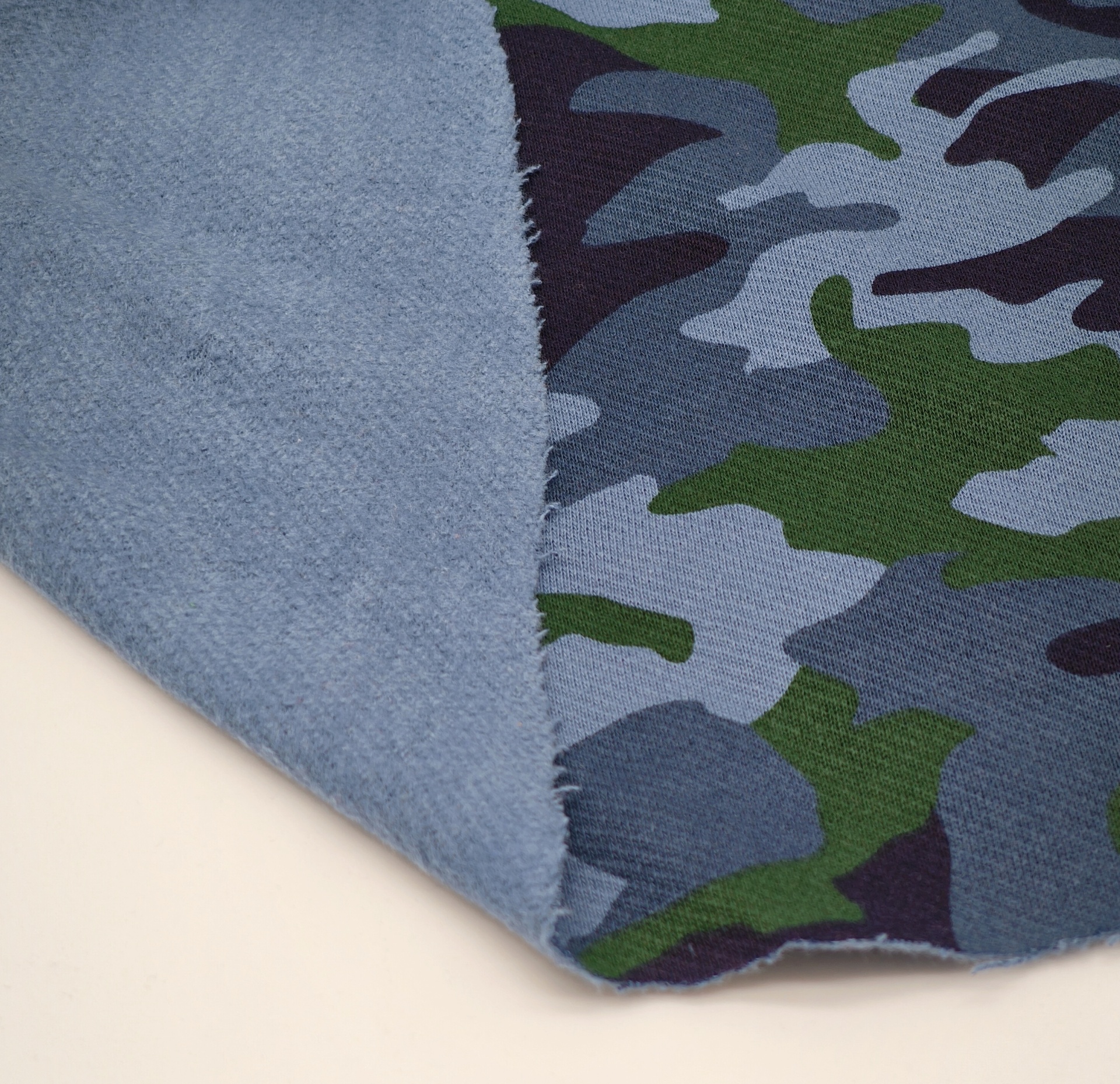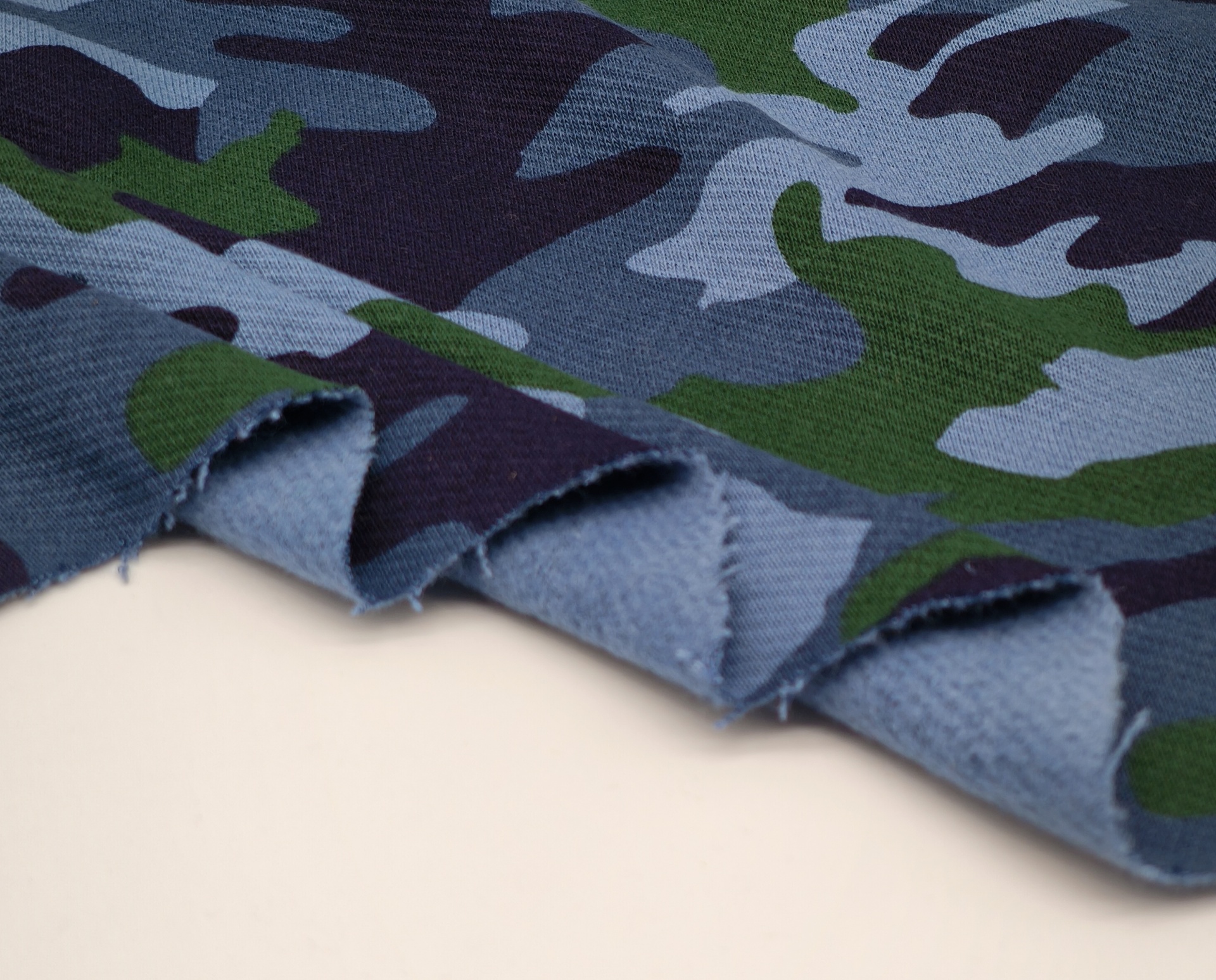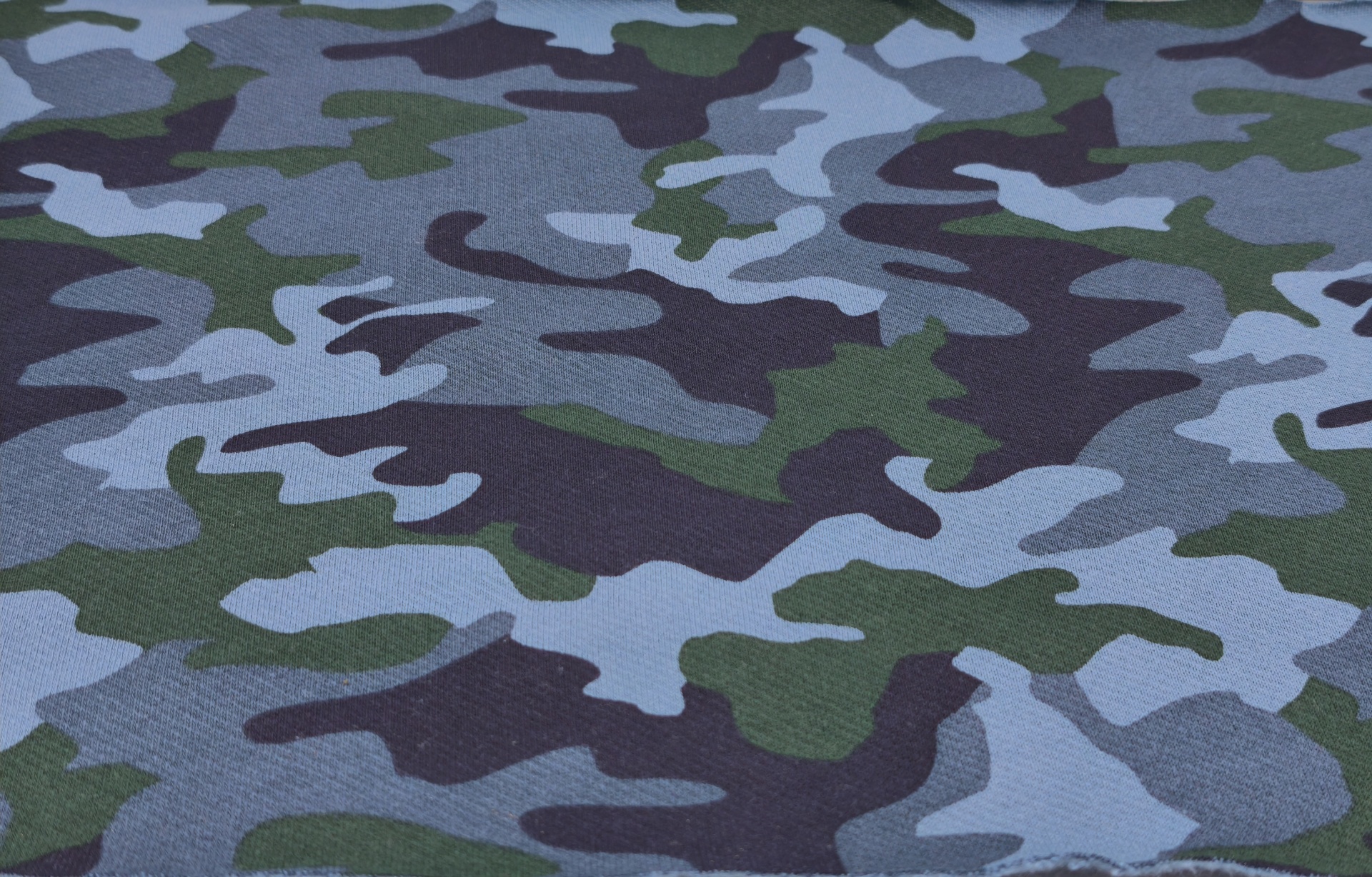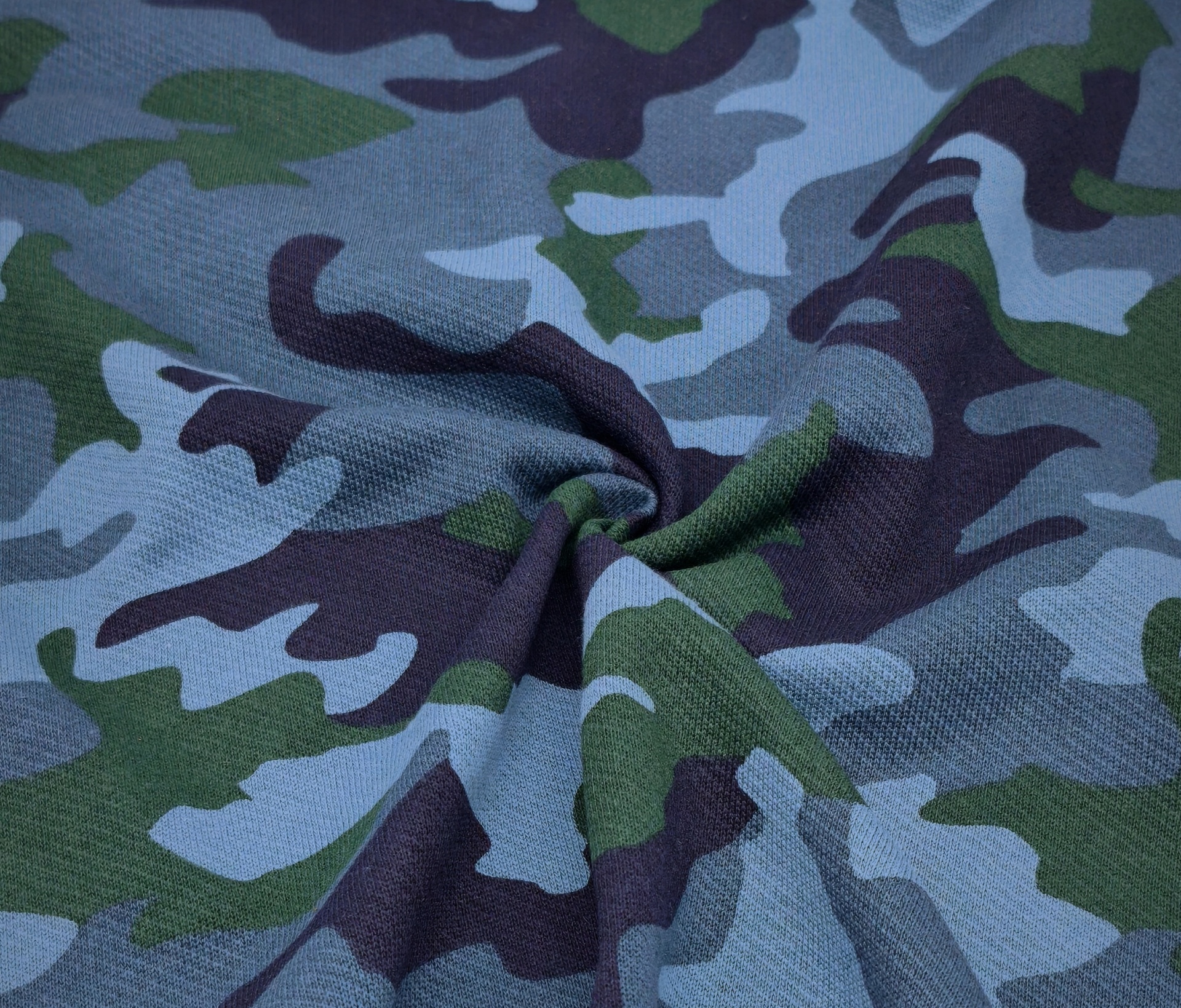 Malha padrão militar em tons azuis, verde, marinho quentinha, macia, maleável, cores opacas, sem brilho, sem elasticidade