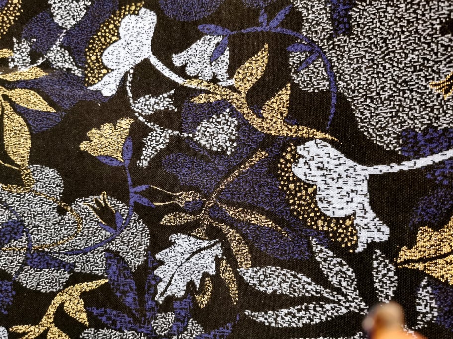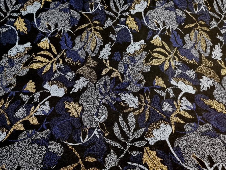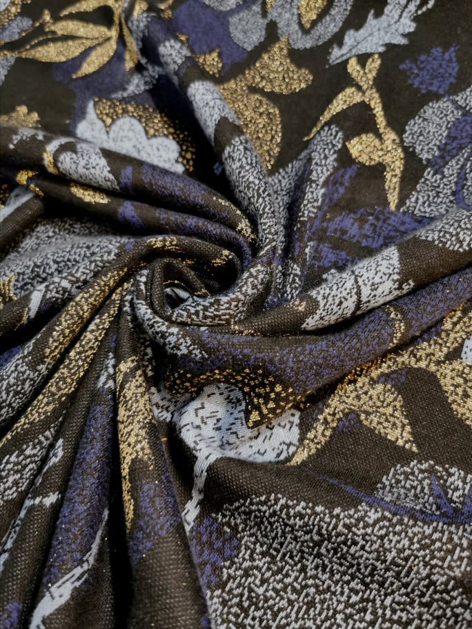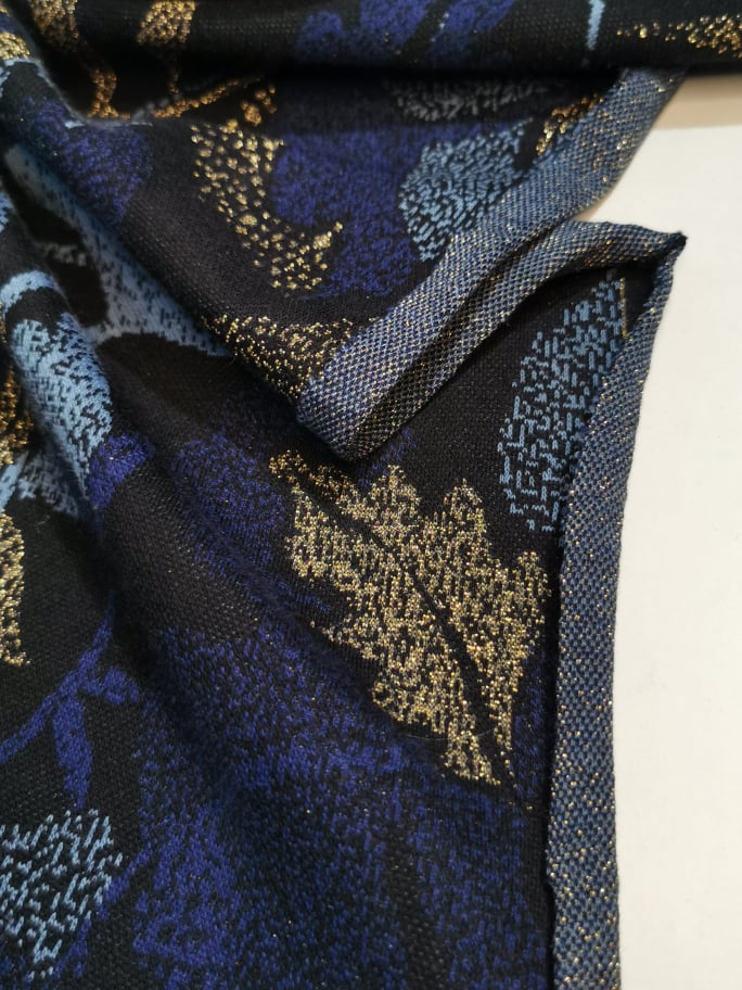 Malha nos tons azuis, preto e brilho dourado, bastante confortável, macia, maleável, bom caimento