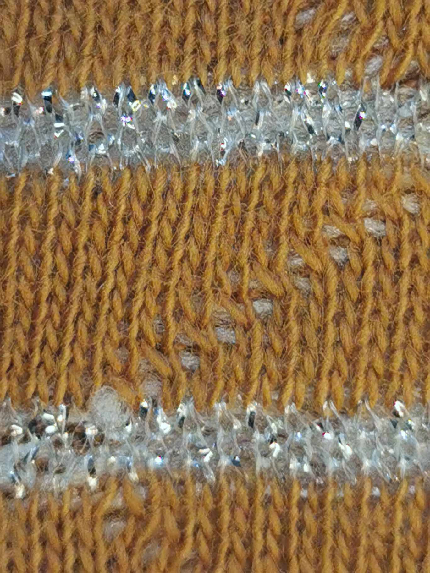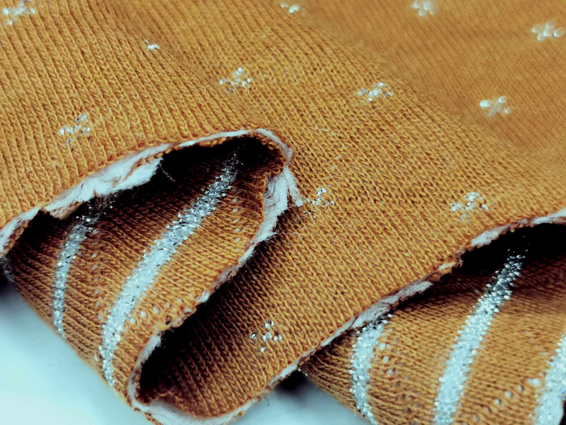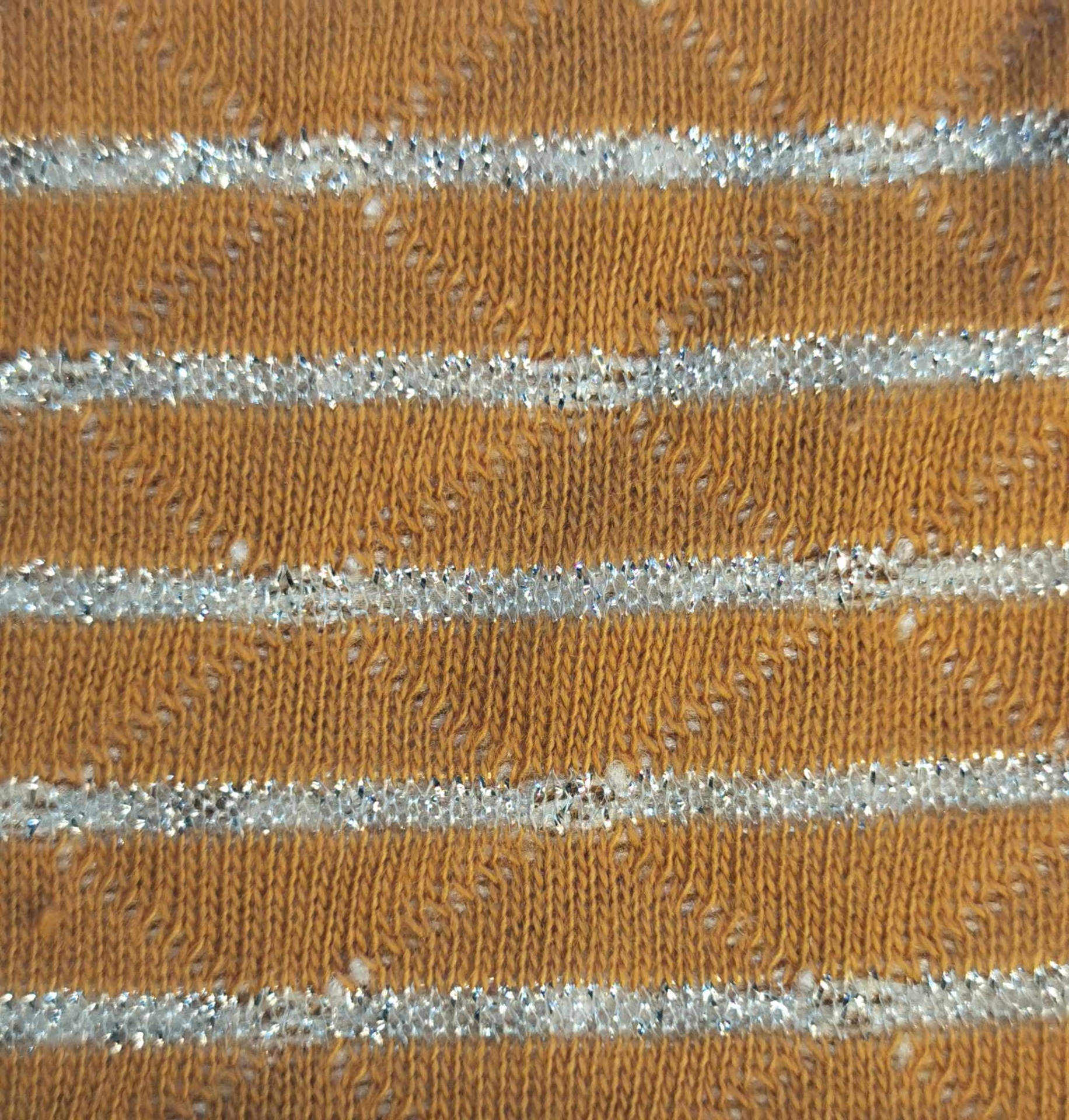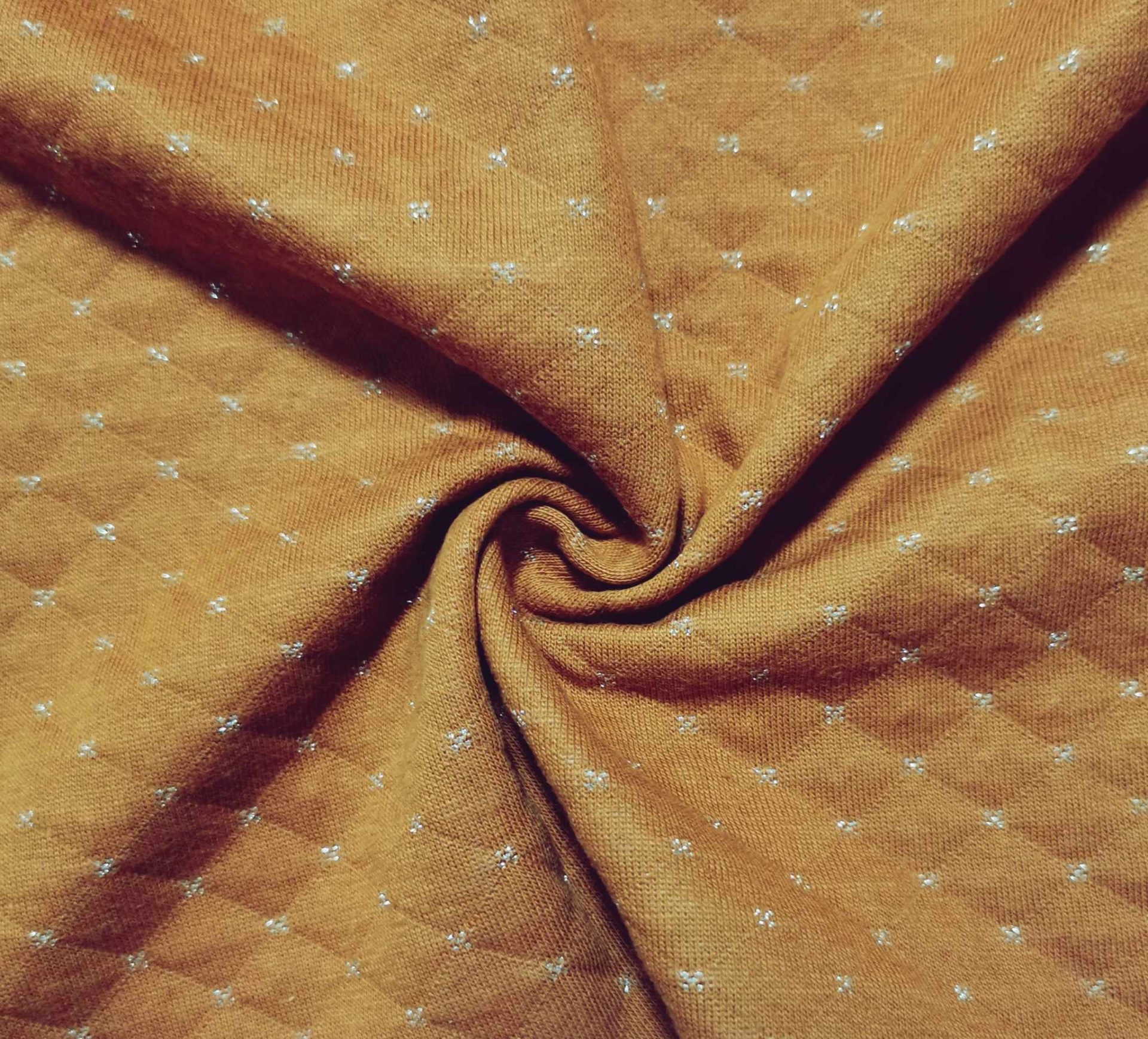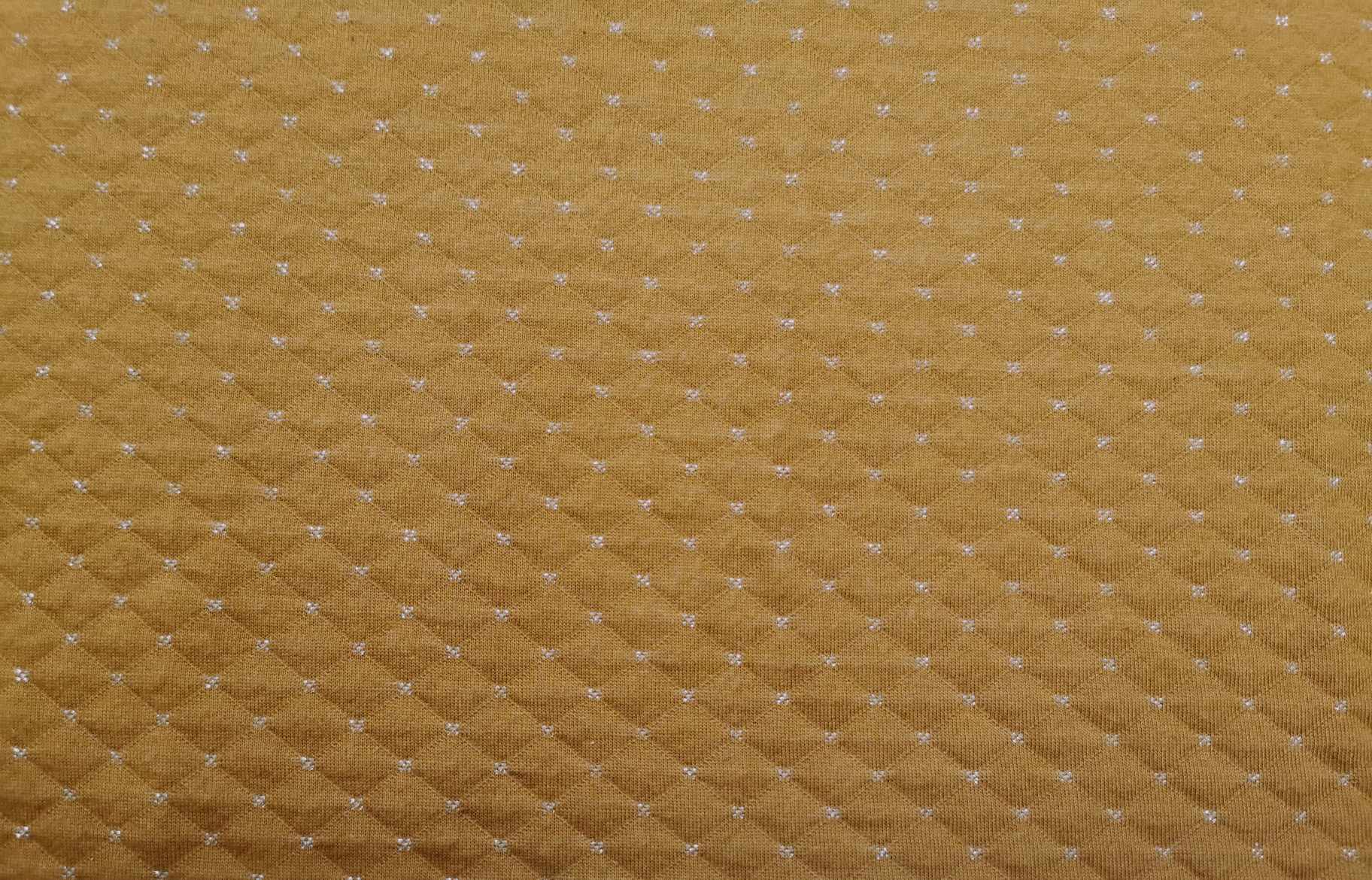 Malha acolchoado de face dupla no tom caramelo e brilho prata, a malha apresenta de um dos lados listras na horizontal em lurex prata e do outro lado pequenos pontos em cruz com lurex prata