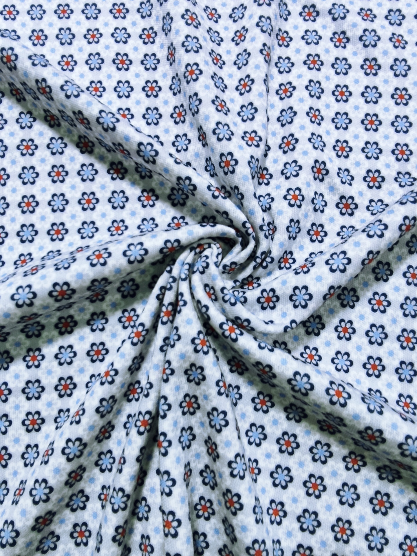 Fundo em tom azul clarinho com padrão de pequenas flores em tom azul marinho e branco com pequenos pontos em vermelho e azul vermelho