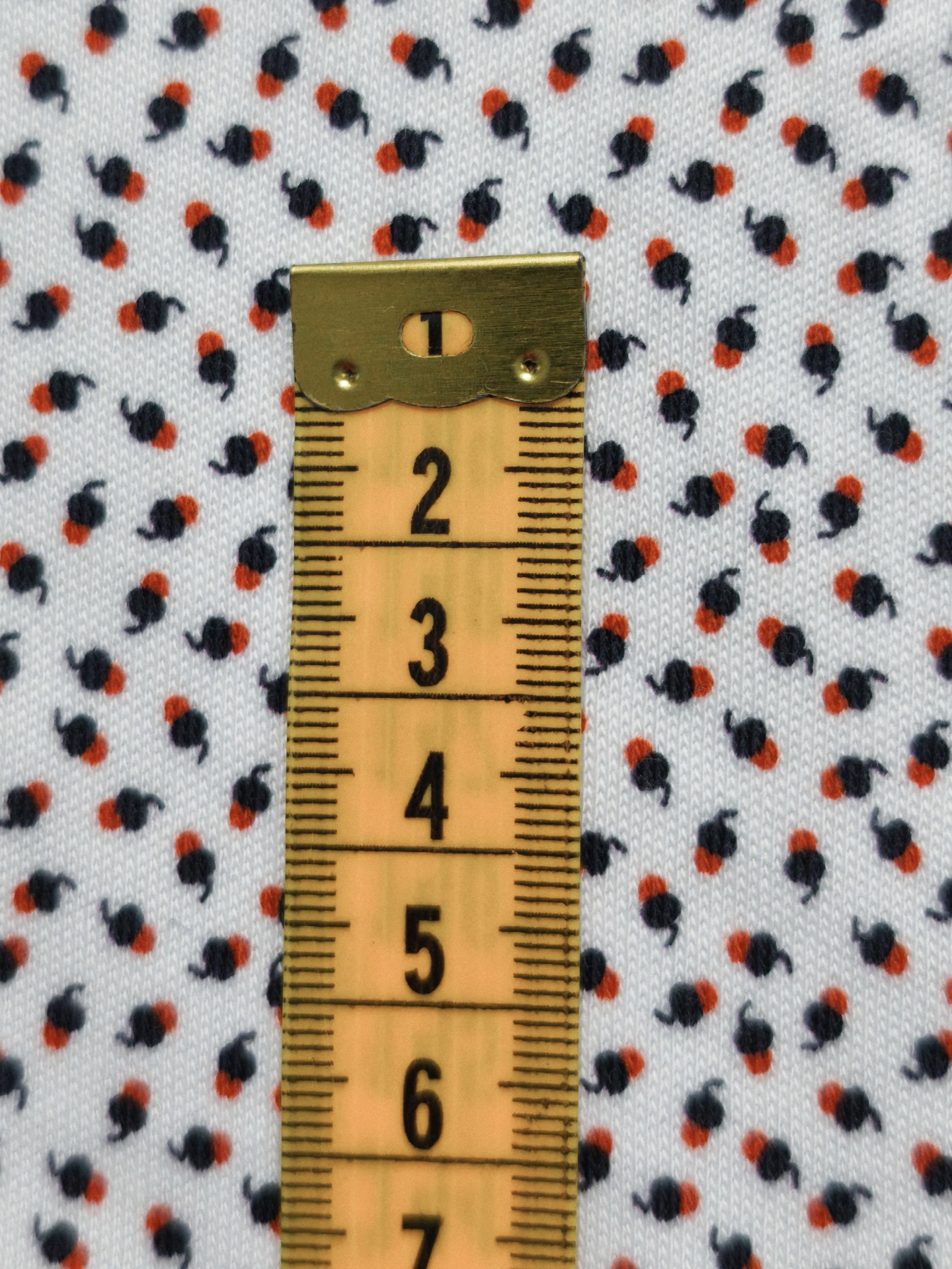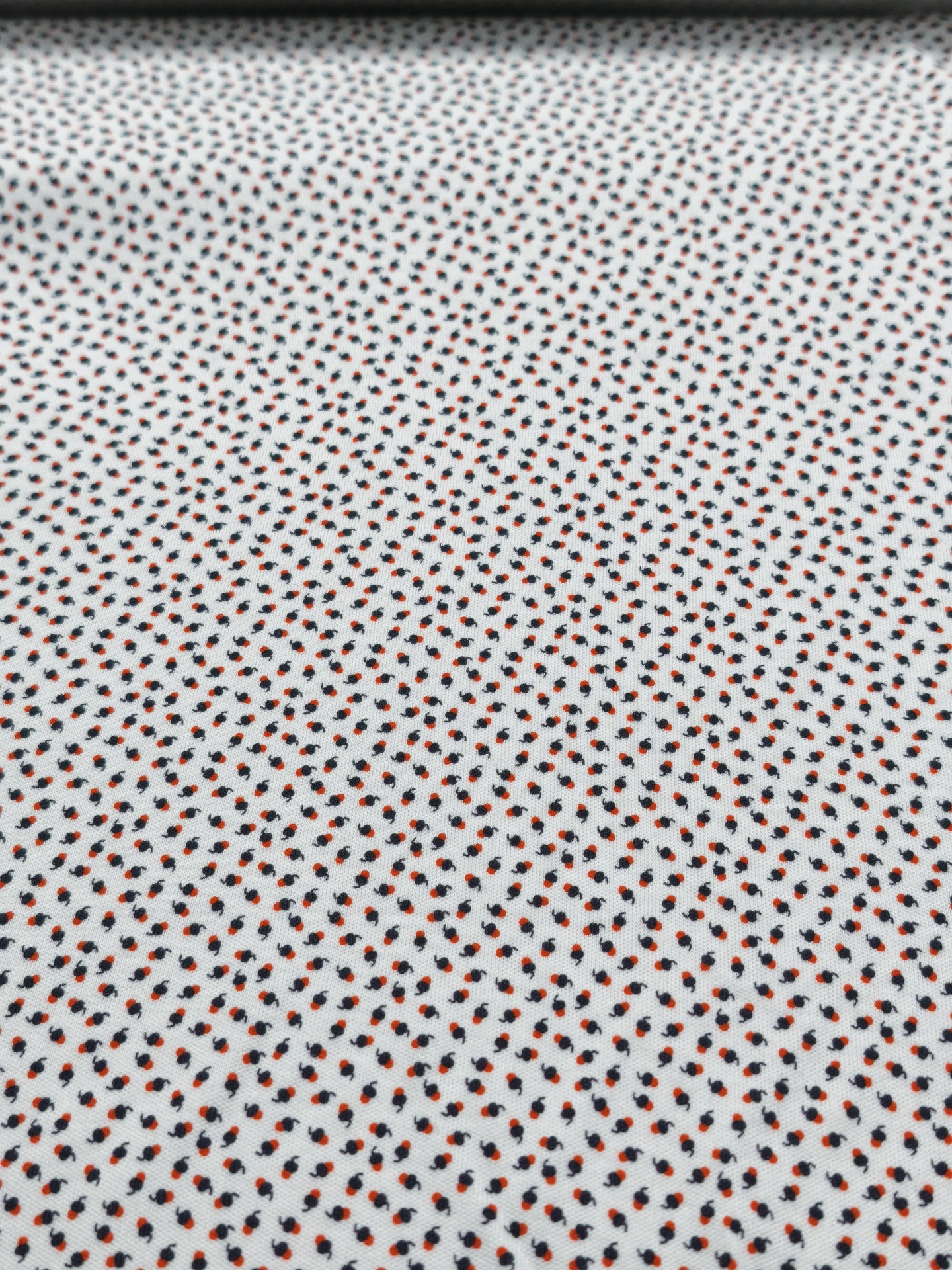 Fundo em tom branco e pequenas desenhos em tom azul escuro e vermelho