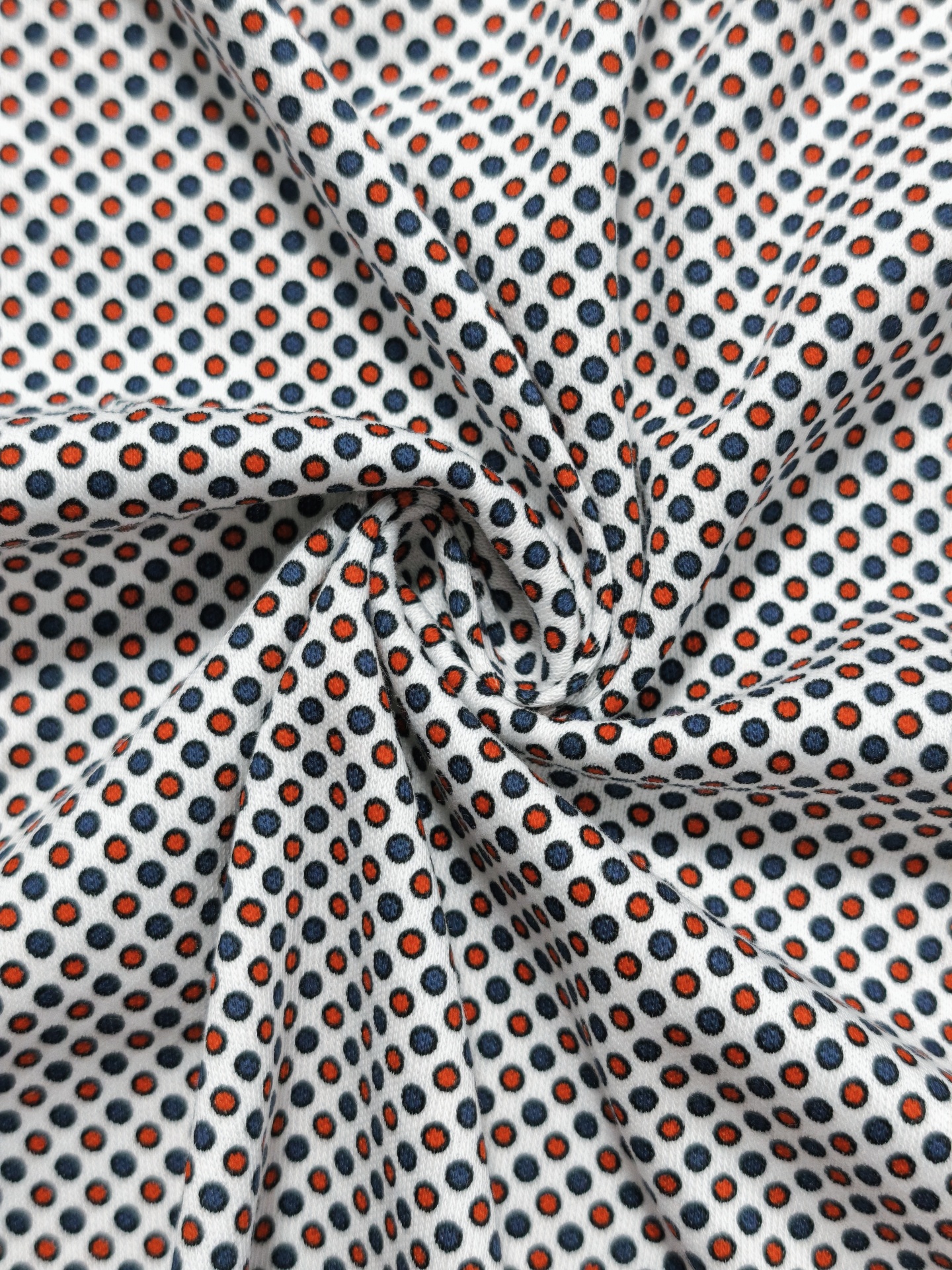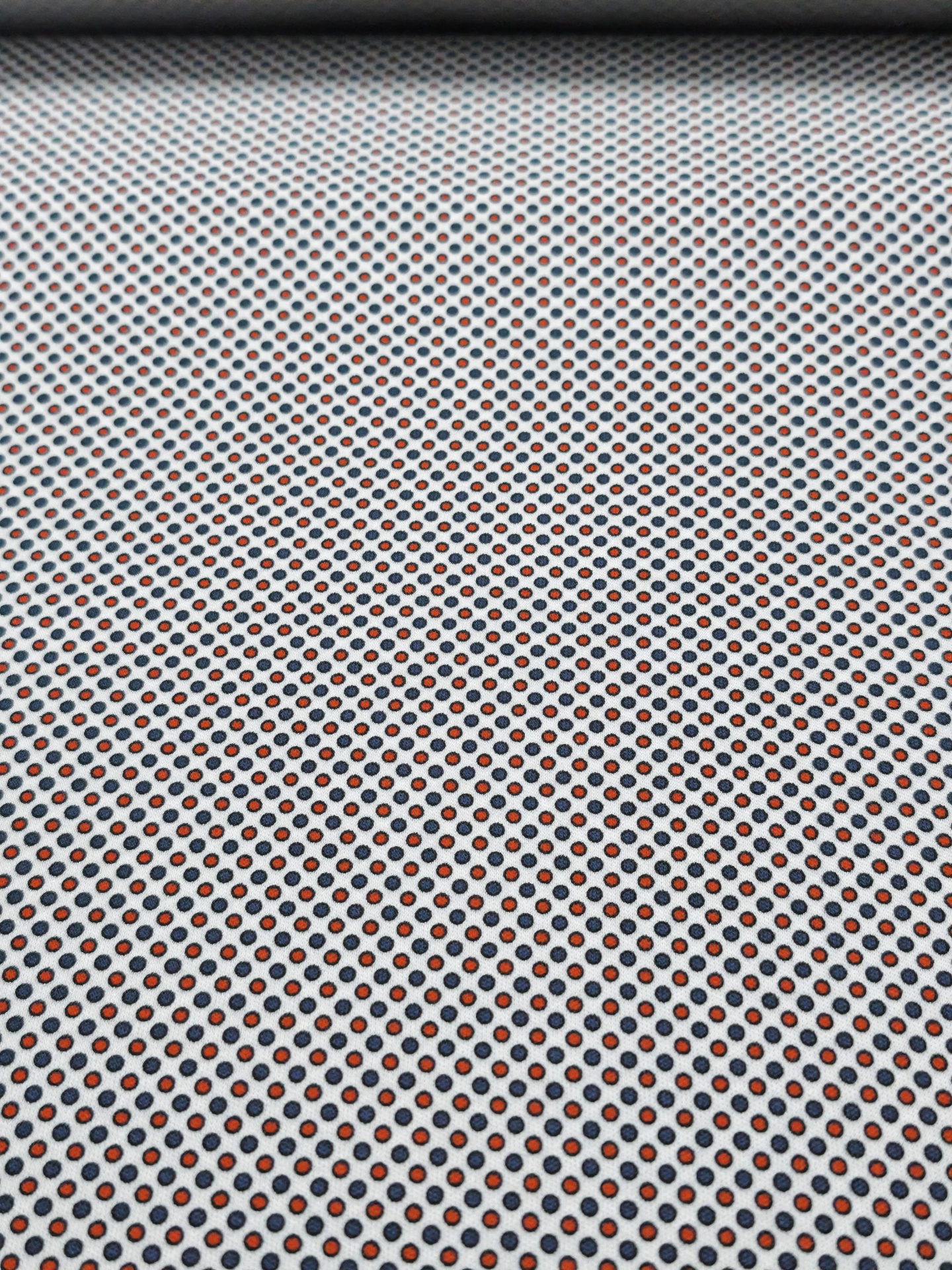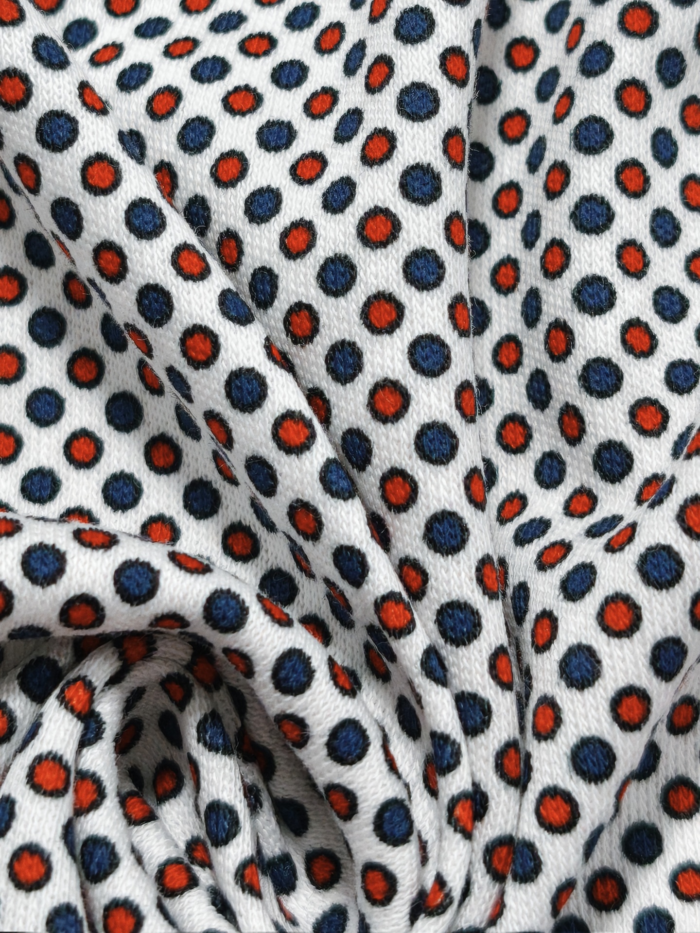 Fundo em tom branco e pequenas bolas com contorno preto e interior em vermelho e azul escuro
