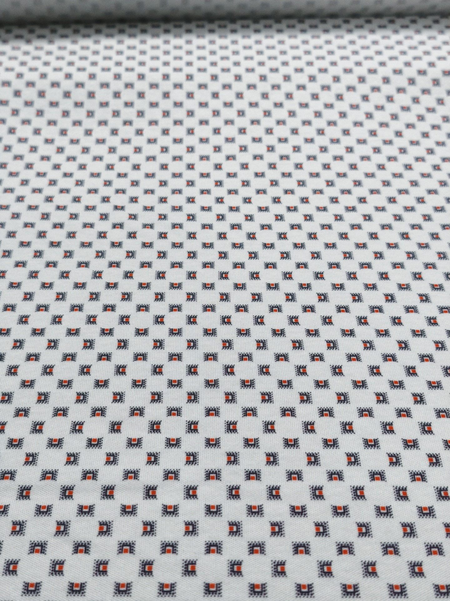 Fundo em tom branco e pequenas desenhos em tom azul escuro e vermelho