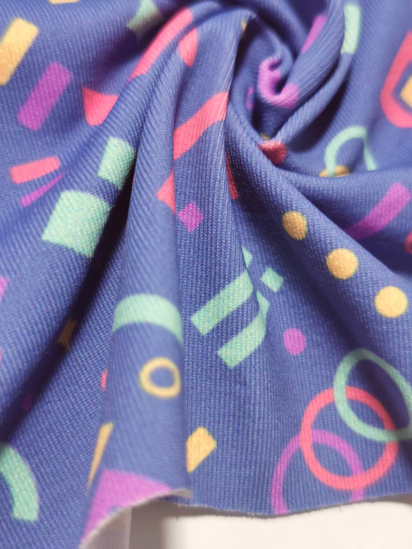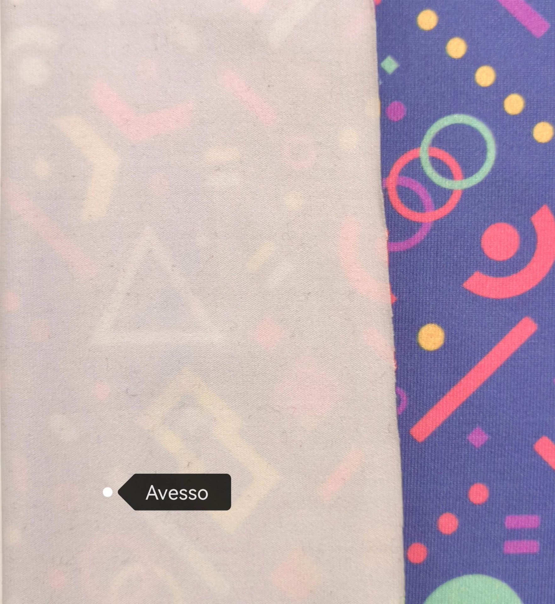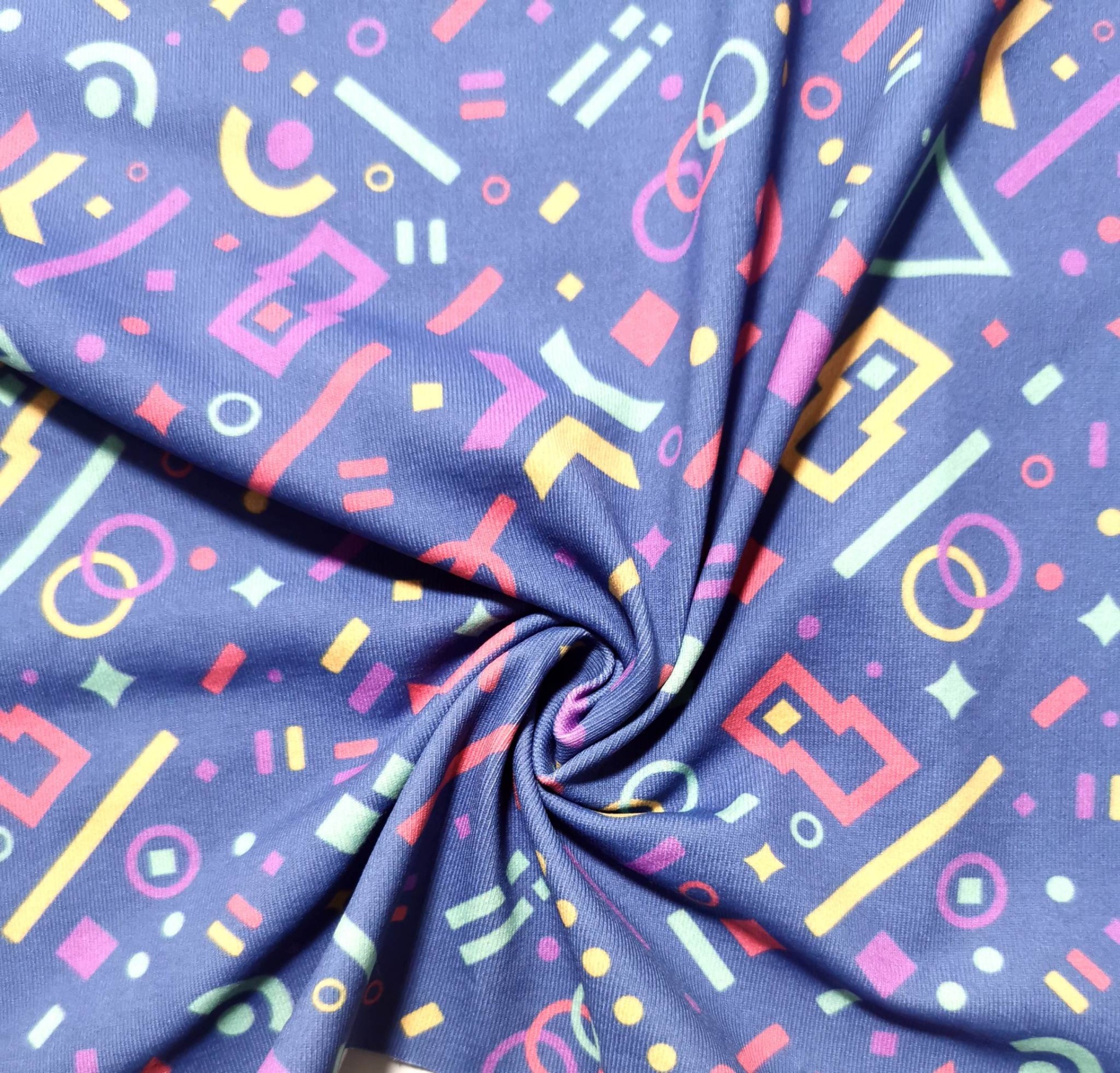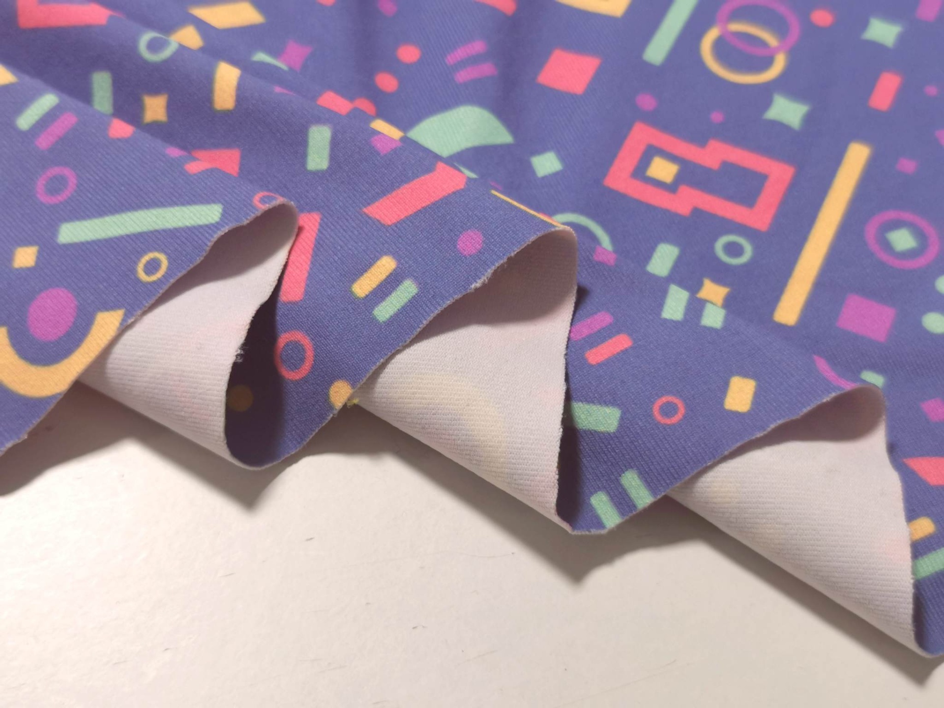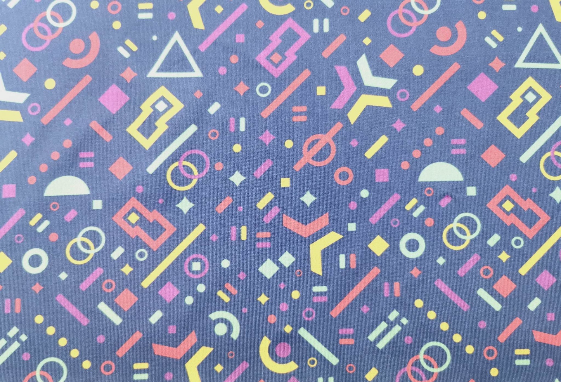 Malha licra em tom base lilás com figuras geometricas em vários tons