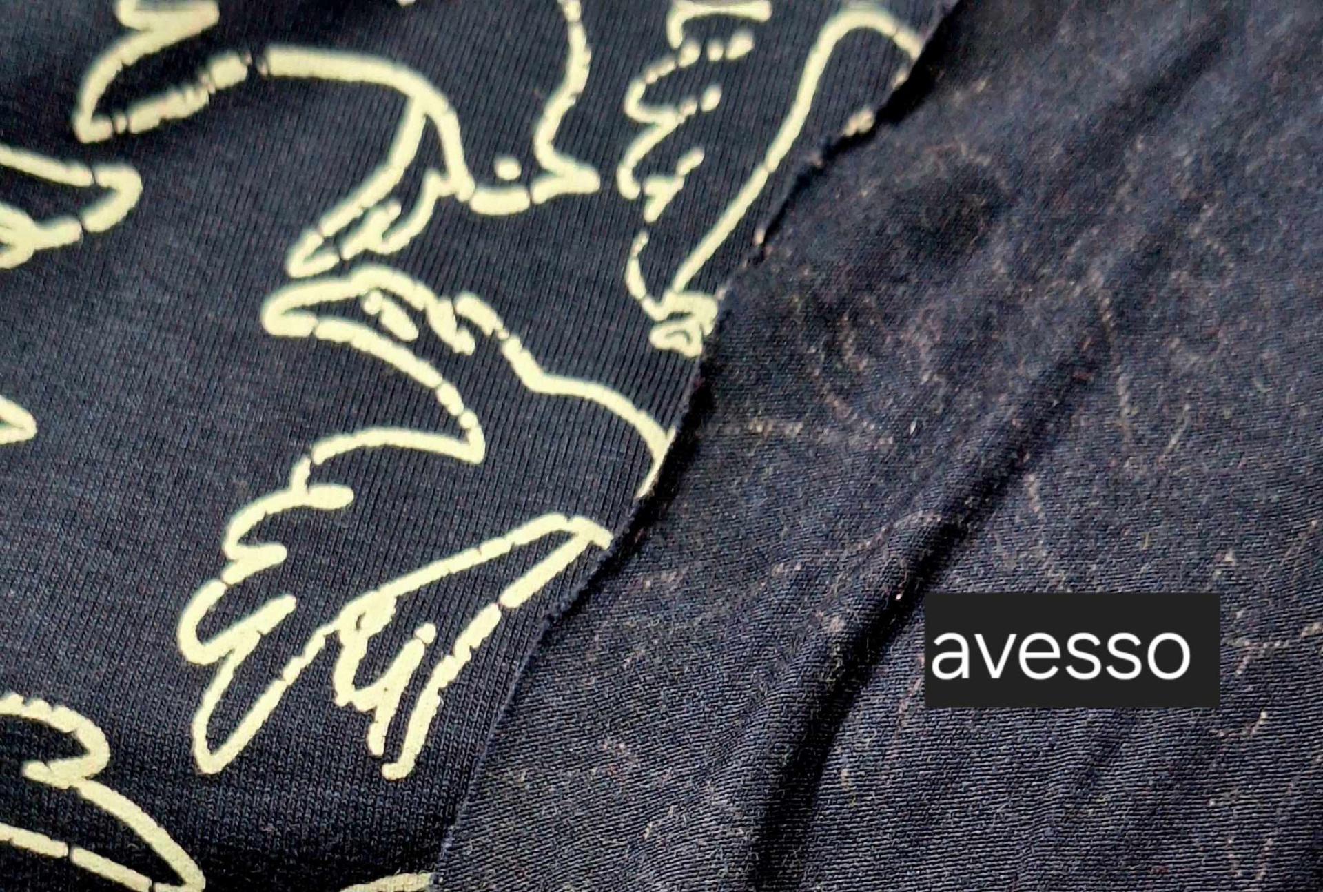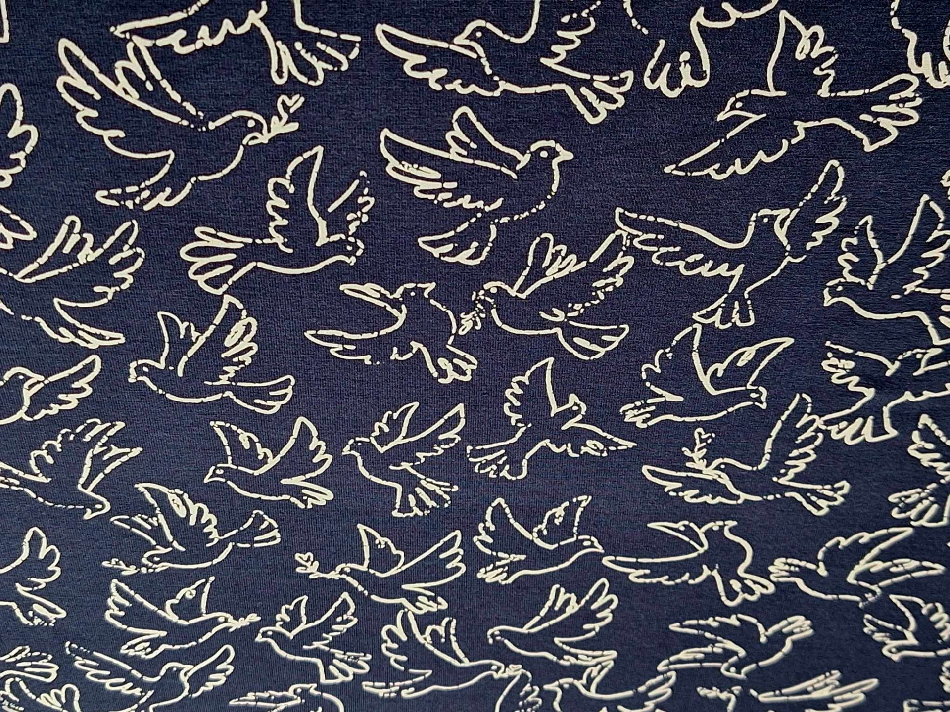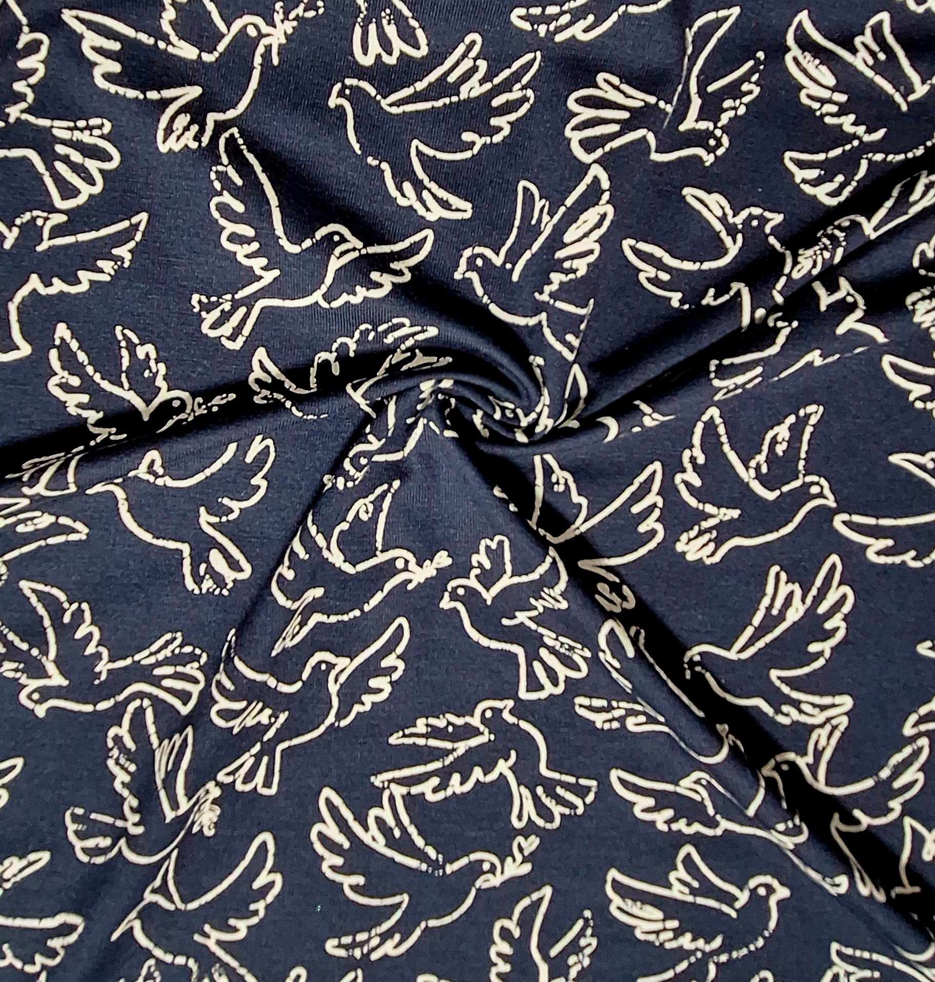 Malha Jersey fresca de tom marinho com estampado de pombas em tom branco, muito boa elasticidade e caimento  e toque muito agradável...