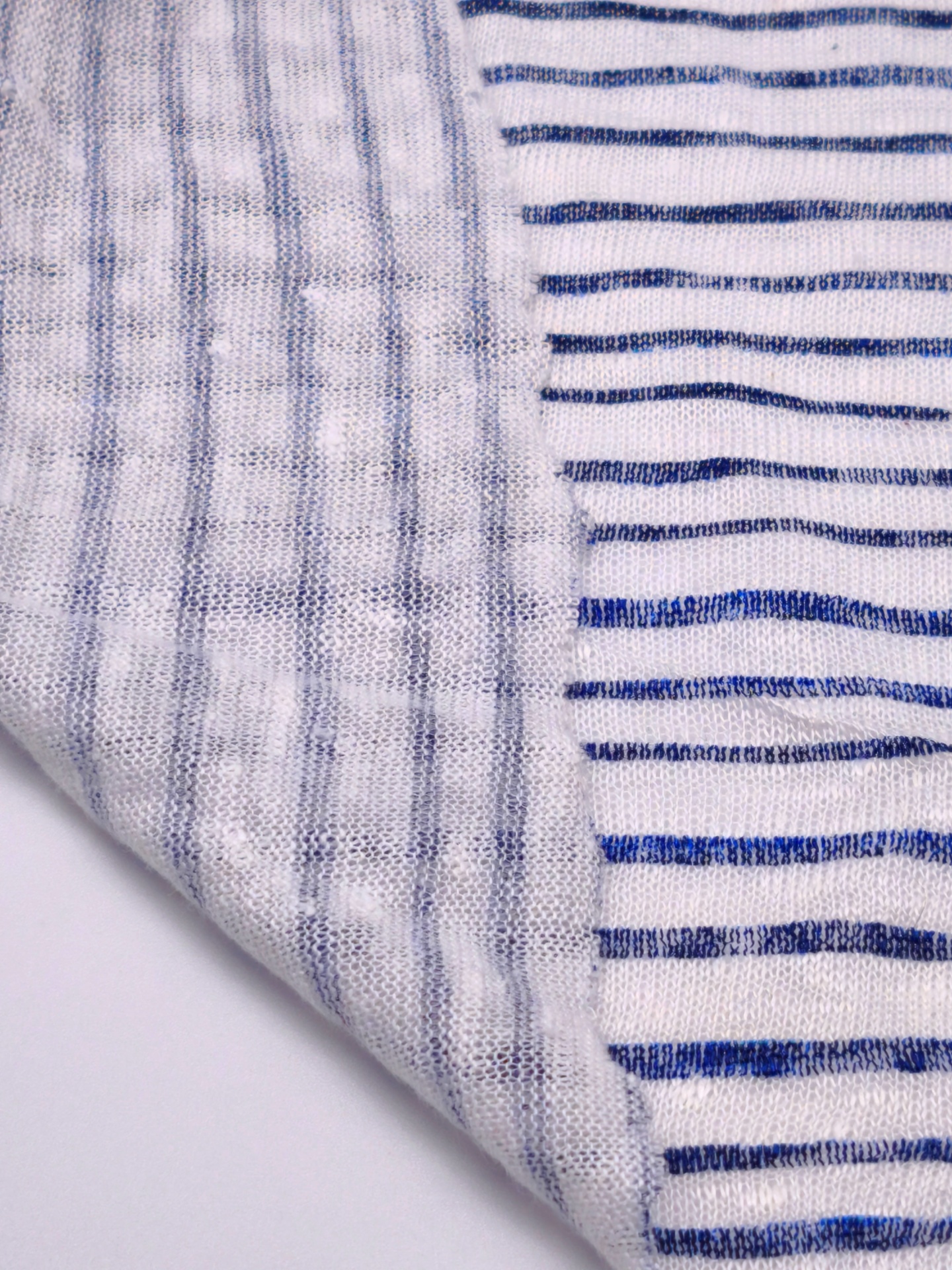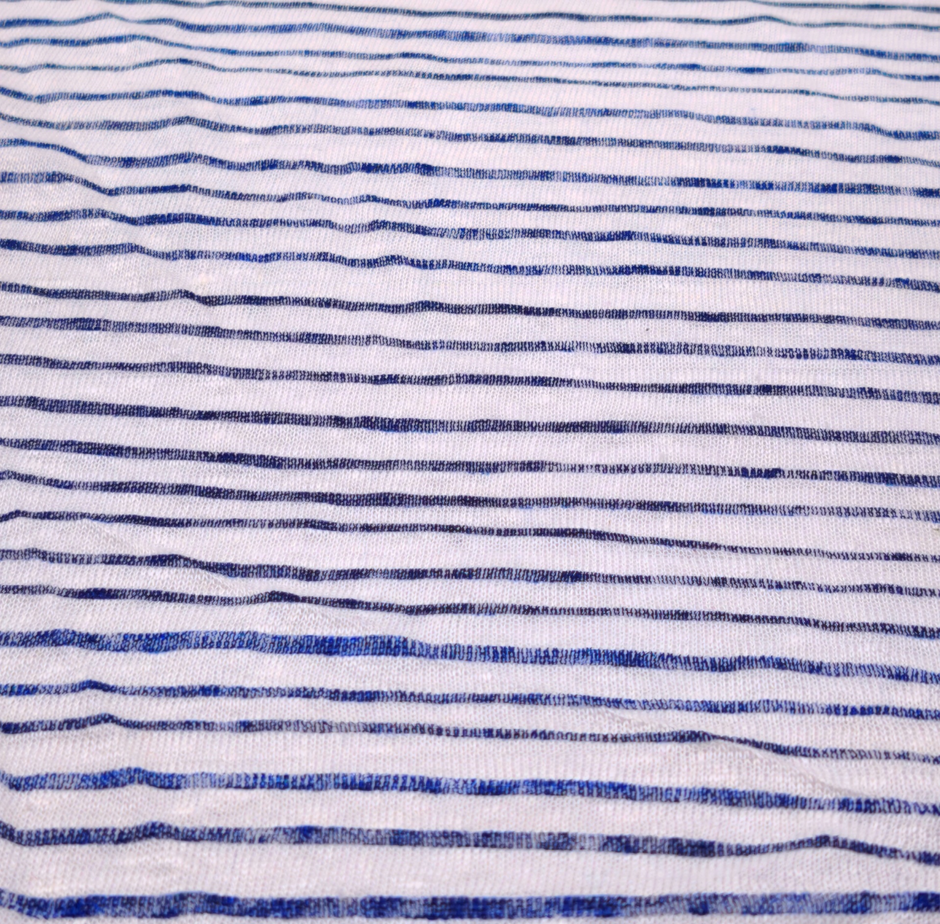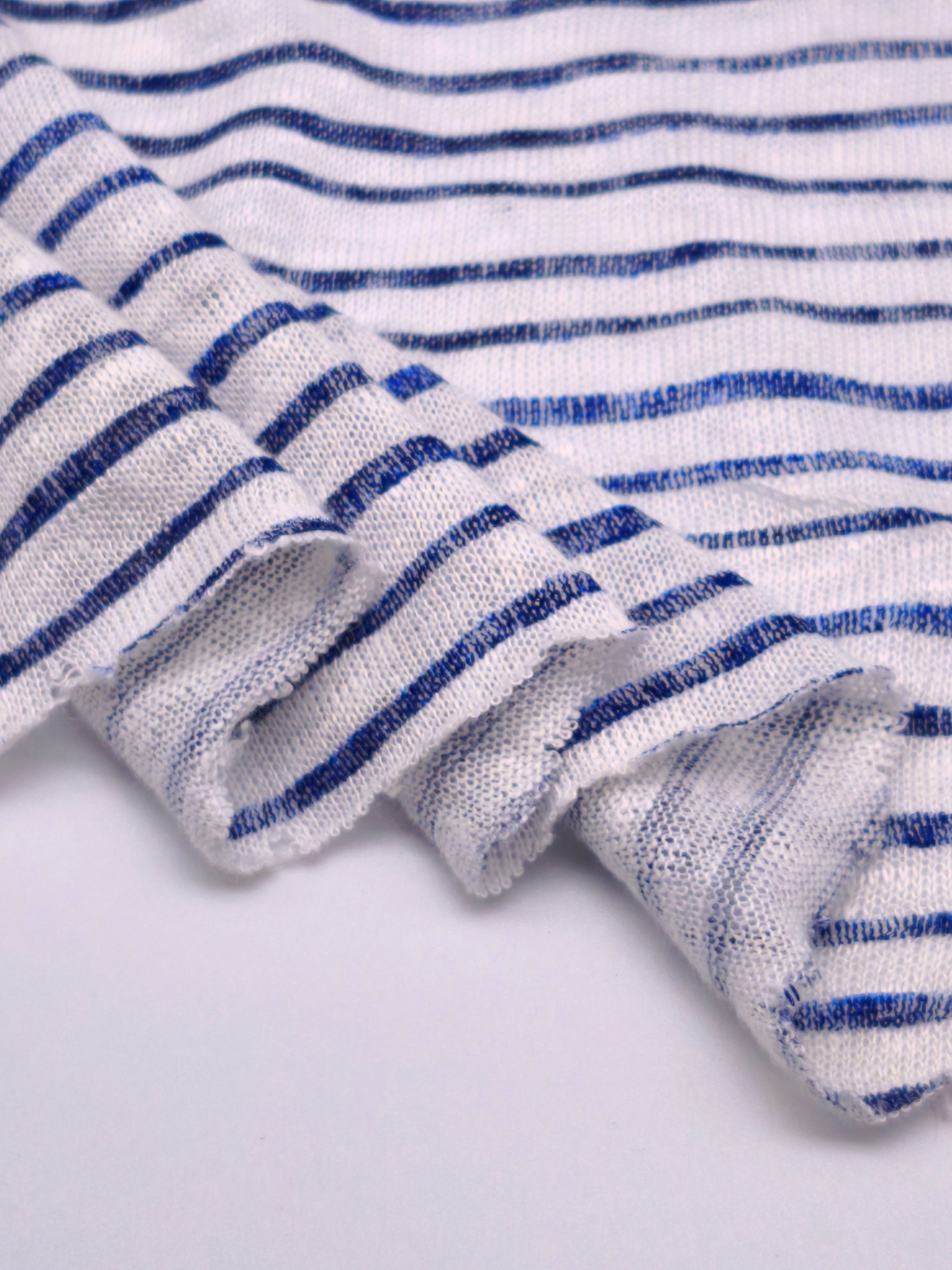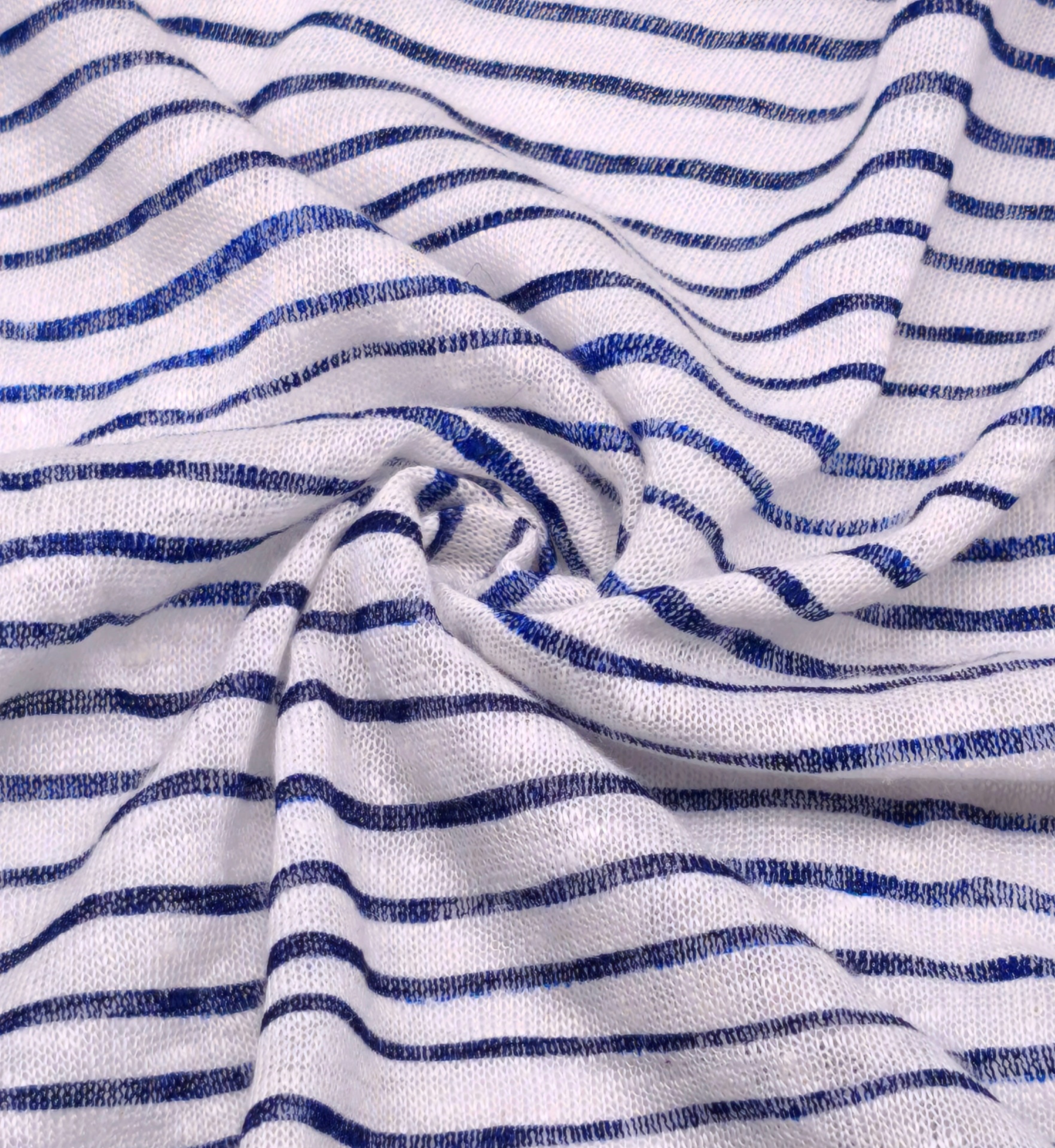 Malha de tom base branca com listras finas nos tons azul e azul marinho